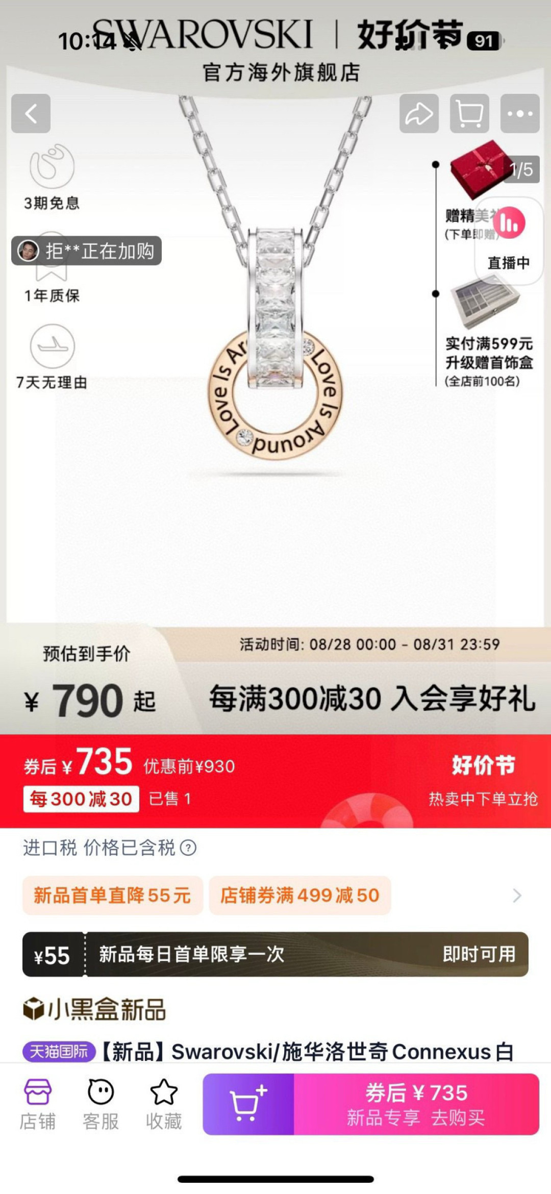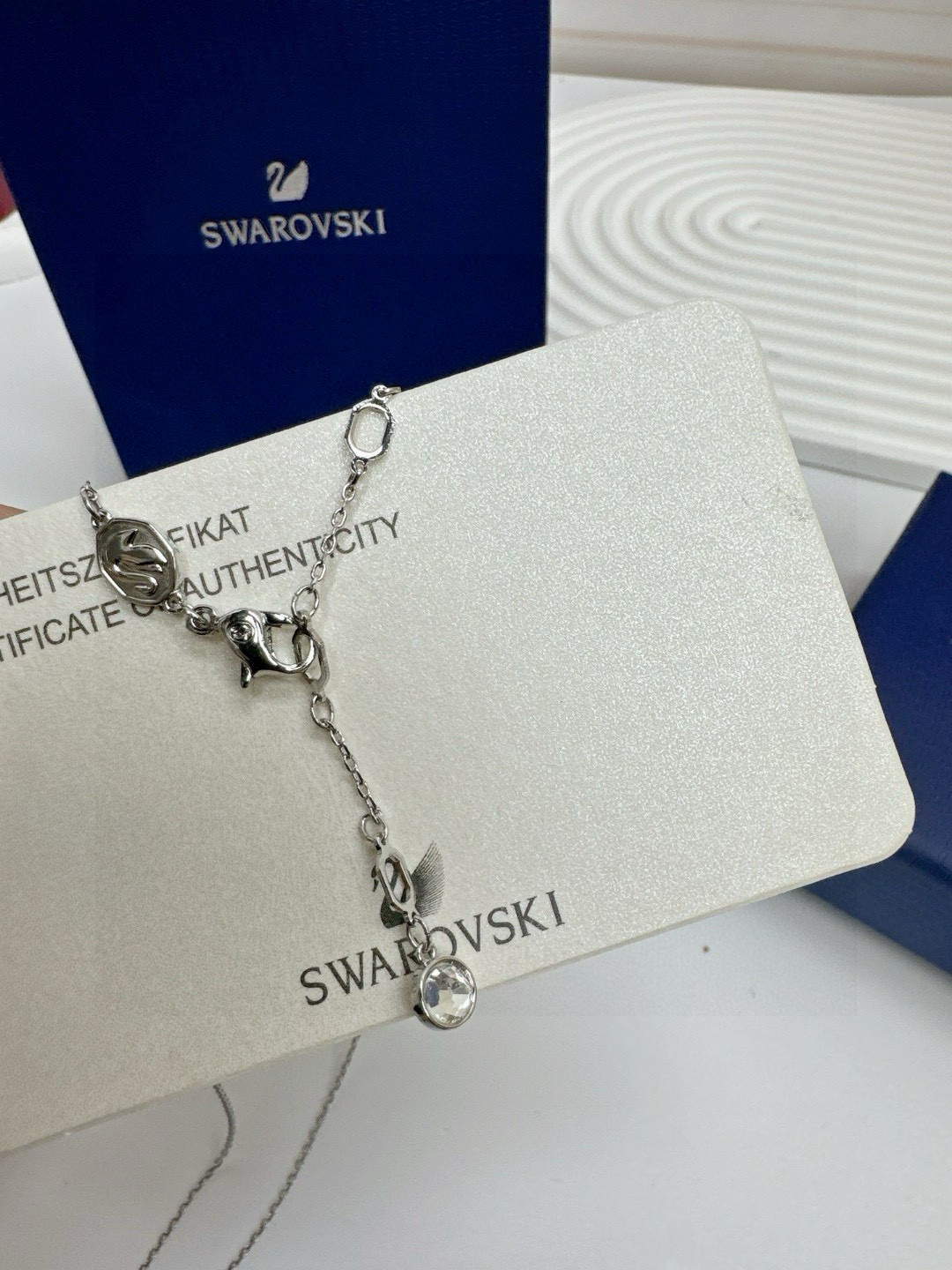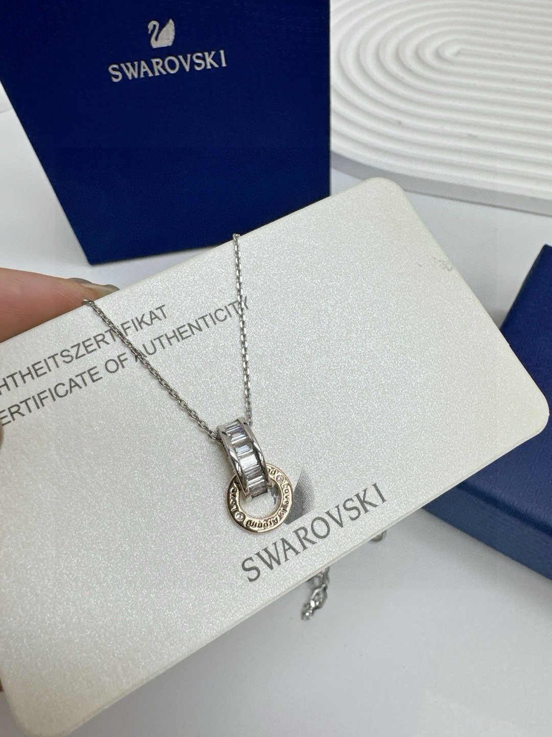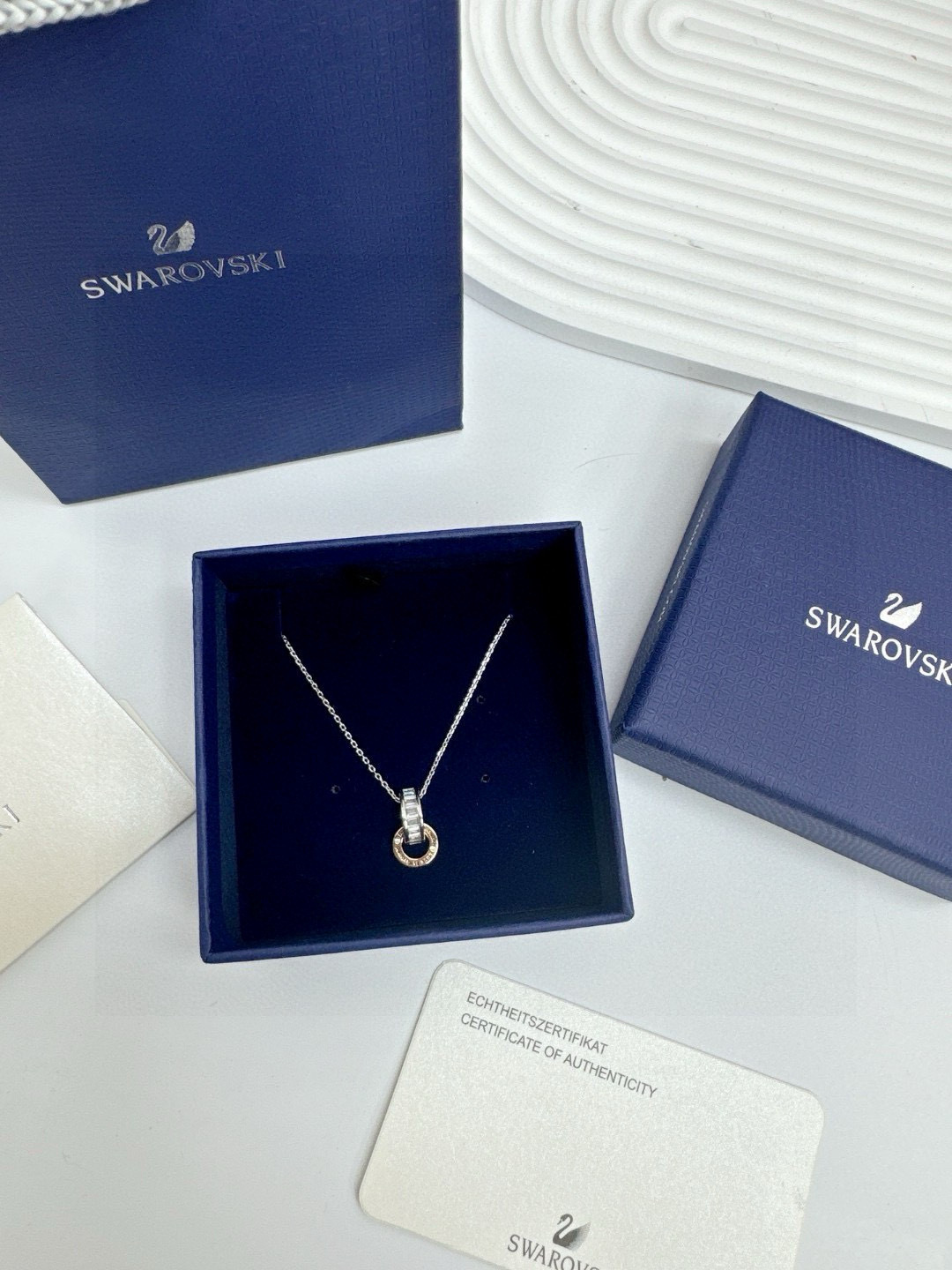 所见所得高品质礼盒全套施华洛世奇Connexus 项链全套包装 专柜700 这款Connexus 链坠别具意义 散发出浪漫气息 这款设计悬挂在带龙虾扣的镀铑链条上 饰有透明长方形切割施华洛世奇立方氧化错的镀铑半圆环 刻有 Love is around 爱在身边 字样