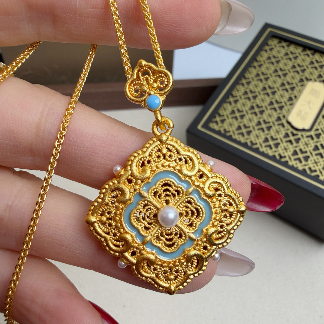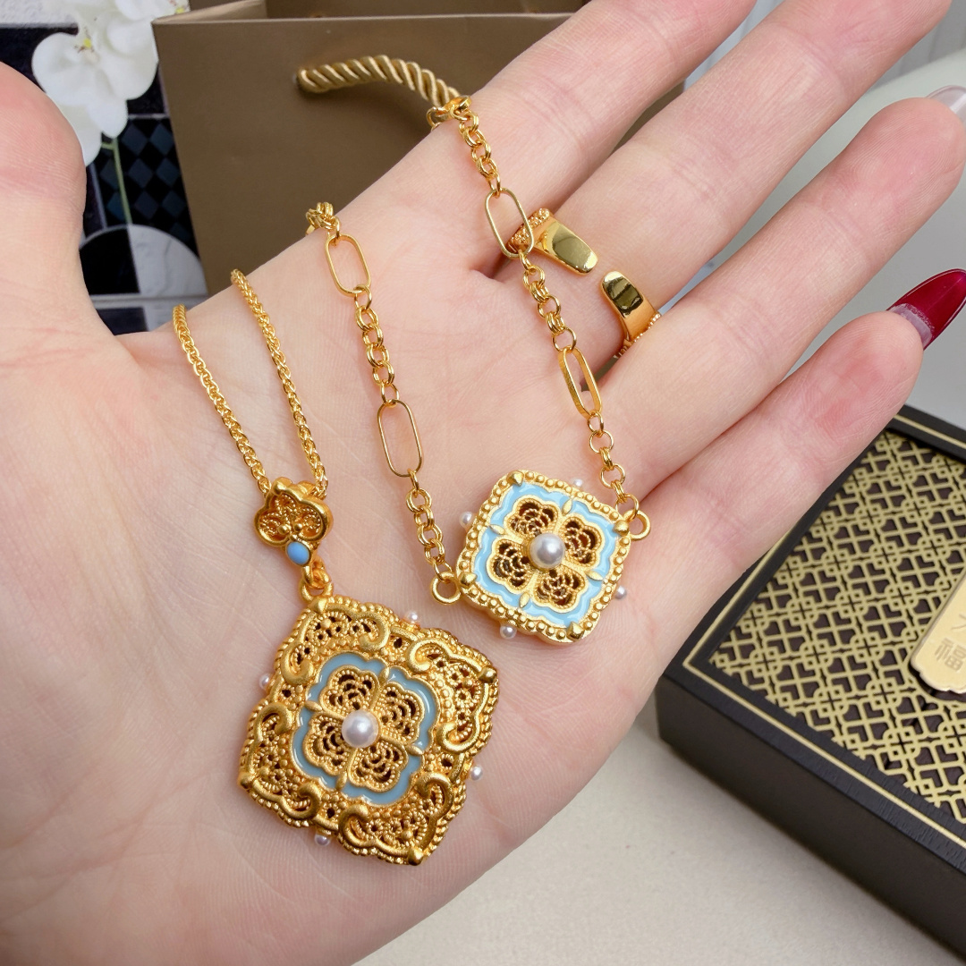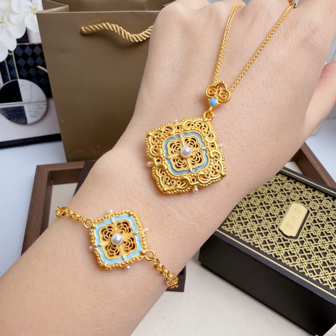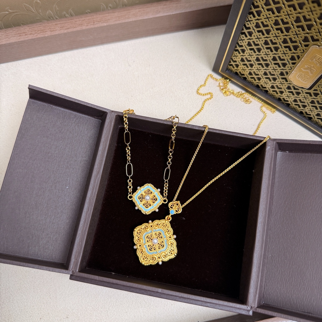 所见所得高品质礼盒全套 周大福四合如意点翠花丝项链手链套装 全套传承礼盒包装 把故宫美学戴在身上这一套四合如意项链手链 以故宫馆藏文物为灵感 用非遗花丝 点翠工艺复刻皇家美学 采用传统 四合如意 纹样 四朵花瓣围绕中心宝珠 寓意四方聚福 圆满顺遂 中心嵌一颗温润珍珠 四周点缀细钻 让吉祥纹样多了一份灵动雅致