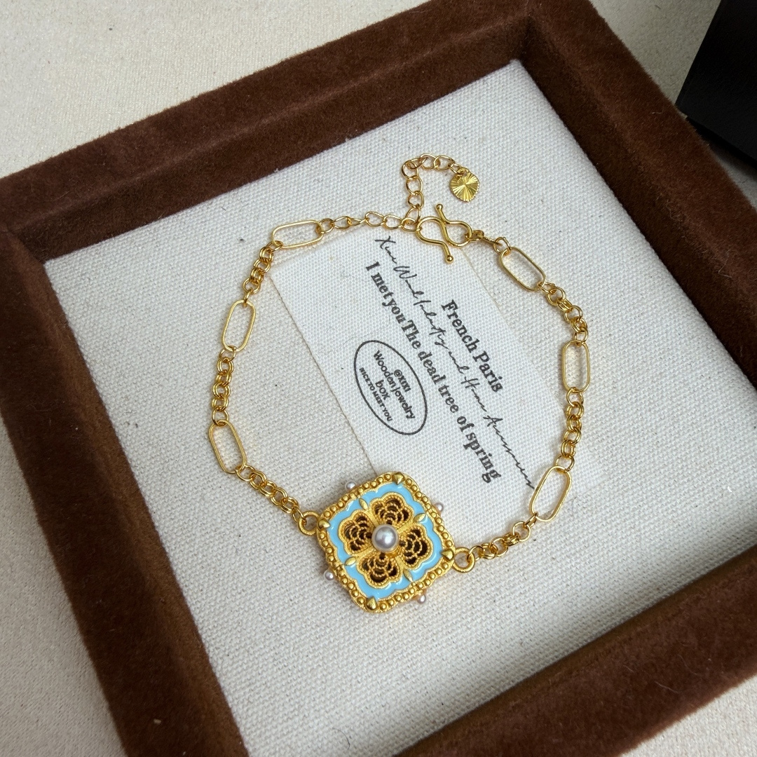镯身与牌身的浅蓝珐琅 还原宫廷点翠的清雅色泽 在黄金的衬托下更显温润华贵 边缘镶嵌的小金珠与珍珠相映成趣 让整体层次更丰富 抬手间流光溢彩
