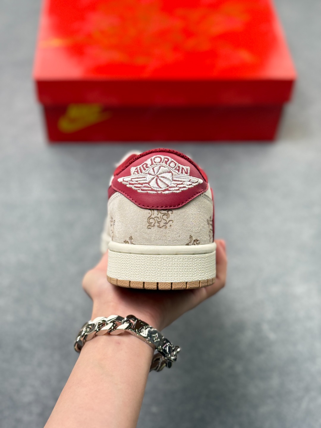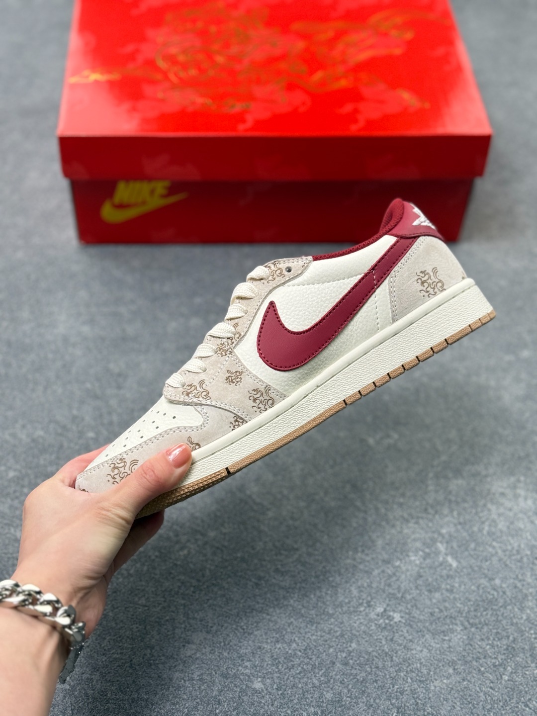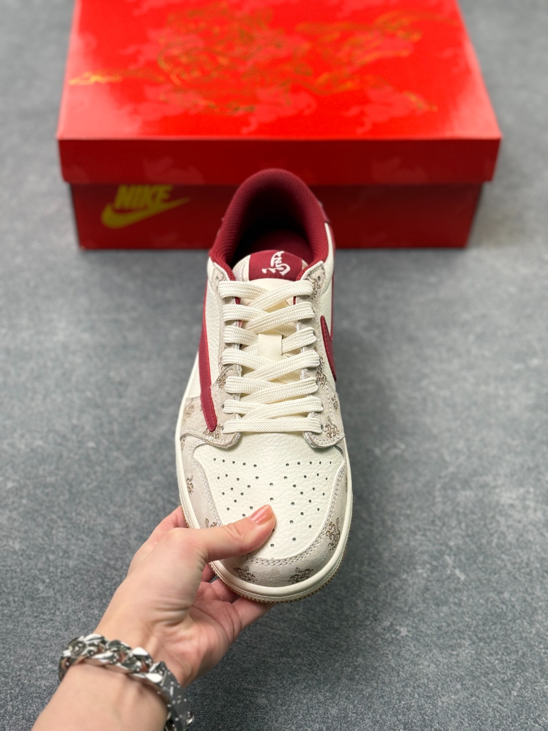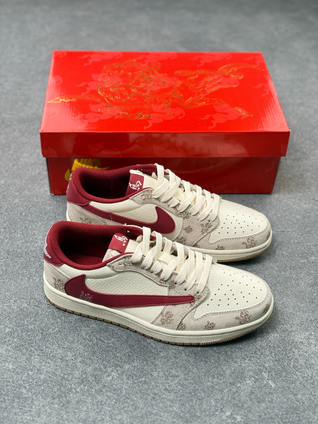 红丝绒酒红撞色米白的高级感谁懂啊 Travis Scott x Air Jordan 1 Low的新年定制款 鞋身的暗纹雕花直接把中式年味焊在鞋上 酒红勾子搭配生胶底 复古又显贵气 红金鞋盒更是仪式感拉满 过年上脚这双 走亲访友直接赢麻了