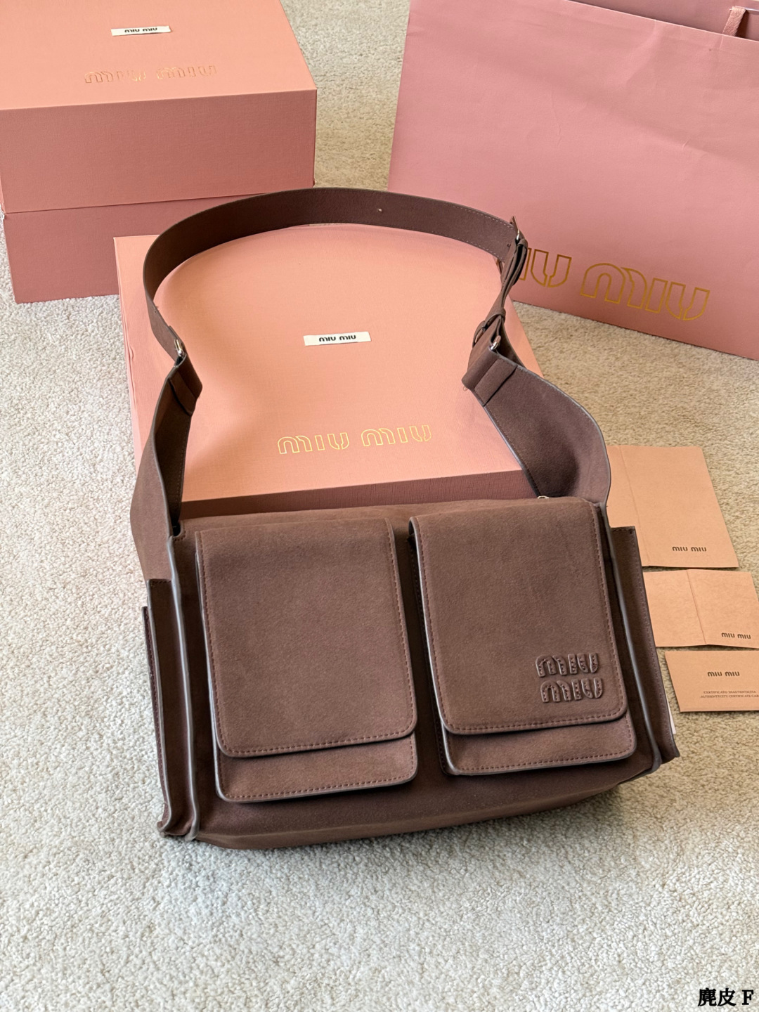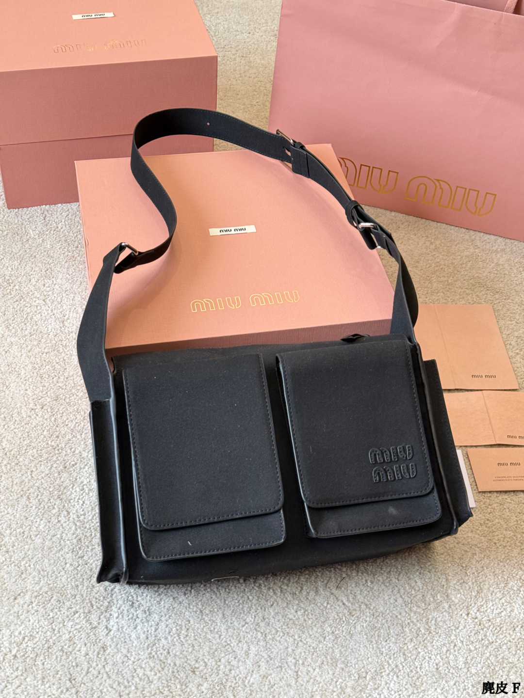 些Miu Miu 2026春夏系列麂皮邮差包 深棕磨砂麂皮 质感柔软低调高级 翻盖 拉链设计 正面双口袋 实用又时髦 肩带可调节 单肩斜挎都OK 通勤出街都能轻松驾驭 容量适中 日常物品轻松收纳 复古风格 麂皮材质 秋冬搭配超有氛围感 是实