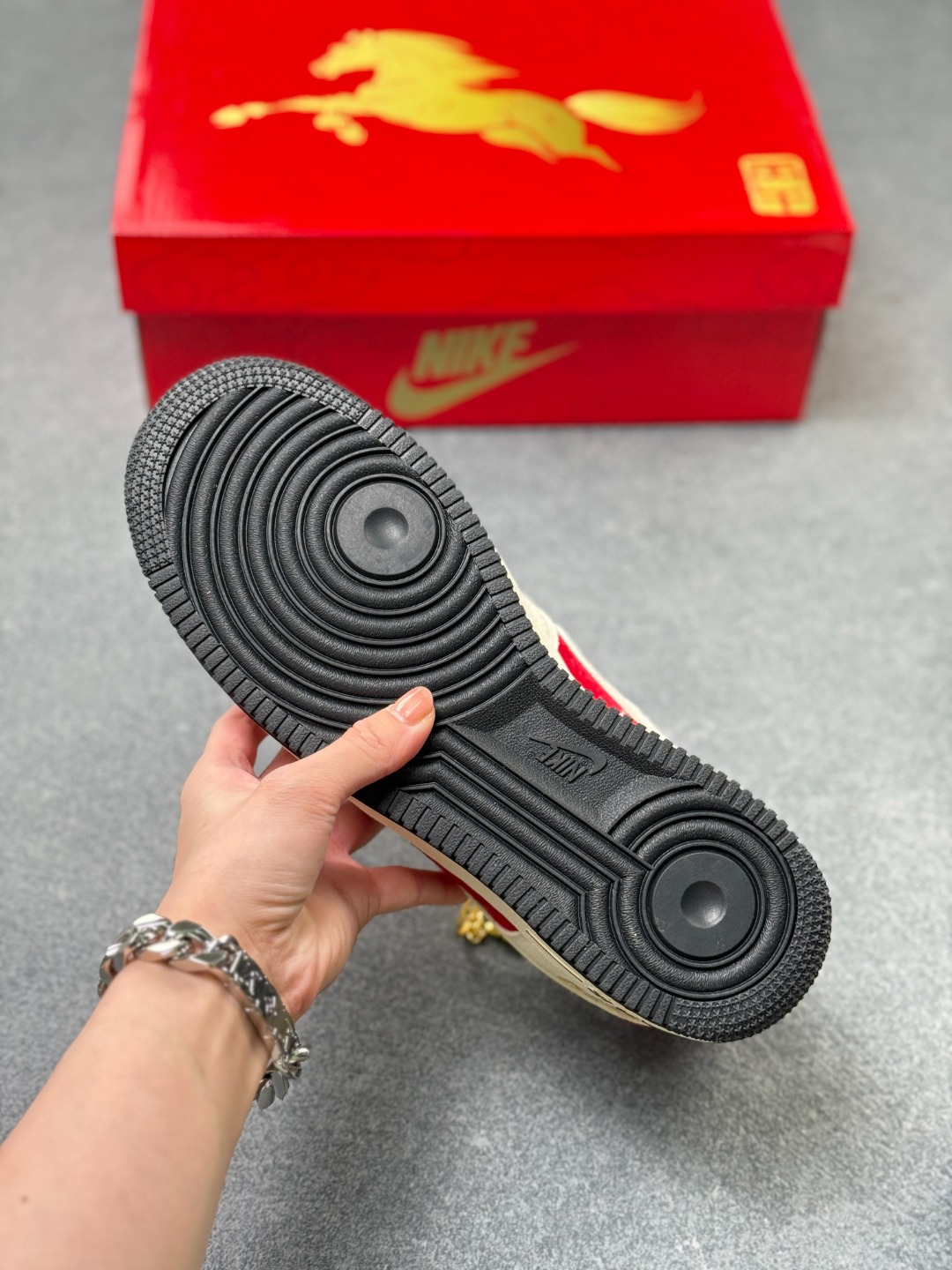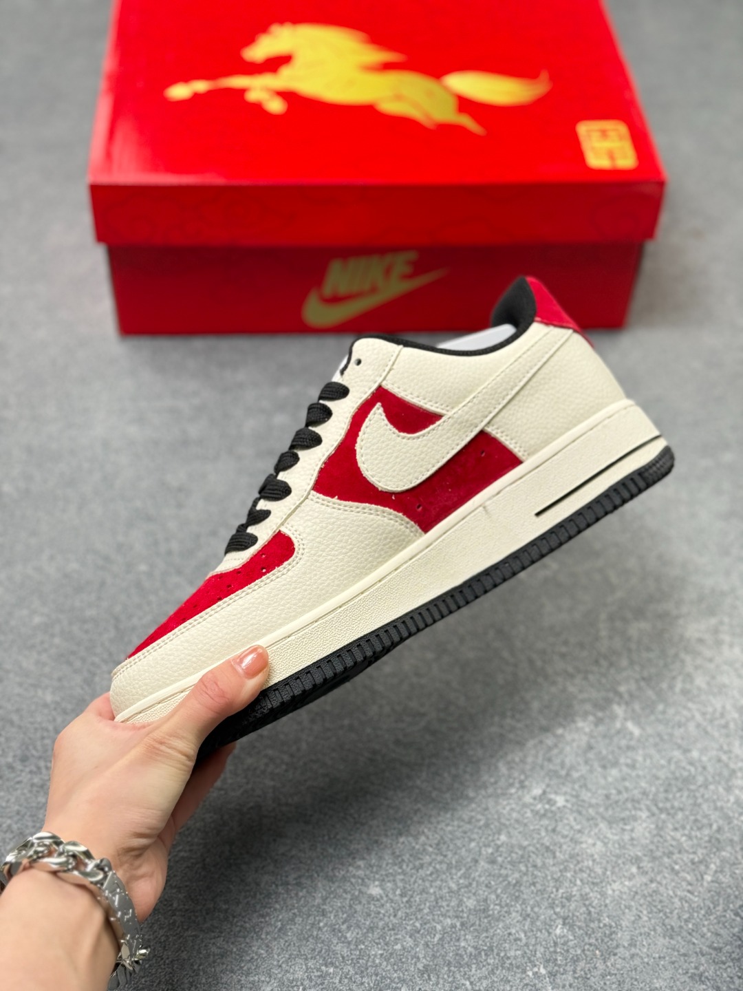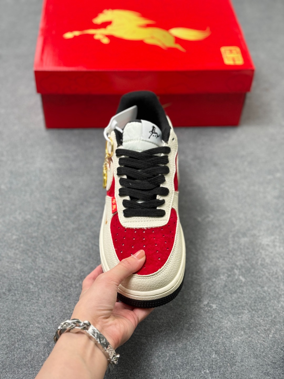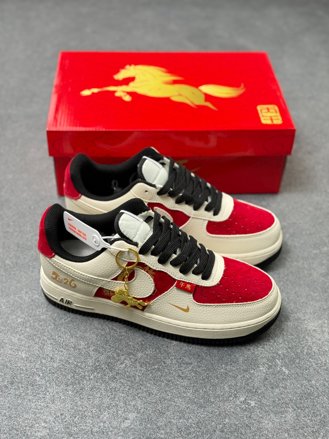 2026新年氛围感被这双AF1拿捏了 红白金配色大气喜庆 鎏金马年图案与烫金2026字样超有质感 经典空军鞋型搭配全掌气垫 走路软弹不累脚 头层皮革鞋面耐穿又易打理 细节处的金属环扣设计尽显精致 新年穿它自带主角光环
