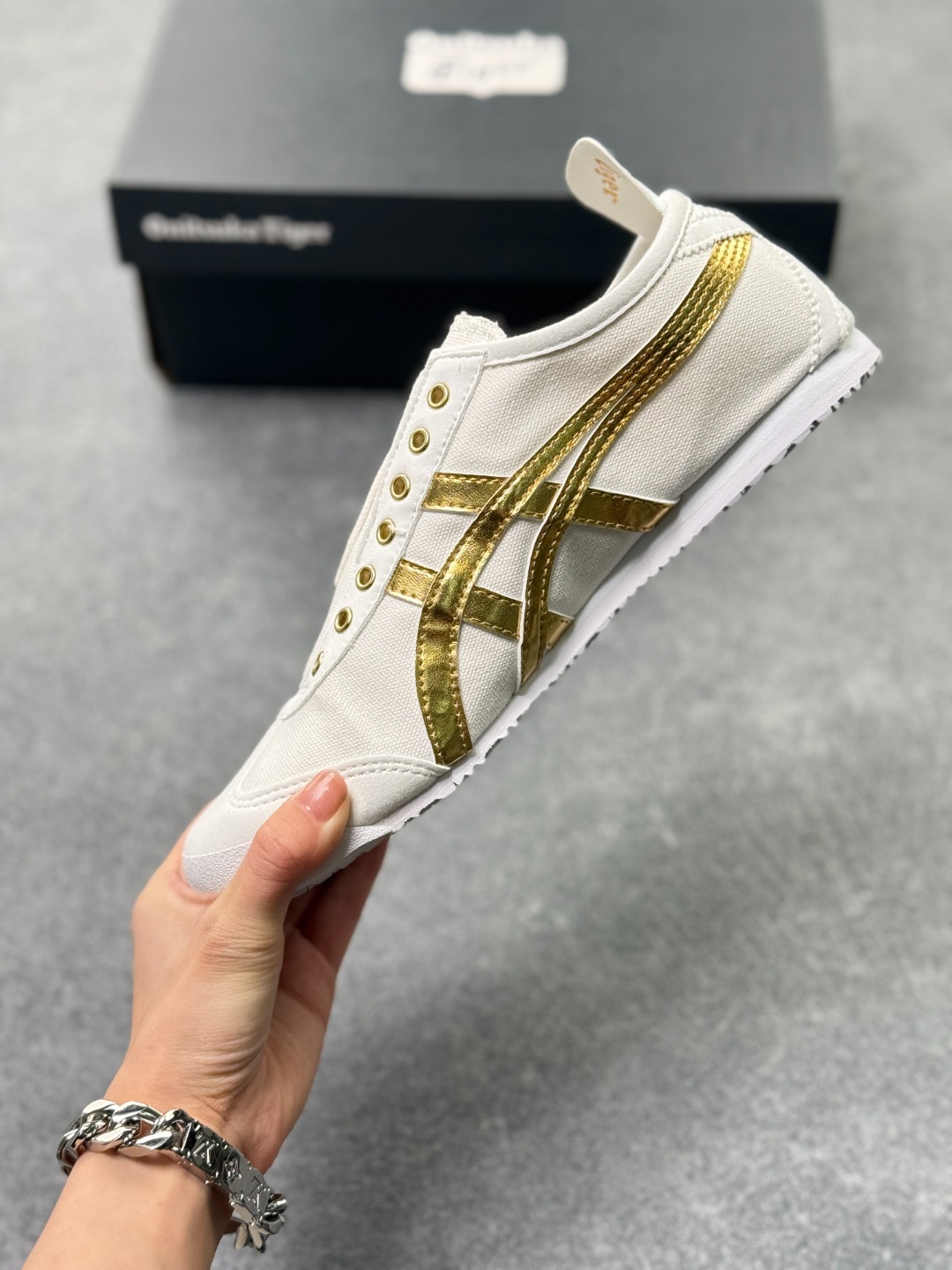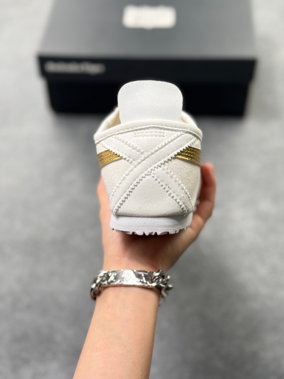 材质与设计 鞋面采用帆布鞋面 部分款式为拼接设计 既保证了透气性 又增强了耐用性 鞋型纤细 基于上世纪60年代的经典跑鞋风格 低帮设计搭配标志性的鬼塚虎条纹 简约时尚 后跟部分通常有X型部件设计 增强稳定性