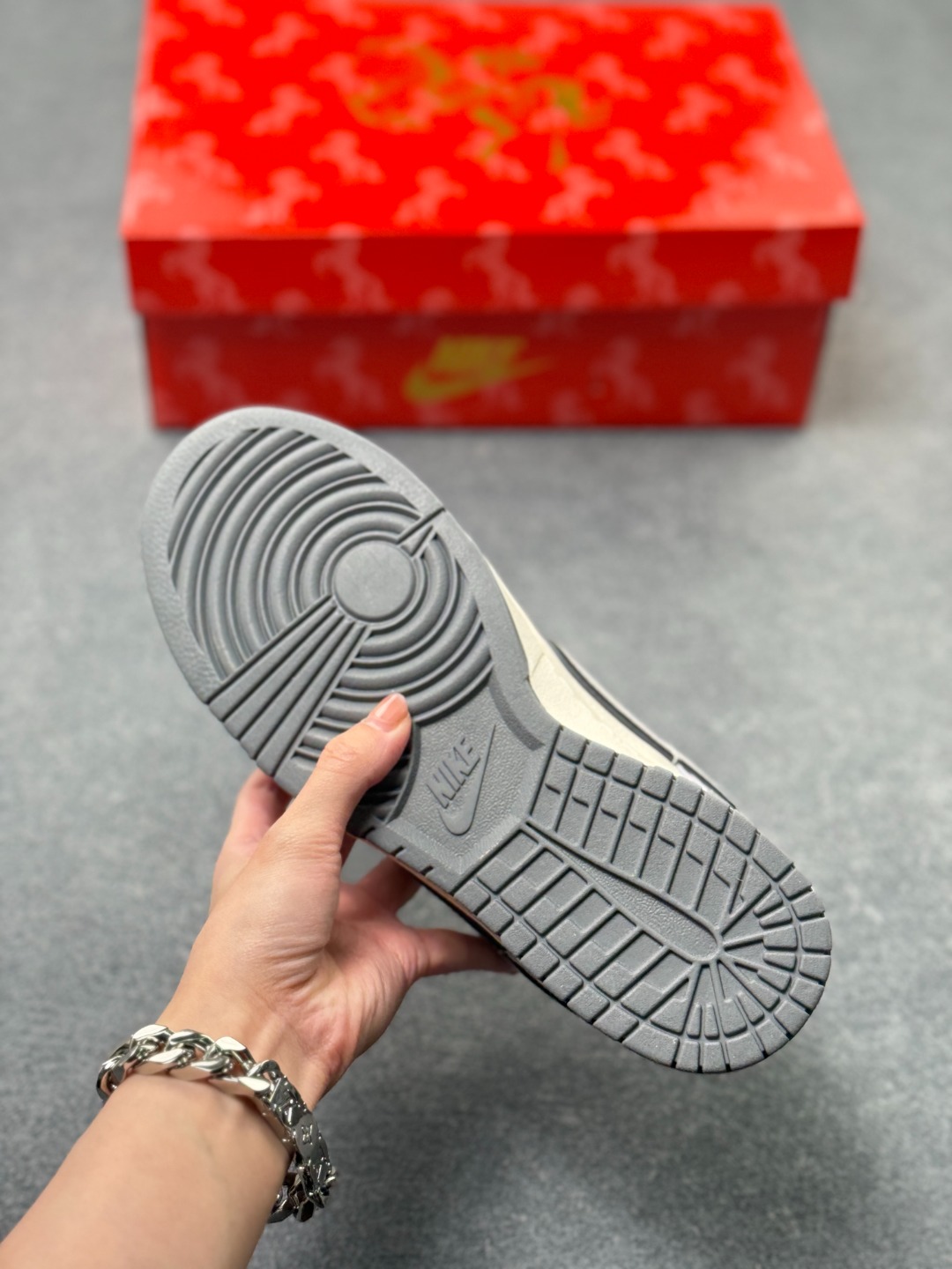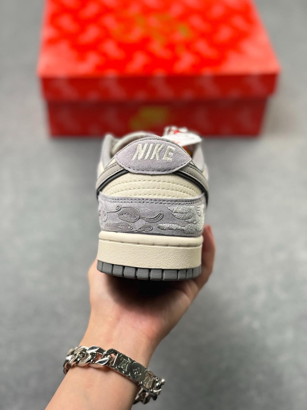 鞋身融入祥云 马形暗纹刺绣 搭配 2026 红色艺术标识 采用灰 米白为主调的低饱和复古配色 浅灰麂皮 米白皮革基底搭配祥云暗纹 2026 标识强化生肖主题 双 Swoosh 设计提升层次 整体风格兼具复古调性与中式文化属性 祥云 马形暗纹采用精细刺绣工艺呈现 2026 标识以红色印花点缀 双 Swoosh 设计通过材质区分强化视觉层次 撞色拼接处缝线规整 体现了简约风格下的细节精致度