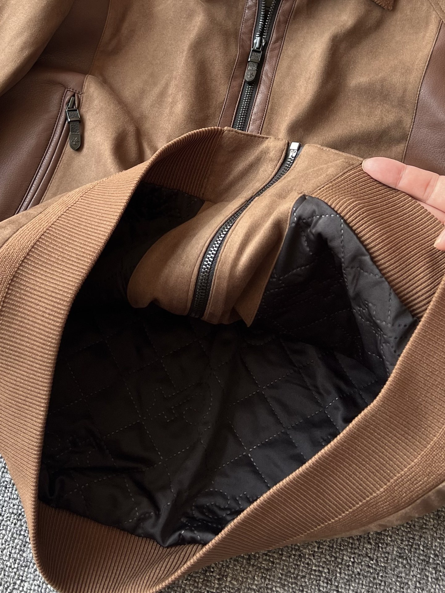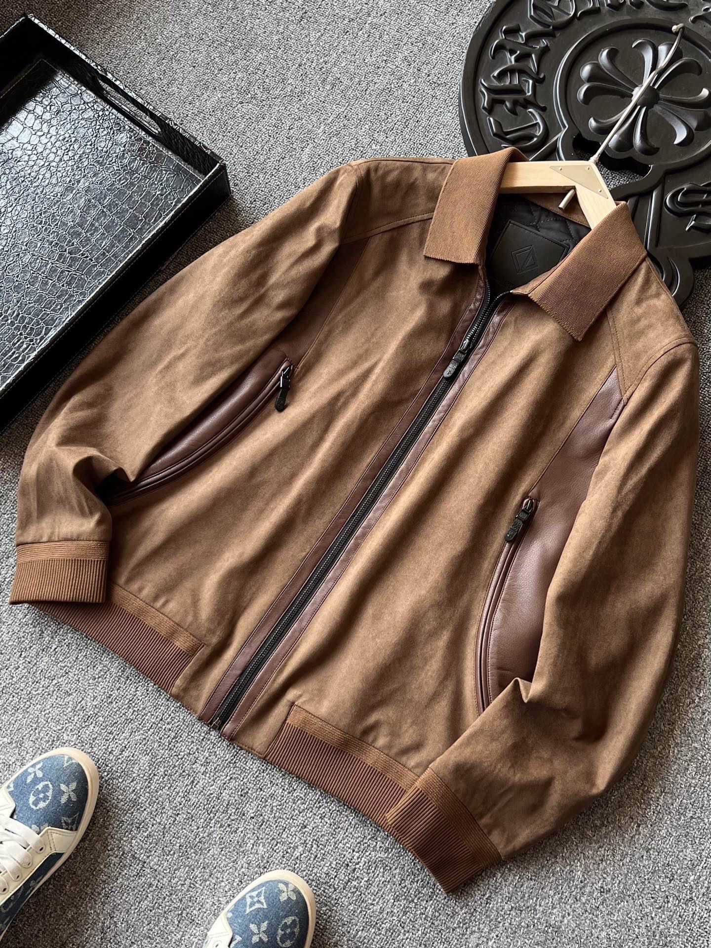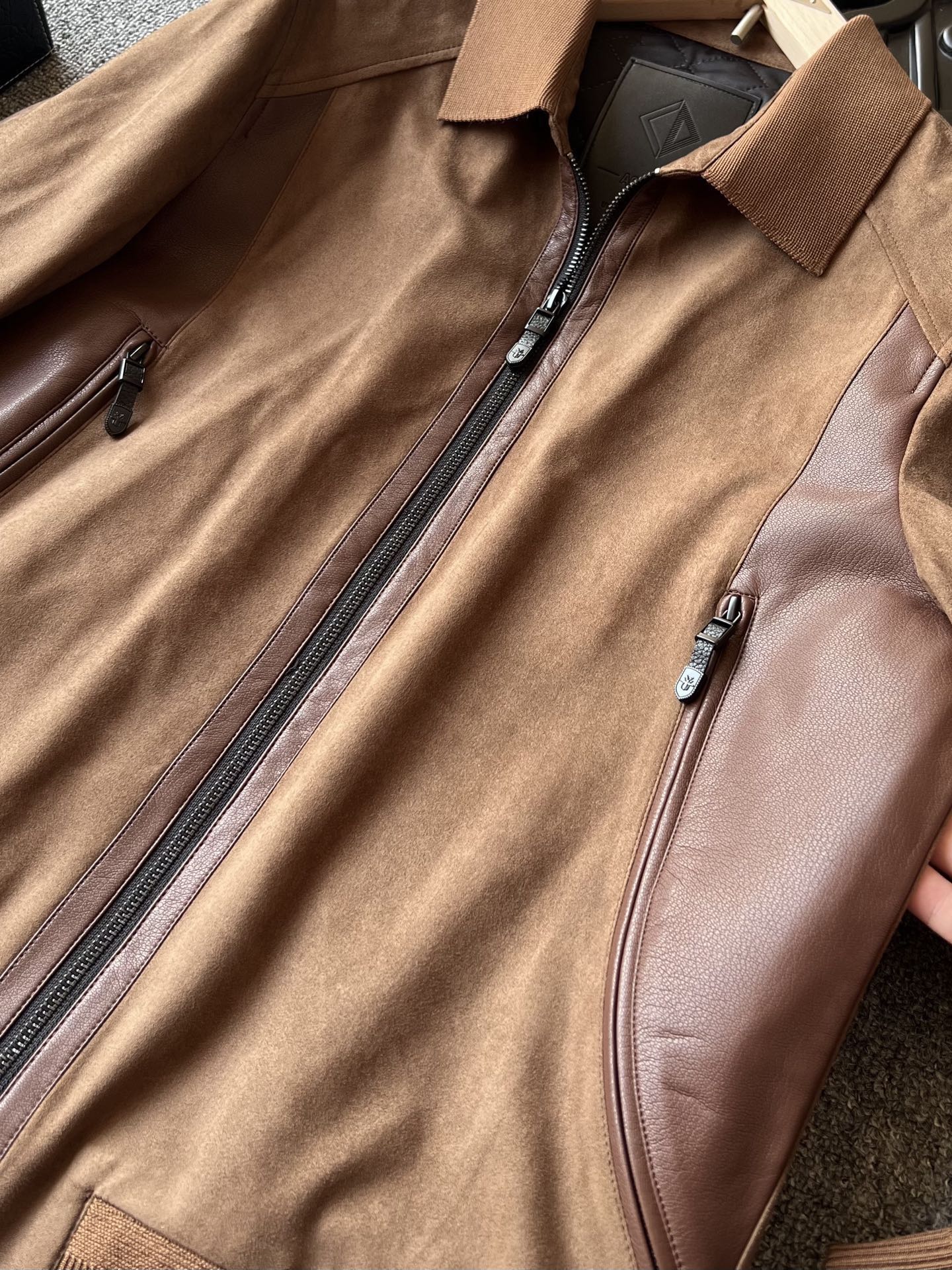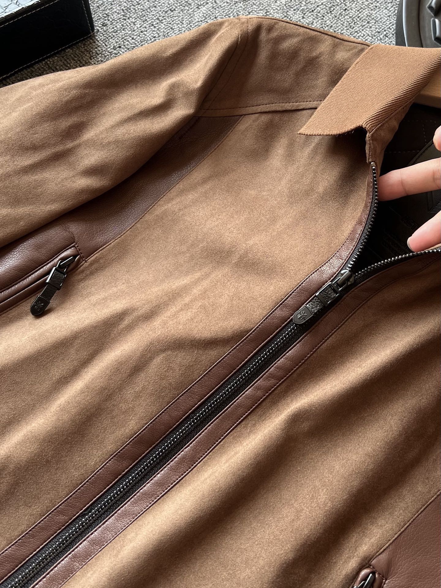 细节细节再细节 Dior家商场新款四色羊皮麂皮翻领加厚皮衣 全身用了麂皮在多处采用拼接羊皮方式 彰显精致奢贵感 门襟做了哑光羊皮包边 双侧贯穿式弧形拼接同色调羊皮 同时做了弧形拉链式口袋设计感拉满 针织领口袖口以及下摆 拉手袢带有Dior小蜘蛛logo标识 天花板级做工 一件衣服穿十年耐久性
