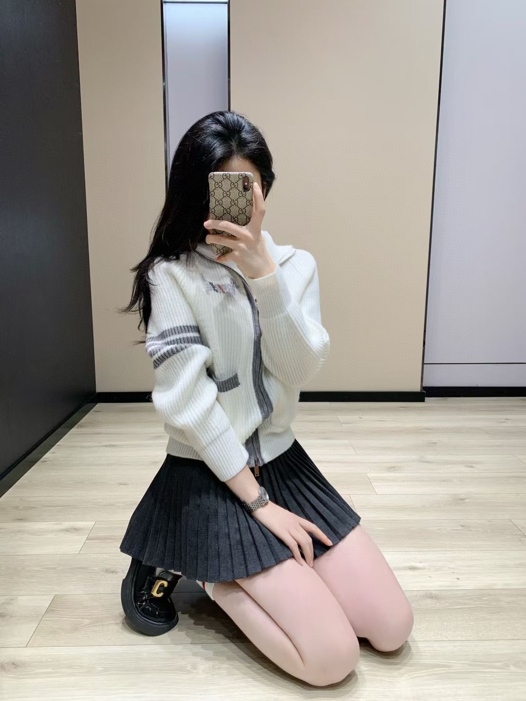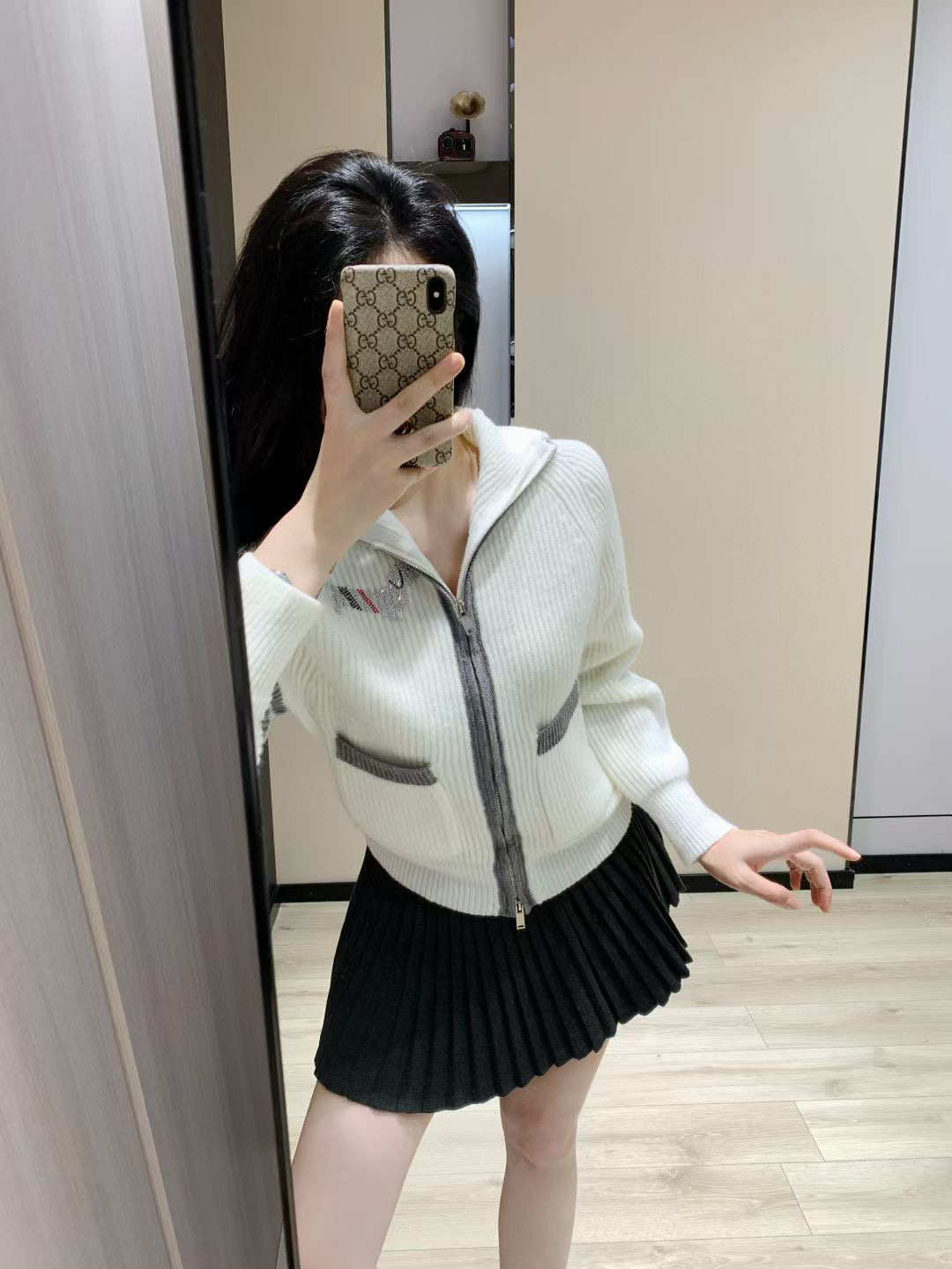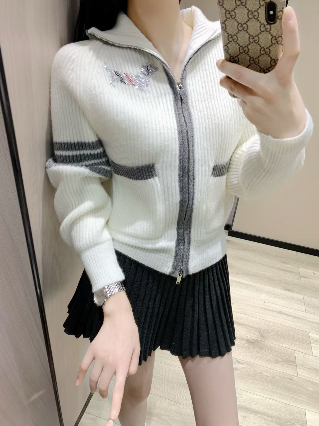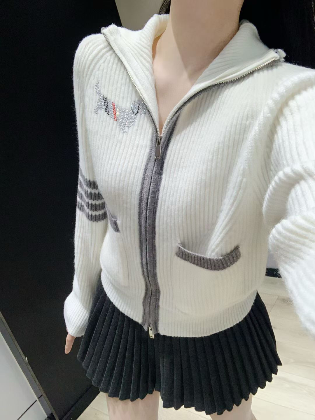 Thom Browne TB前后小狗烫钻左袖四条杠提花三色织带装饰双口袋双头拉链针织开衫毛衣
