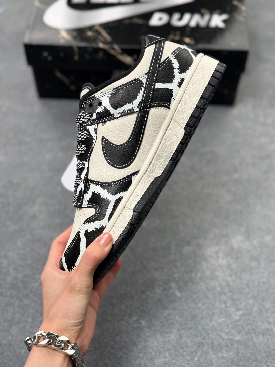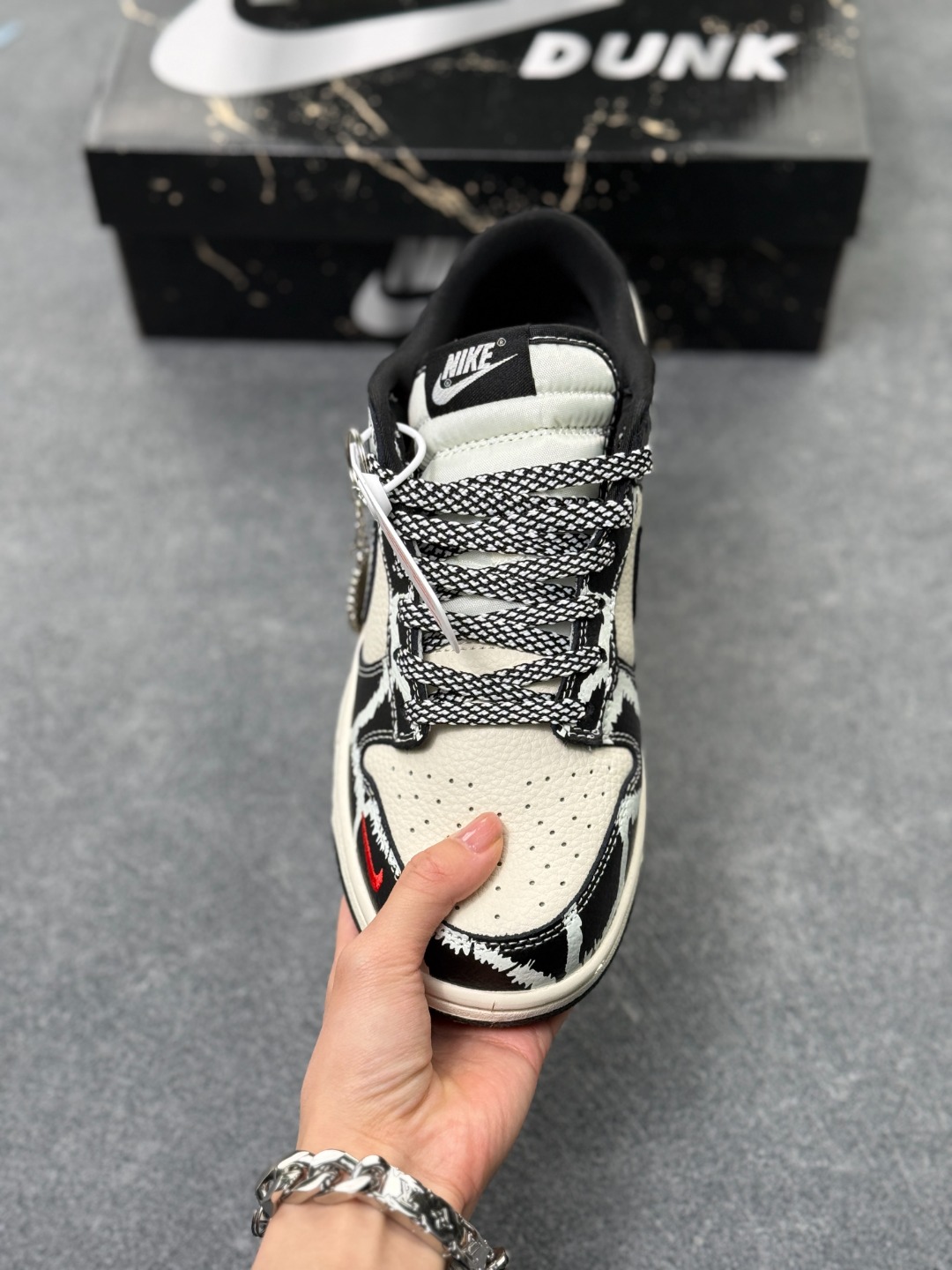 定制Dunk SB顾名思义 具有经典的Dunk血缘 又注入了更多的时尚元素 相较于普通的Dunk滑板鞋 改良版的Dunk SB加厚了鞋舌的填充 使舒适性大大提升 同时也更方便穿脱 中底部分则加入了脚感柔软舒适Zoom Air气垫 有效吸收滑板等极限运动在落地时带来的冲击力 为街头运动者们提供更好的保护