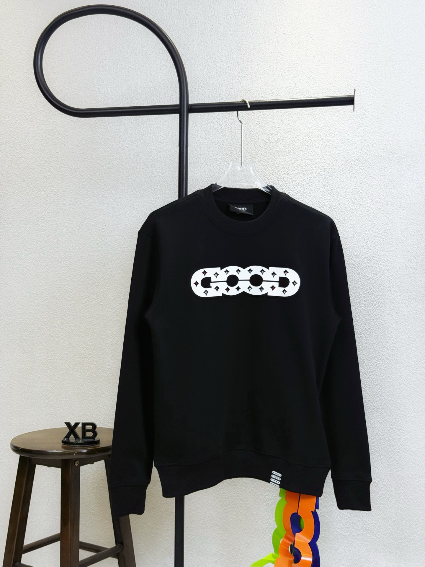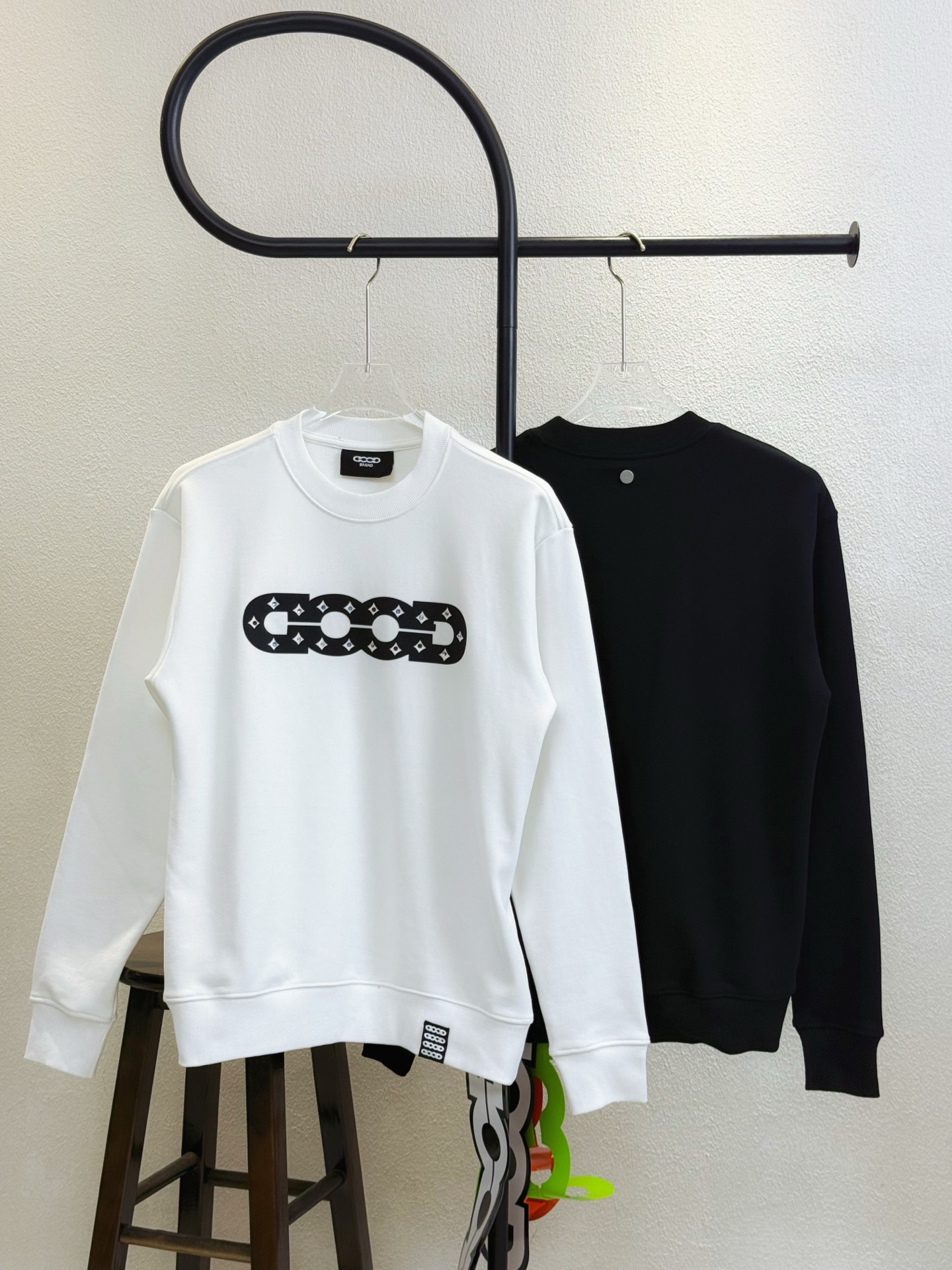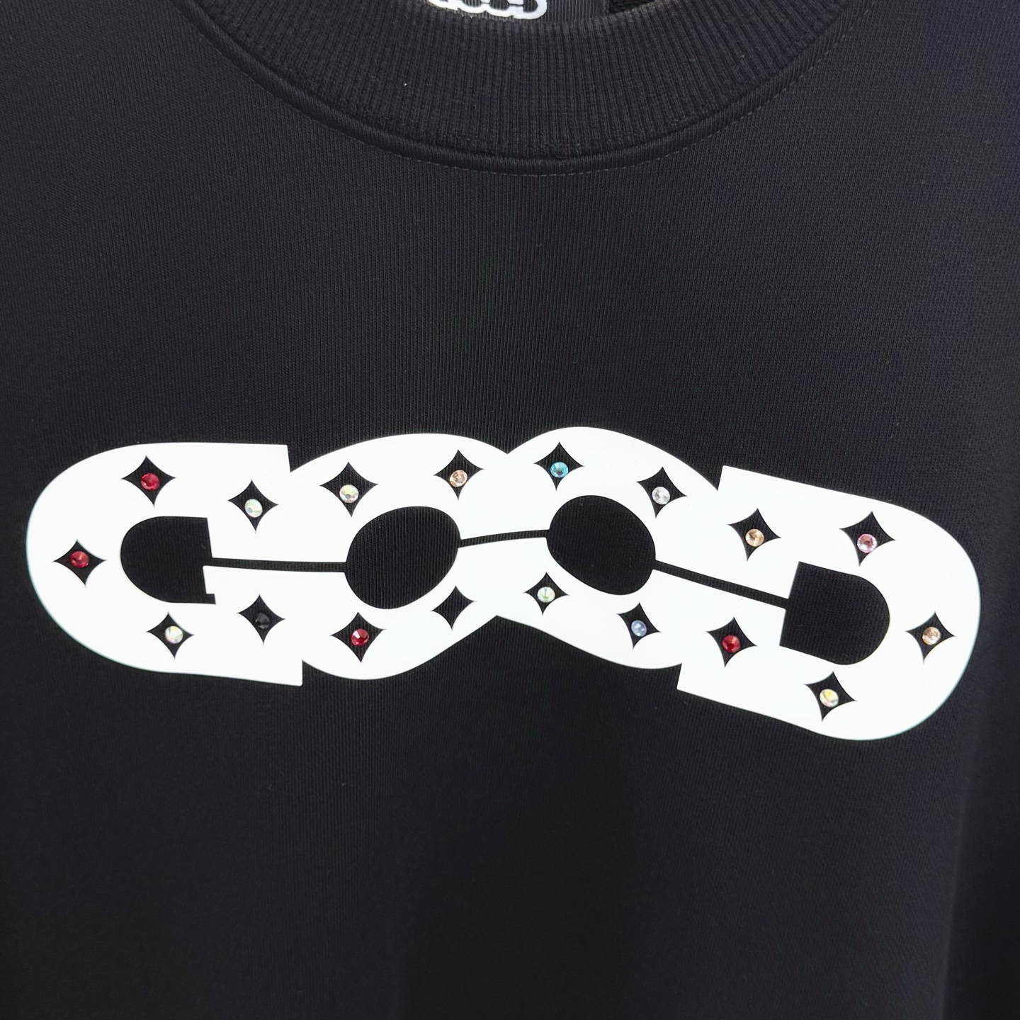 款号X286 黑白两色 GOOD字母镶钻彩钻刺绣圆领卫衣 面料采用400克毛圈高克重95棉5氢纶1 1双纱洗一辈子都不会变形的 男女同款 官网细节一致 全套包装 三标齐全 防潮纸 区别市场通货 随意对比 OS版型 最大可穿200斤上身舒服有型 颜色 黑 白 尺码 S XL