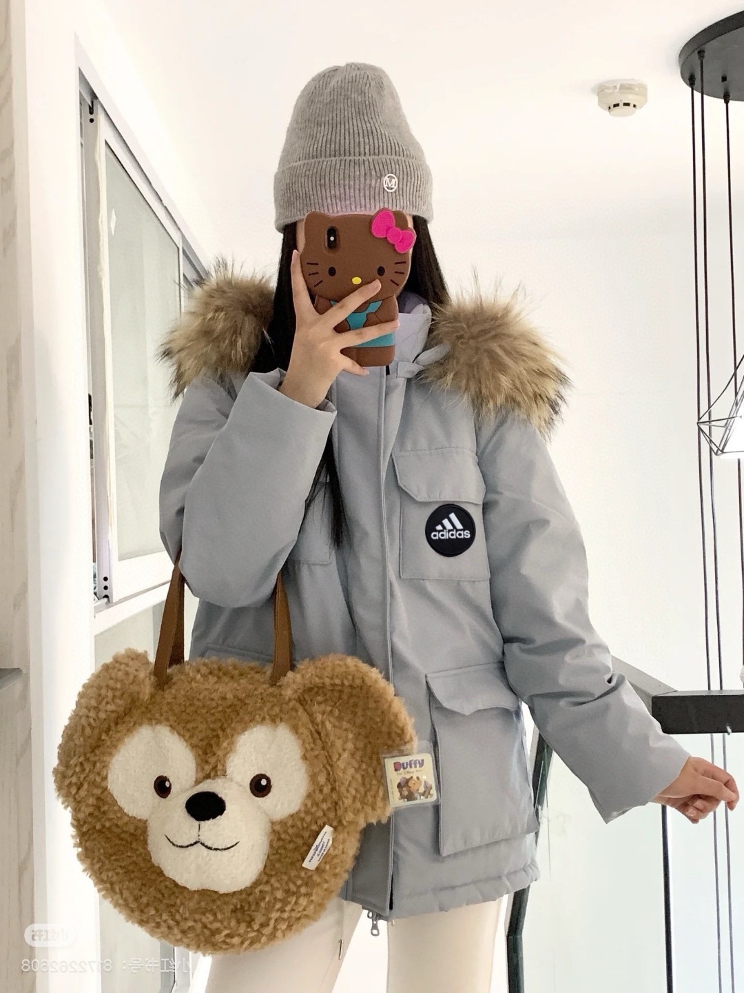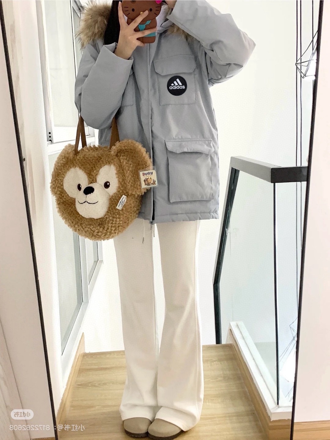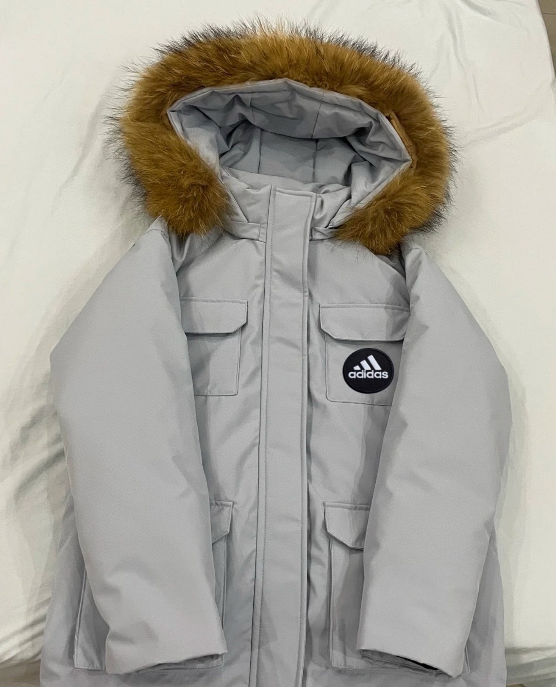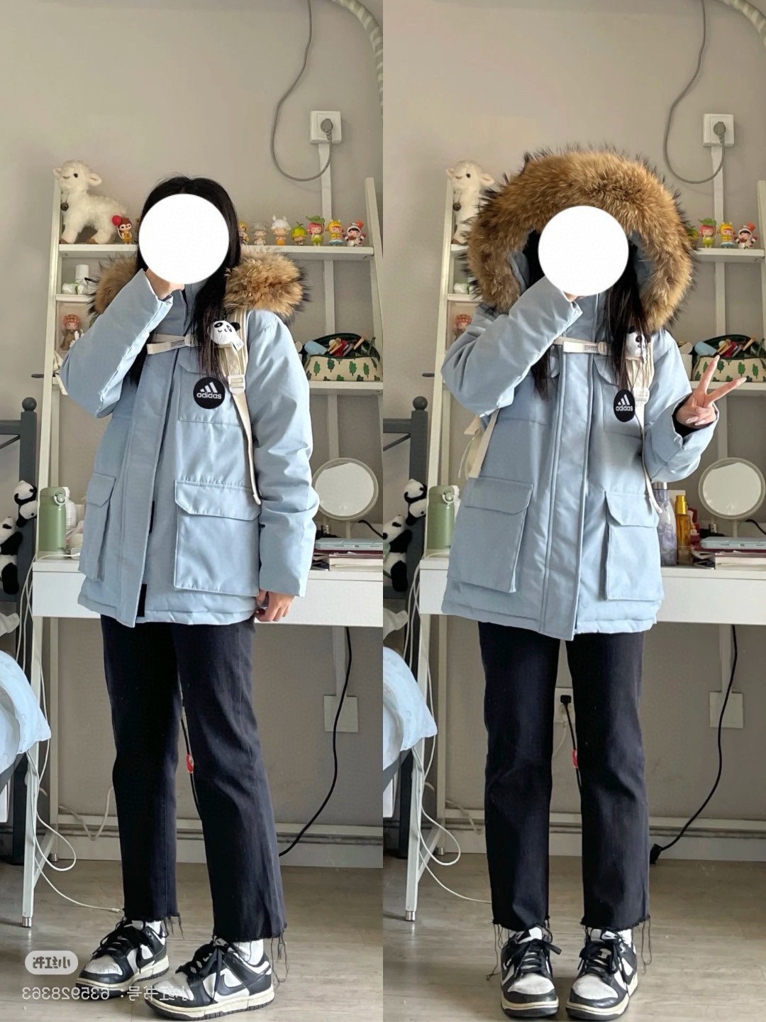 原版质量 阿迪达斯Adidas蓝色工装羽绒服女款冬季中长款白鸭绒毛领派克服外套加厚奶fufu浅蓝工装90绒羽绒服