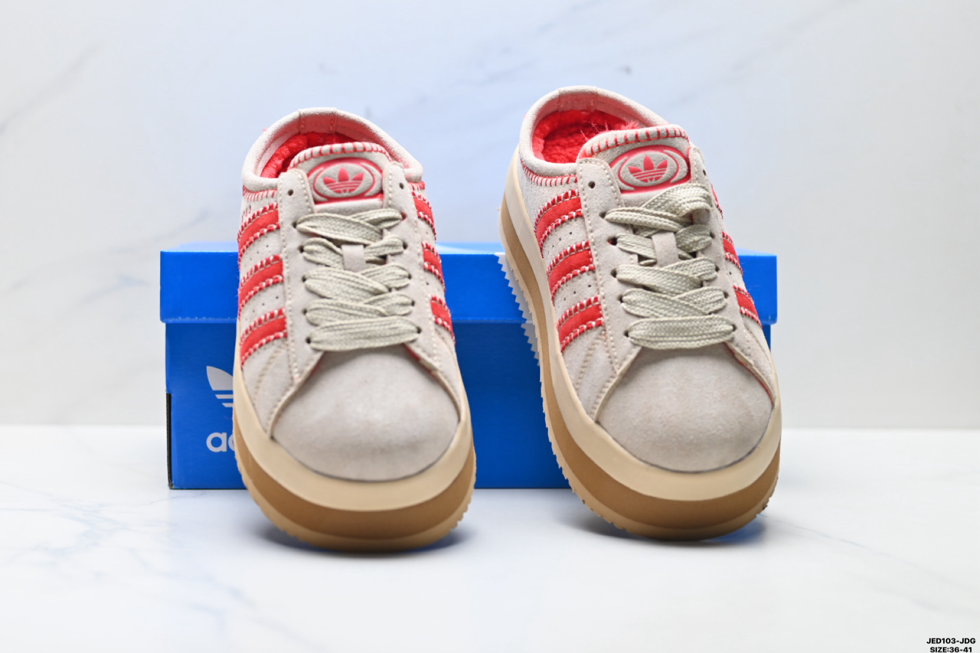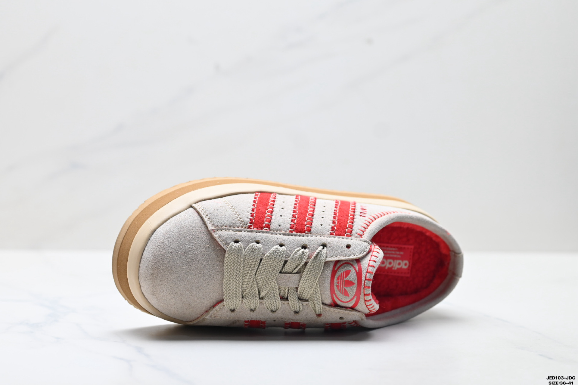 保有原型设计中经典的三叶草LOGO及三条纹设计的同时 放大了整体鞋身 鞋带和三条纹比例 同时鞋身填充棉部分用料扎实 较为厚重 这也使得鞋舌部分不会轻易移位或弯折 同时鞋面切割与走线部分处理十分精细 皮面拼接部分边缘切割也十分整洁 保证了个性化设计的同时做工细致