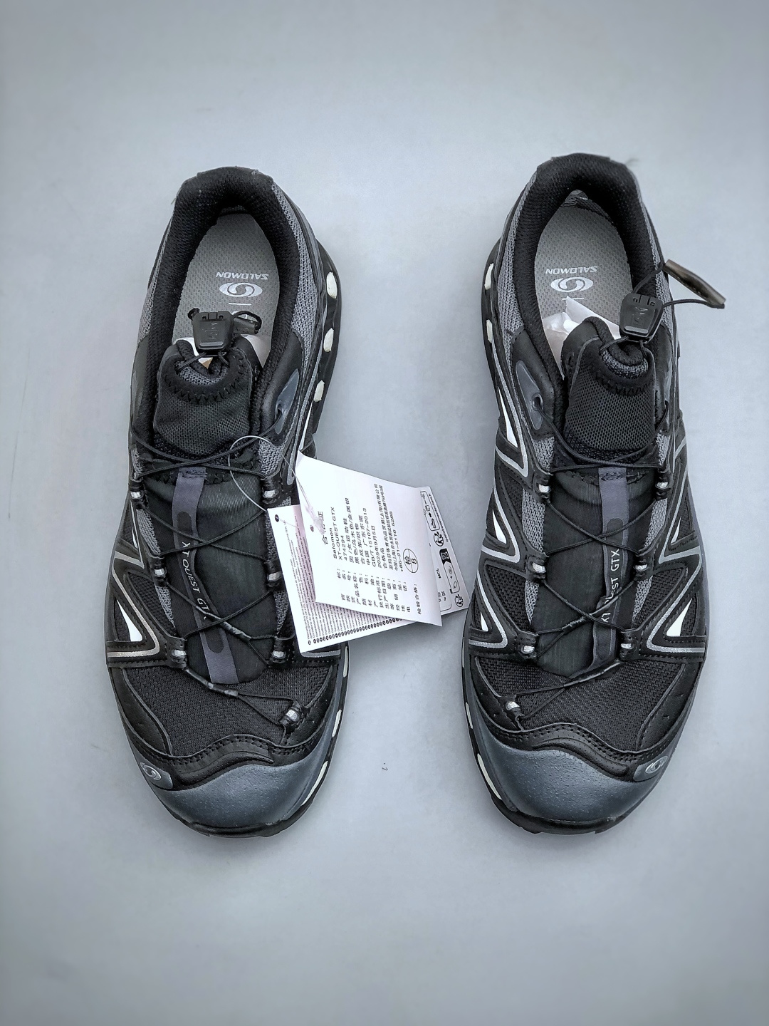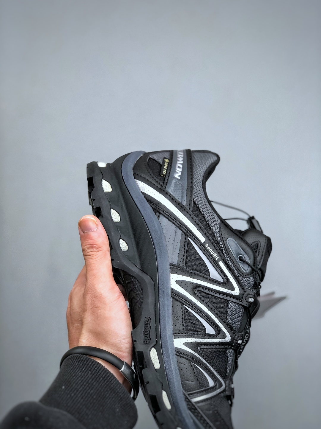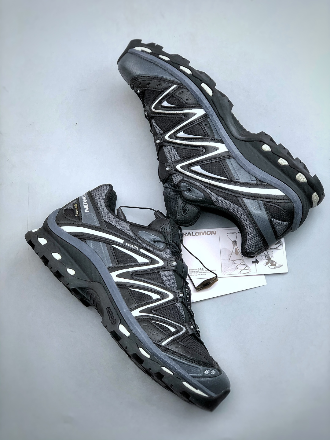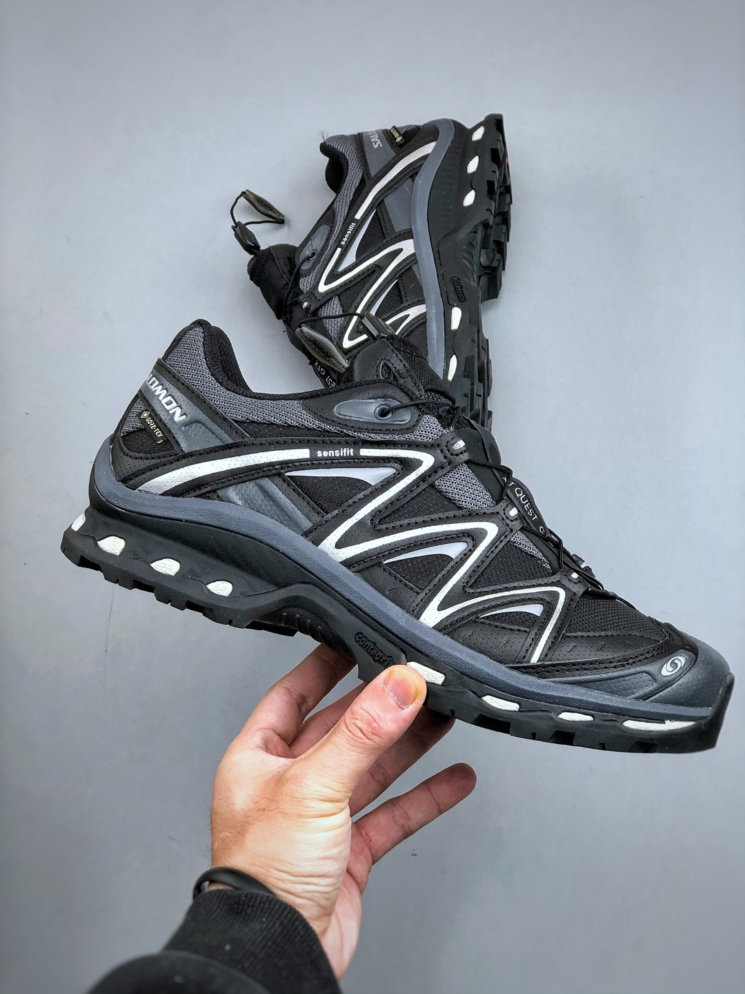2代K版双层套盒版本 Salomon XT QUEST GTX 萨洛蒙户外越野跑鞋 鞋面采用SENSIFIT贴合技术 全方位贴合包裹脚型 鞋跟部鞋底牵引设计 提供强大的抓地性能 更适应野外崎岖不平的道路 其3D ADVANCED CHASSIS底盘 材料轻量大化 钉齿设计更具稳定性 防护性 鞋底易磨损区运用CONTAGRIP高耐磨材料 应对城市硬质路面长距离跑考验 货号 474294 24 尺码 36 46