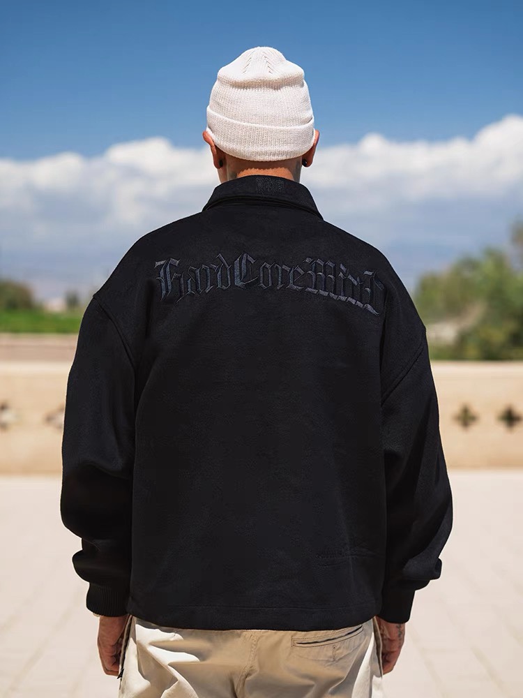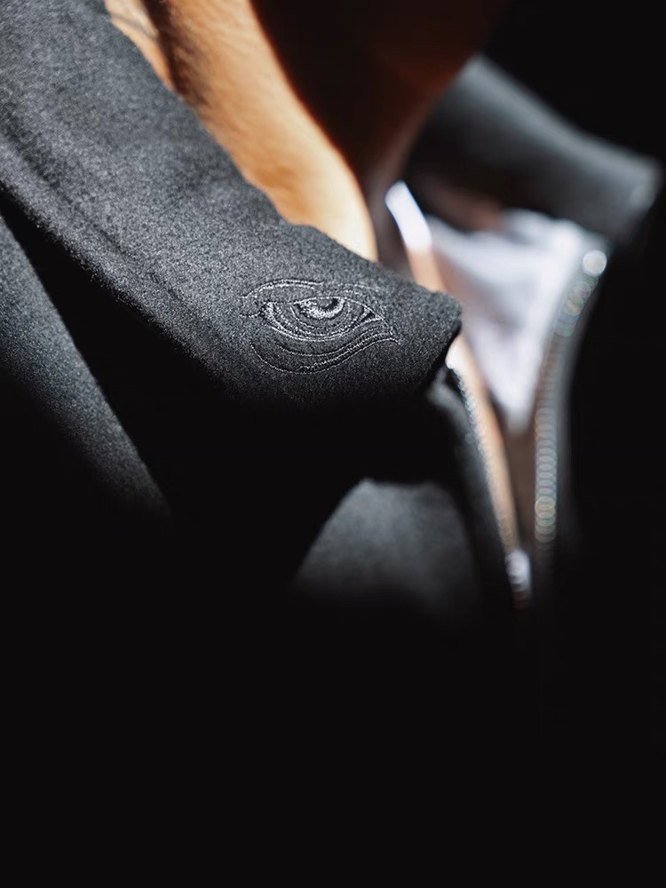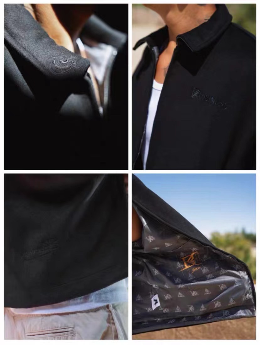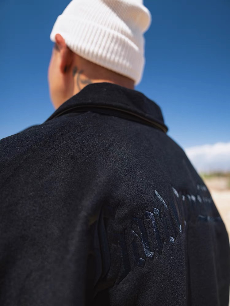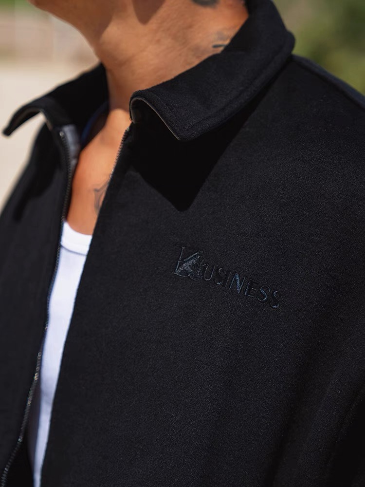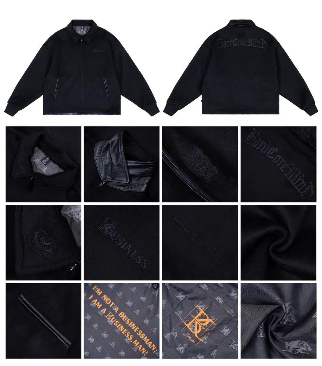 STA2023秋冬季BK系列生意系列黑色毛呢拼皮刺绣拉链翻领夹克外套