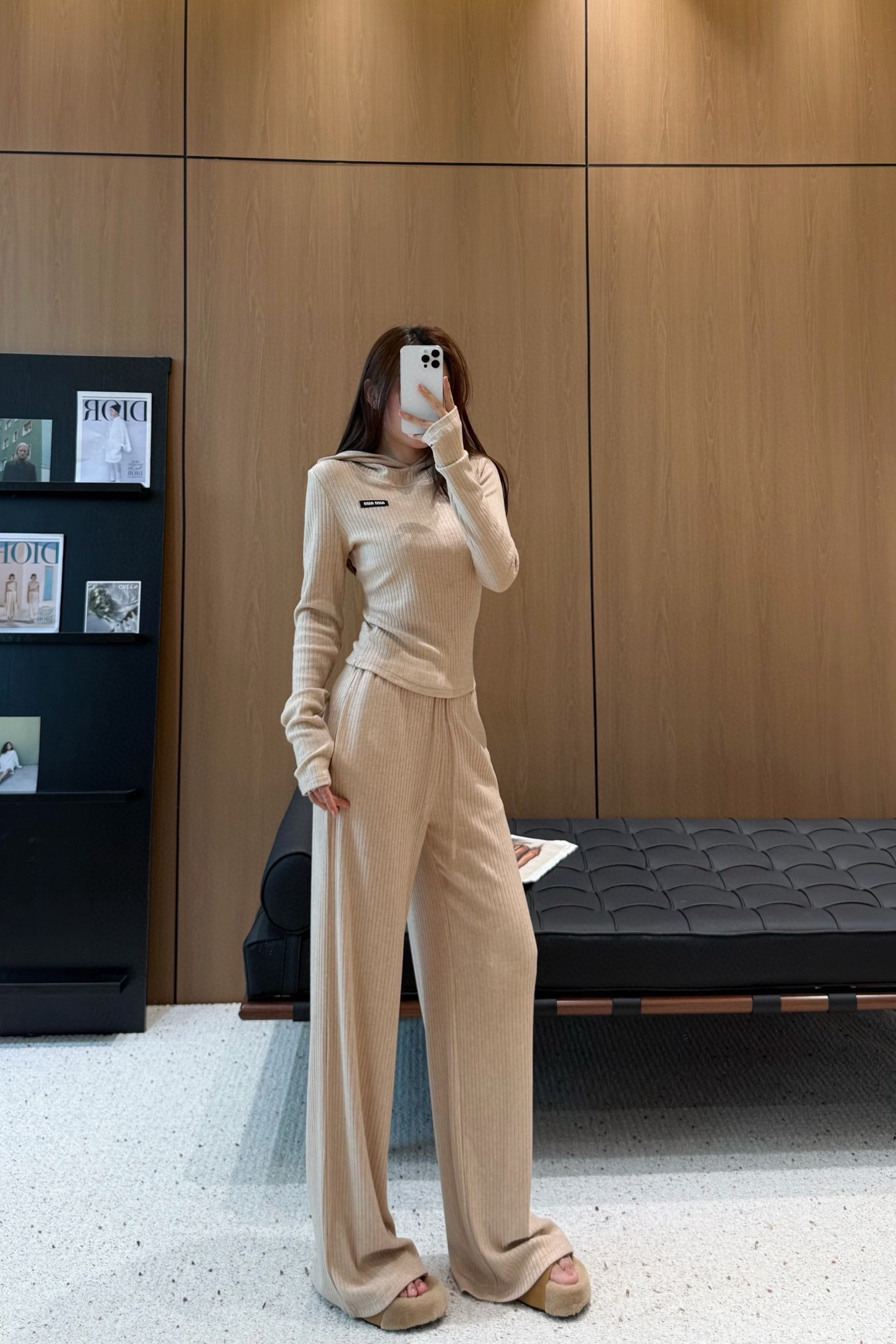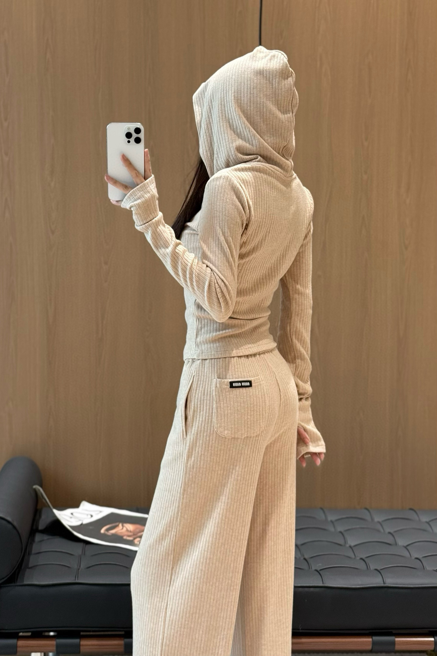 Miumiu缪缪定制字母小标修身连帽上衣抽绳松紧腰长裤套装