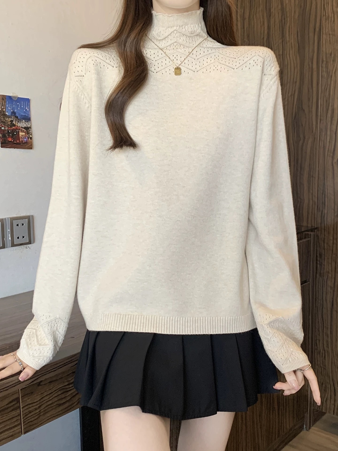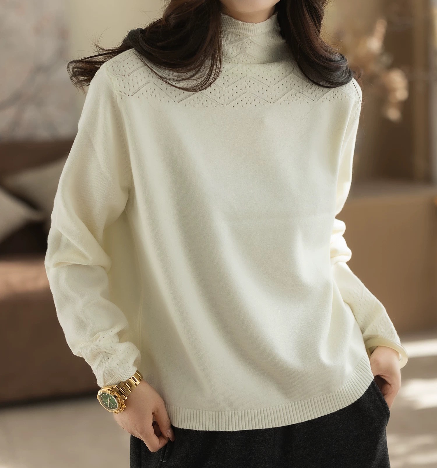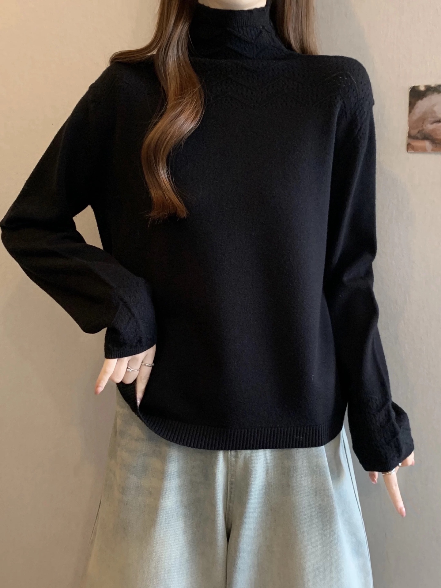 半高领 局部镂空花纹 领口和袖口的纹理细节藏着小心思 简约但不普通