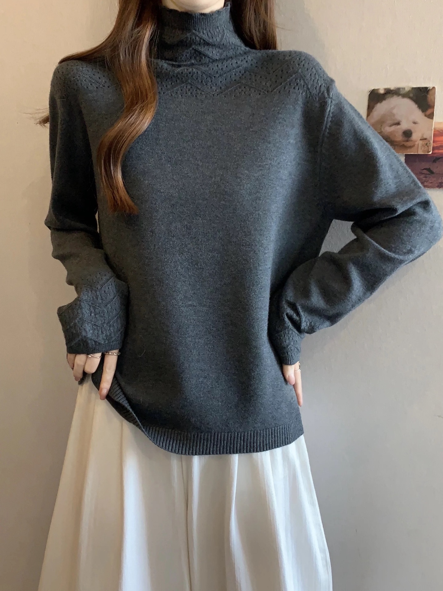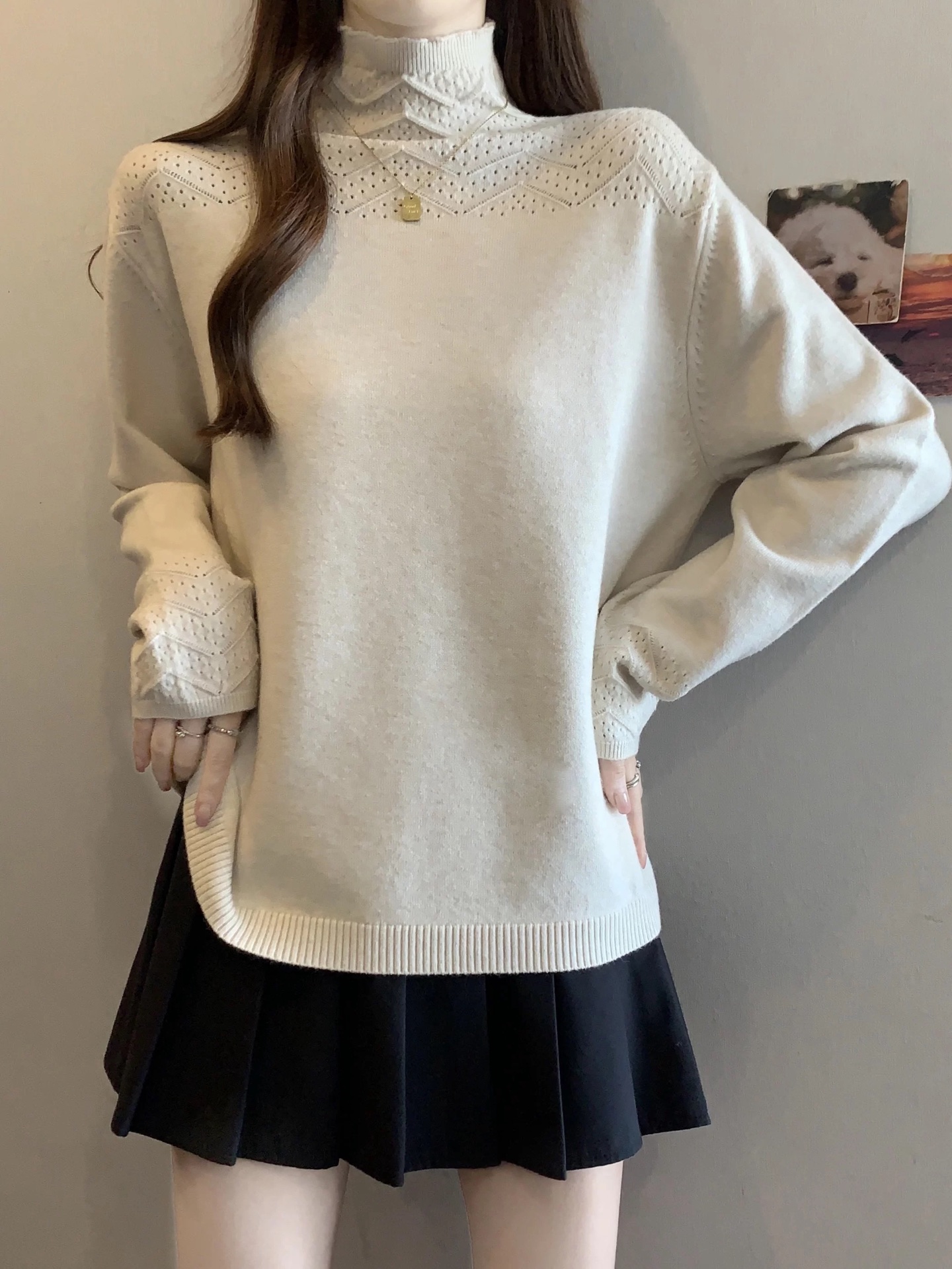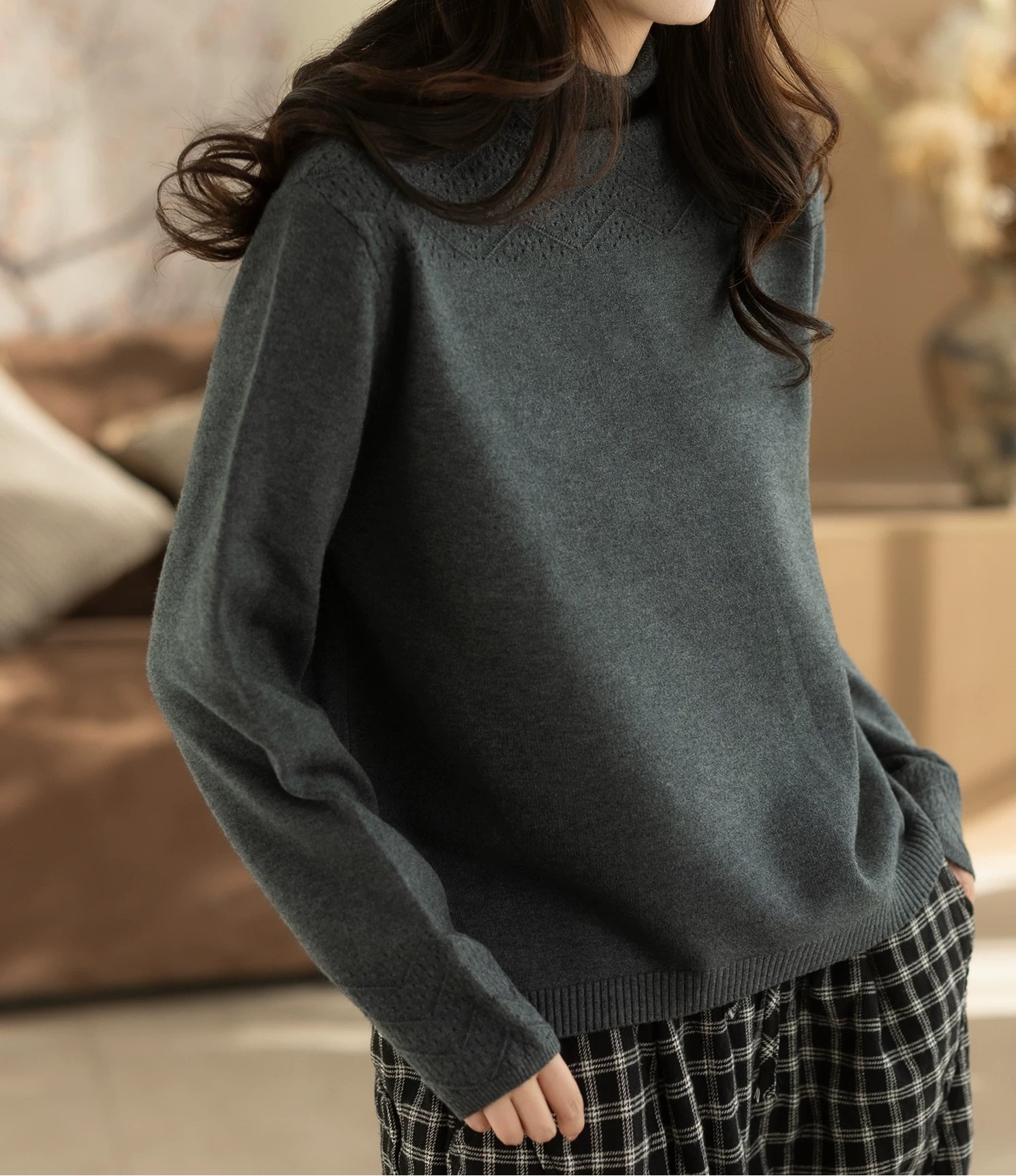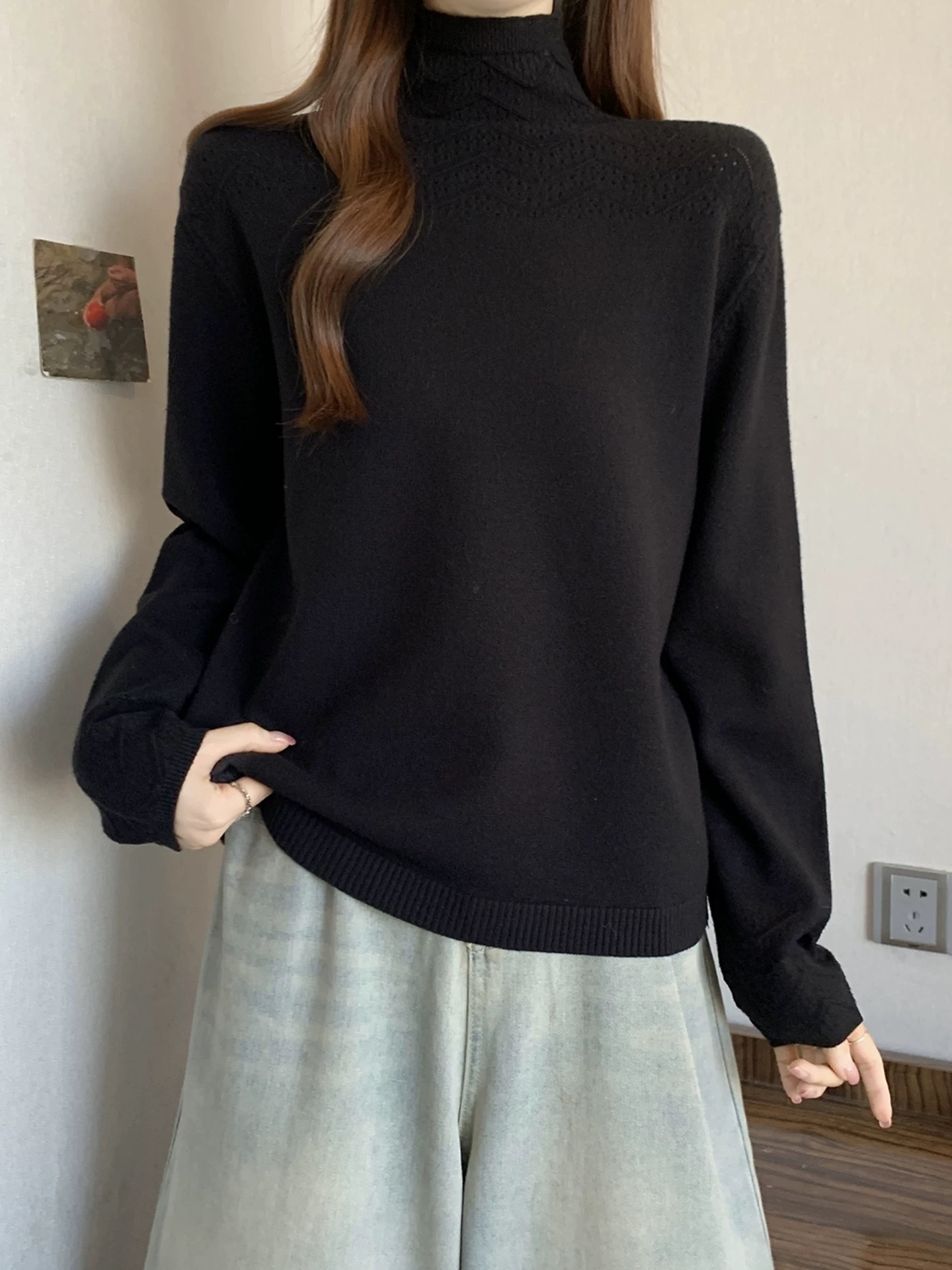 半高领 局部镂空花纹 领口和袖口的纹理细节藏着小心思 简约但不普通