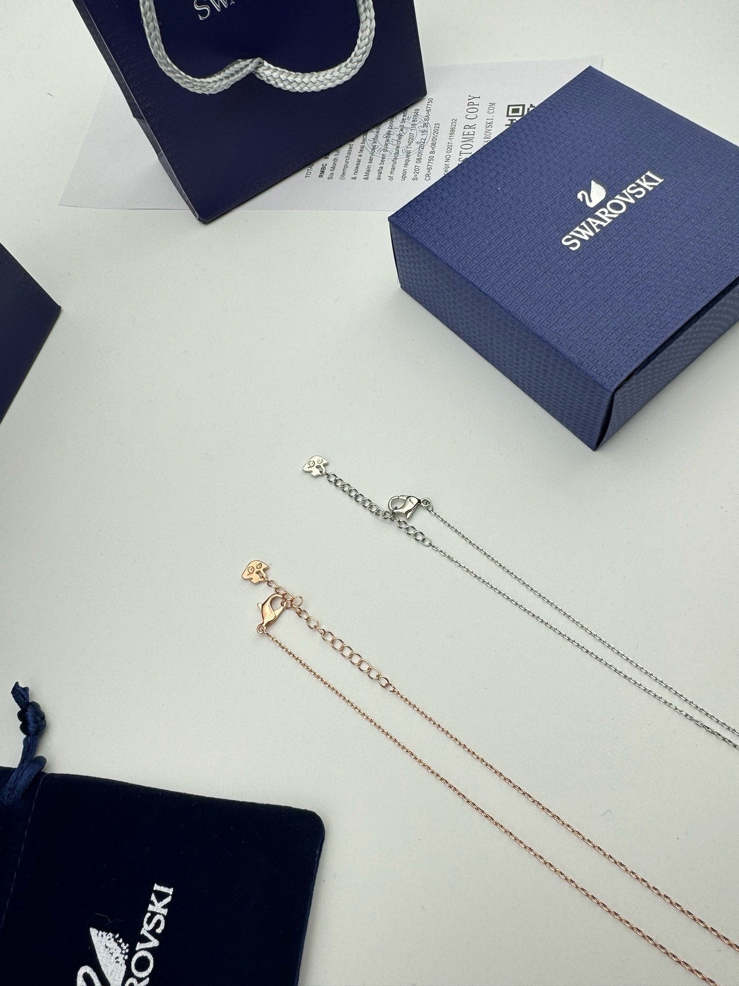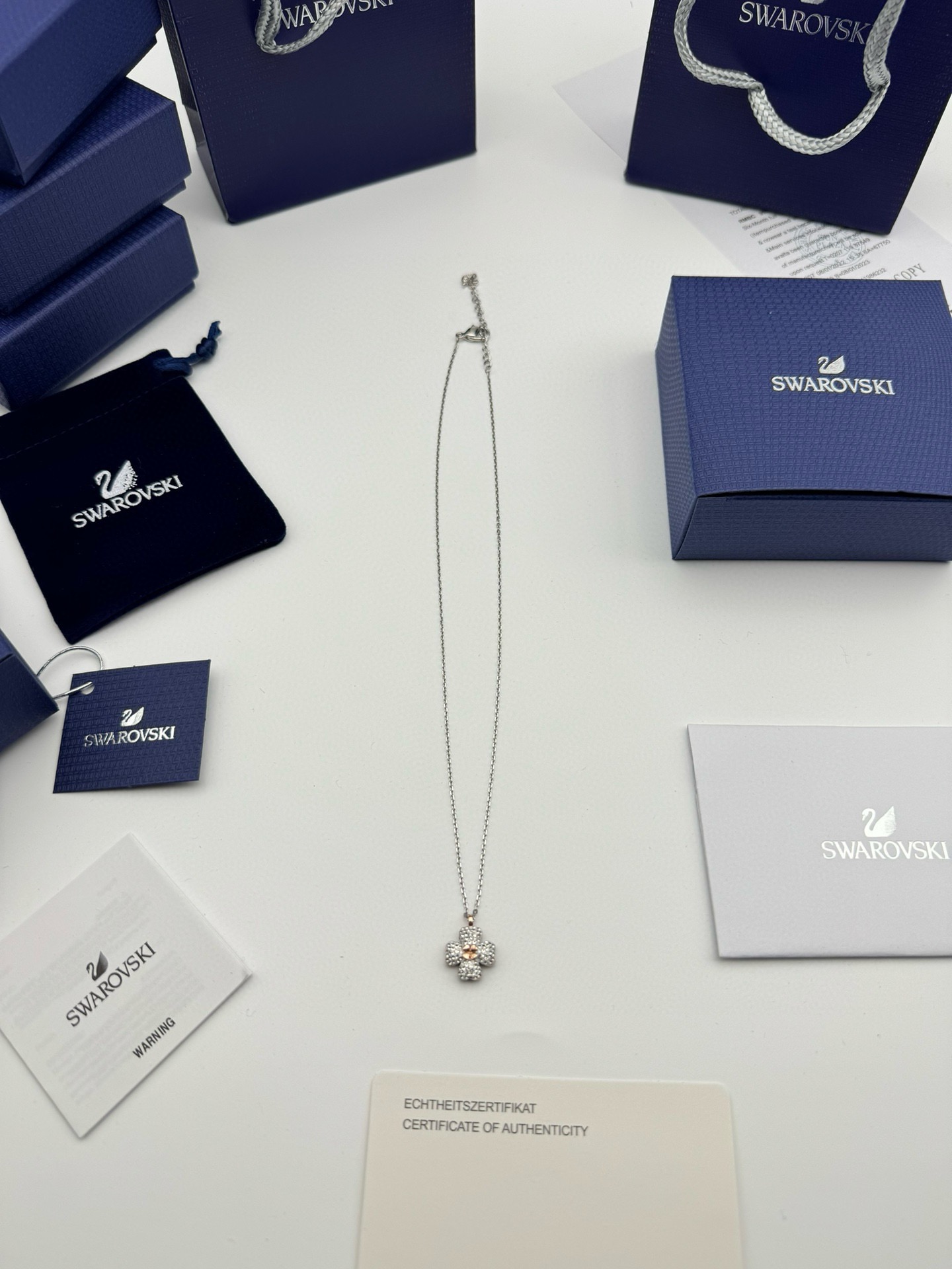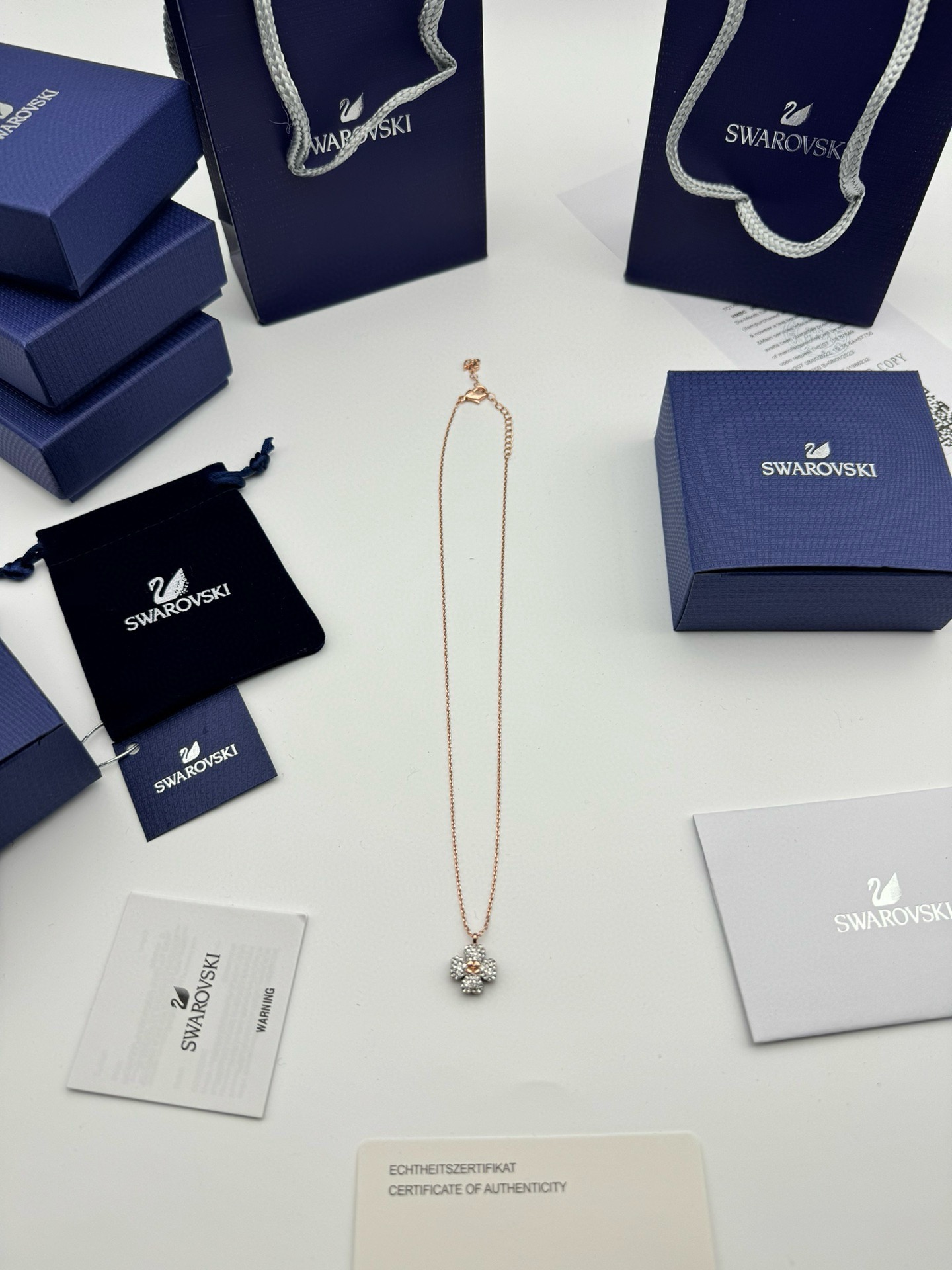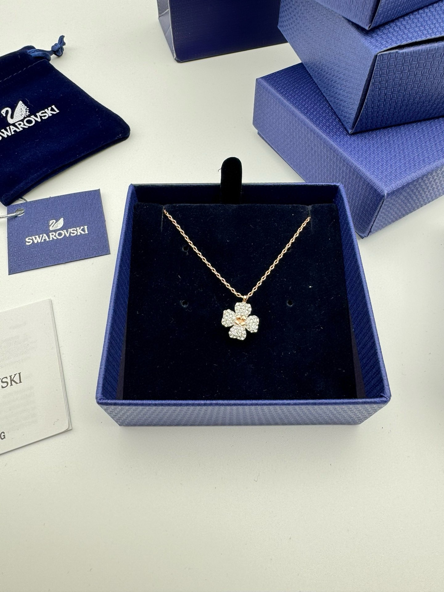 SWAROVSKI施华洛世奇黑白双拼四叶草项链 配全套包装 款411 施华洛世奇原厂订单 深圳出口港货 仅此一批 礼物准备好了吗 象征优雅及高贵是施华洛世奇首饰的标志 自信 幸运并且一生只有一个伴侣 象征着一心一意 代表珍贵而永恒的爱情 这款光芒四射的链坠灵感源于大自然 让您的造型发挥最佳效果 镀玫瑰金色设计精心打造幸运四叶草图案 粉红色施华洛世奇立方氧化锆位于中央 周围四片叶子点缀密镶透明仿水晶 一款趣致而奇妙的项链 您可日常佩戴 随附一条饰链 带上它尽显风情 让你在每个场合更添优雅 链长 45CM可调节 颜色 玫瑰金 银色 材质 合成立方氧化锆 仿水晶 镀玫瑰金色调