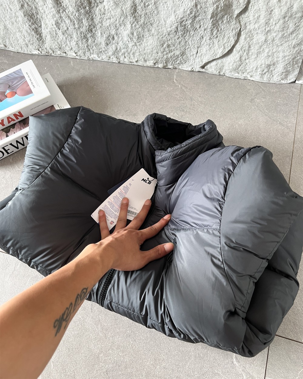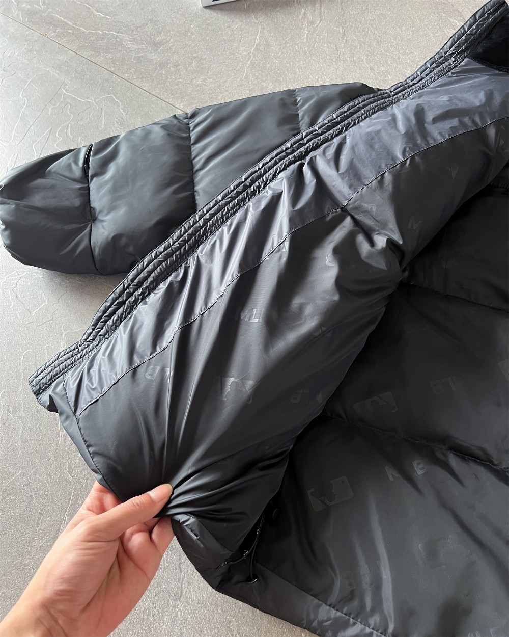 265158261 - MLB 刺绣小logo图案宽松拉链长袖几何图案灰黑拼色立领羽 324154
