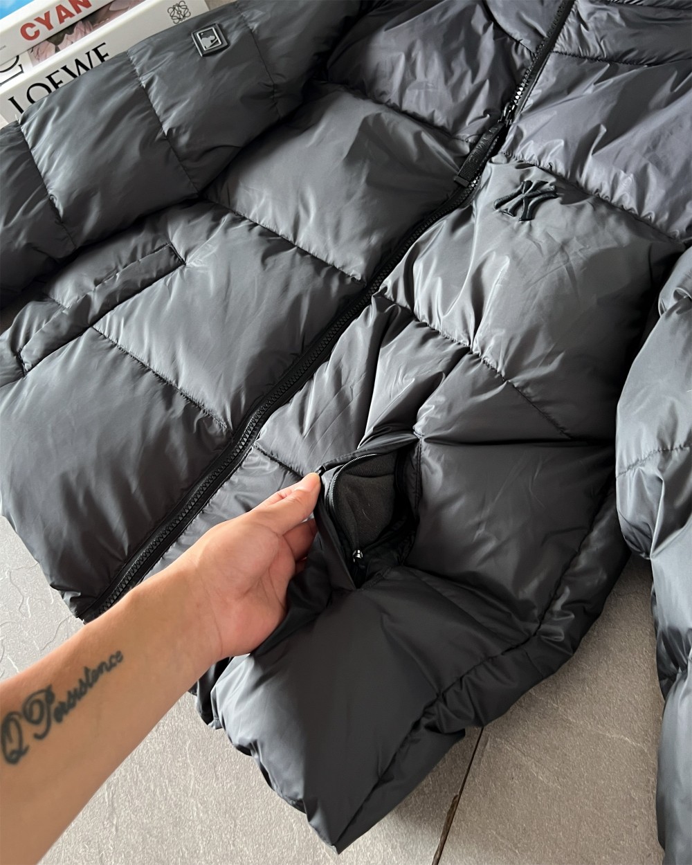 2 里料原材 里布采用高密度尼丝纺纯黑里布 2D直喷印花 和原版完全一致 logo不存在一点凹凸感 光滑平顺是我们精益求精 试了又试的成果 区别市场数码印花版本