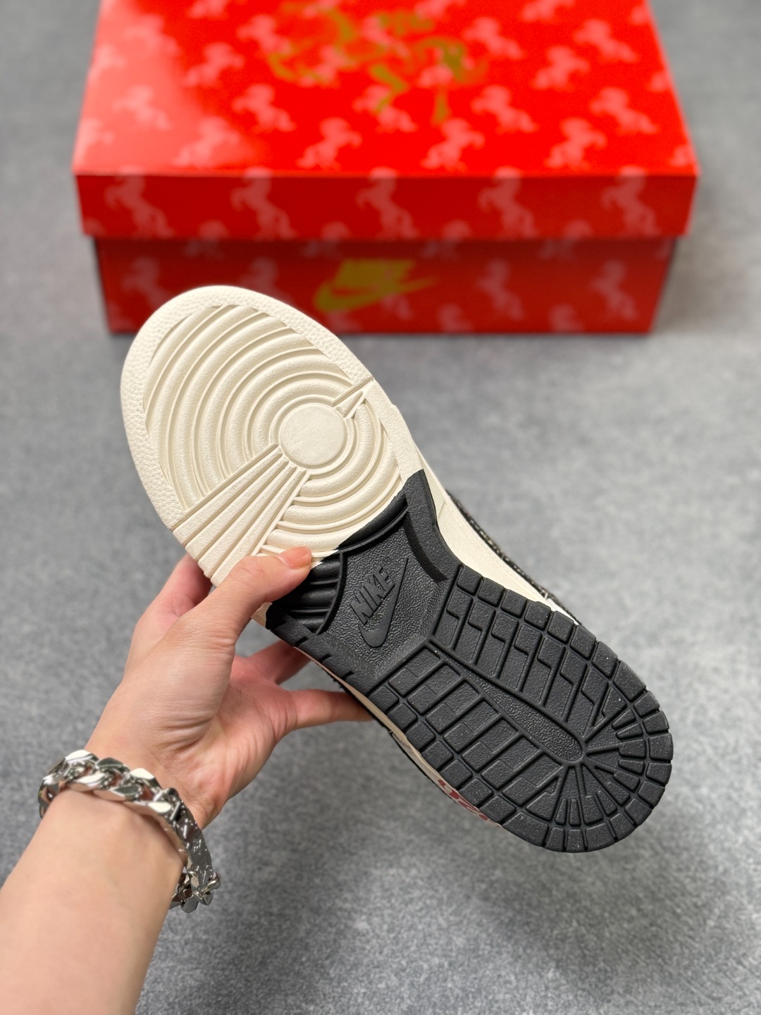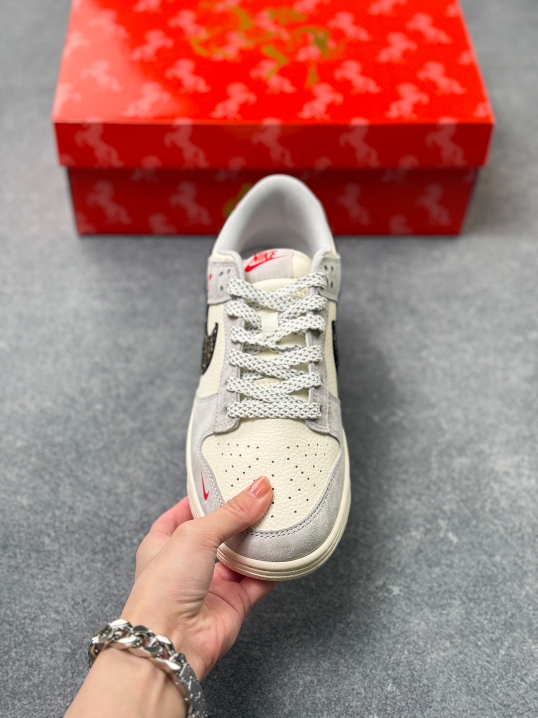 这双鞋将生肖元素与街头潮流完美融合 灰白主调优雅低调 鞋侧的鎏金Swoosh与红色马形刺绣是点睛之笔 后跟的 2026 字样则赋予了它独特的纪念意义 无论是迎接新年还是日常穿搭 它都能让你的风格脱颖而出 迈出的每一步都别具一格