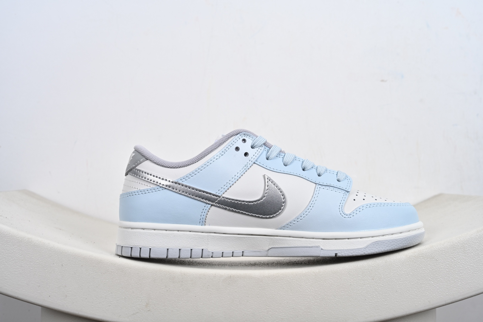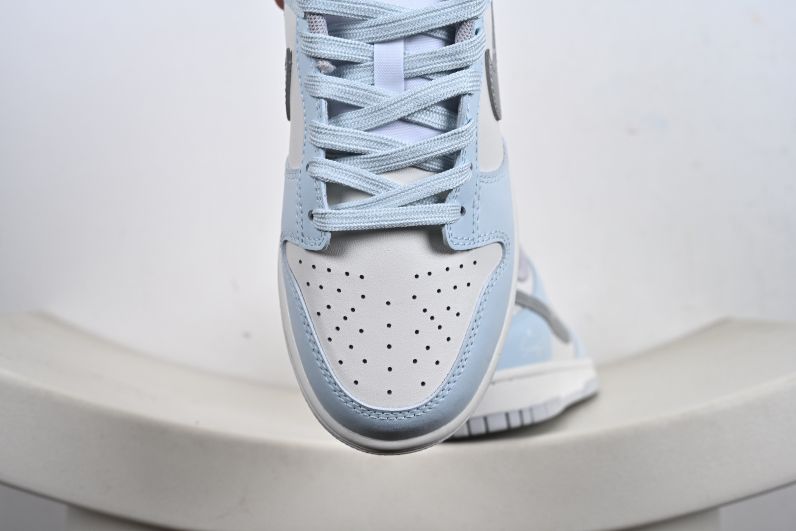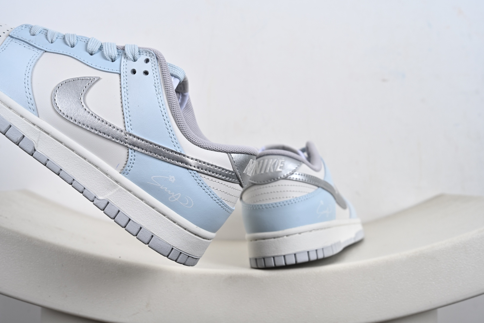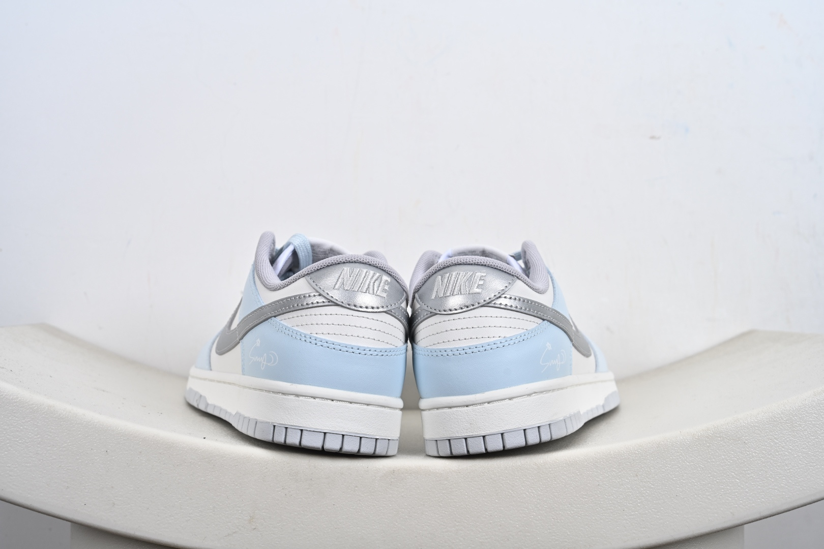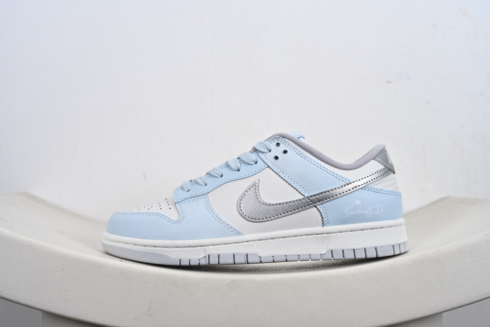 定制版 Nike Dunk SB Low 耐克 SB 低帮 所念星河 冰封雪银 此款以冰川蓝为基调 纯白如云絮轻覆于鞋面 蓝白渐变仿若星云交织 侧身Swoosh Le以电镀银勾勒 暗光下如流星划破天际 后跟手写字体点缀文艺气息 低调诉说仰望星空的浪漫 冰川蓝与白色的清爽配比 褪去了张扬 更显日常高级感