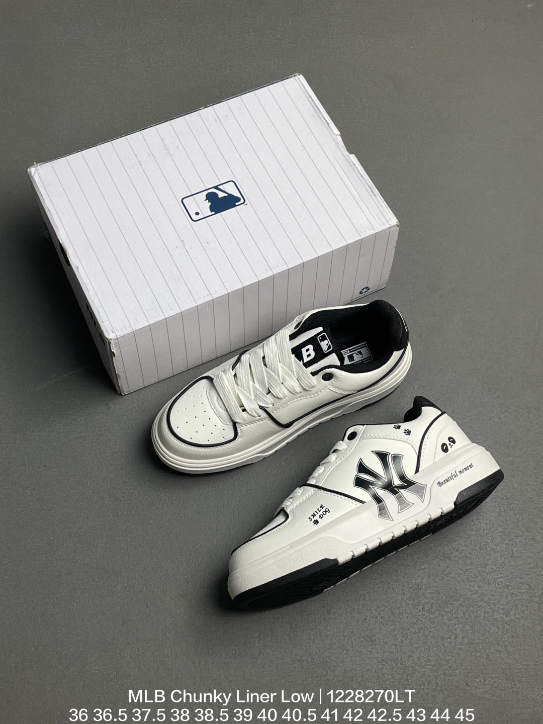MLB 韩国F F旗下运动品牌 采用厚实粒面牛剖革组合厚实纤维革鞋面材质 高密度5cm厘米外增高轻质发泡中底组合耐磨橡胶外底片学院穿搭爆款 Korea韩国限定 联乘美国榄球洋基队New York Yankees x MLB Chunky Liner Low 学长鞋系列低帮老爹风轻量增高厚底百搭休闲运动板鞋