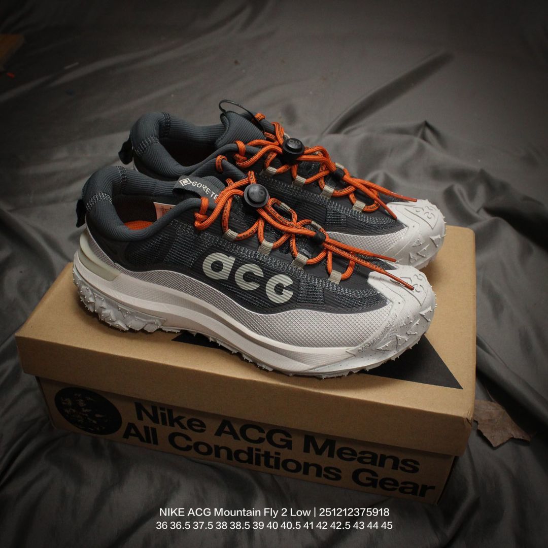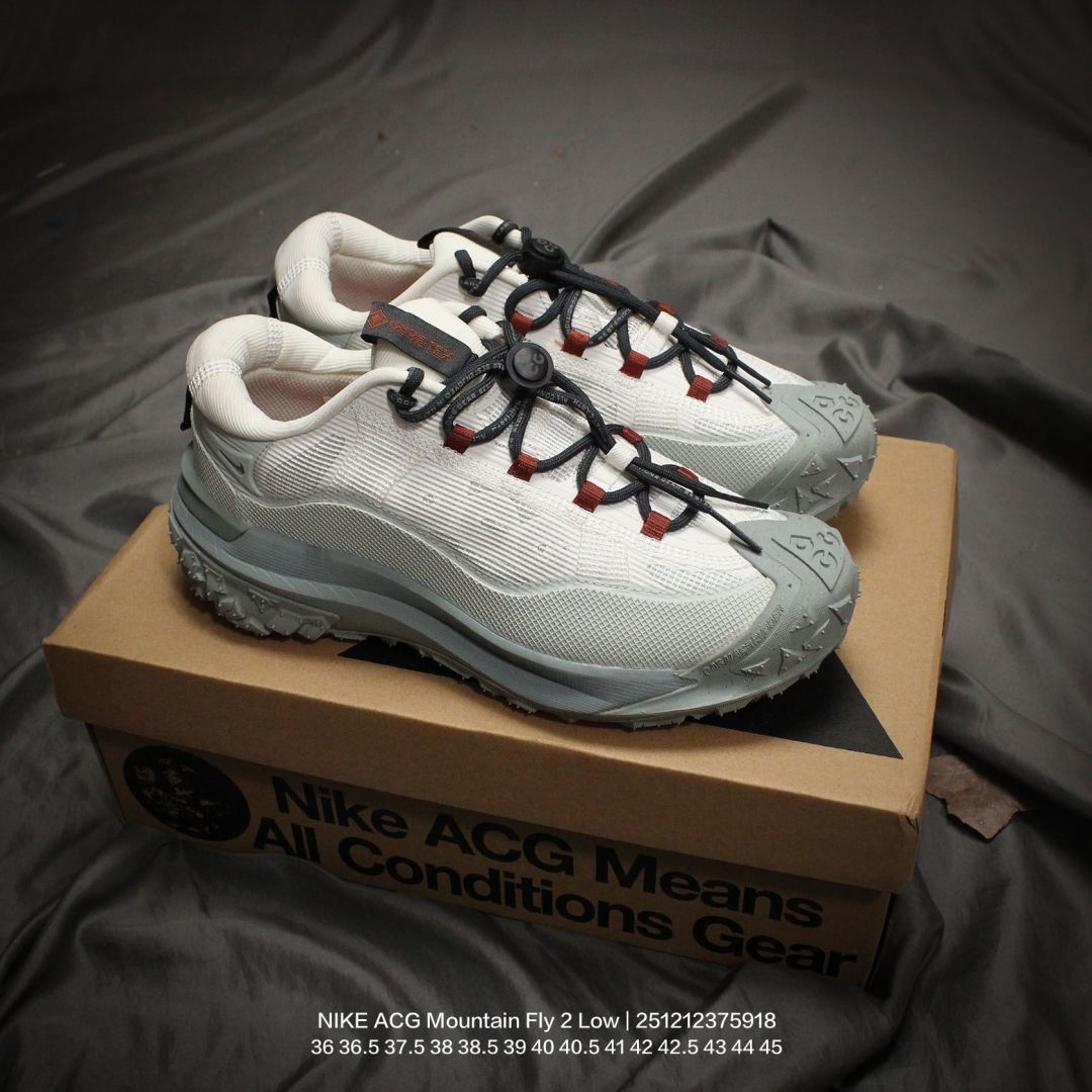 Nike 耐克 男女鞋真标半码制 升级原楦原纸版开发版型 采用同源一致网状防撕裂面料制成鞋面材质 内里嵌入定型海绵 嵌入React瑞亚泡棉缓震中底 外置锯齿防滑耐磨橡胶大底全新户外鞋款 耐克NIKE ACG Mountain Fly 2 Low Sail Earth ACG山脉2代系列低帮户外登山越跑徒步休闲运动鞋 网布米白酒红