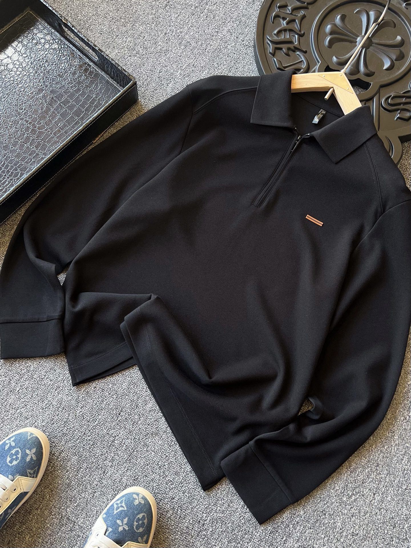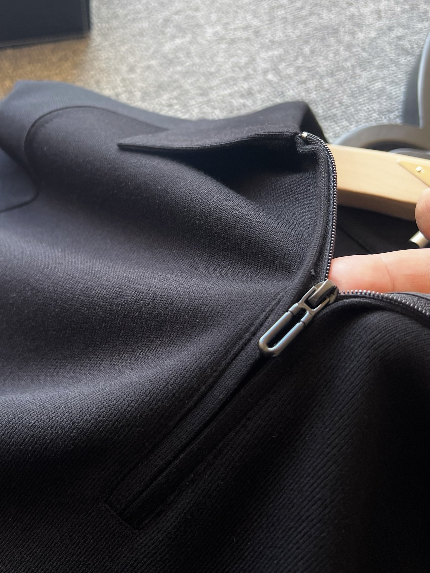 细节细节再细节 Zegna家商场新款卫衣款长袖翻领Polo衫 半拉链设计 非常有味道 YKK代工哑光烤漆金属拉手袢 胸前标志性杰尼亚棕黑棕组合浮雕立体硅胶线条 摸起来带有层次感 十分精致 双肩下方做了拼接以及双针压线 高端设计