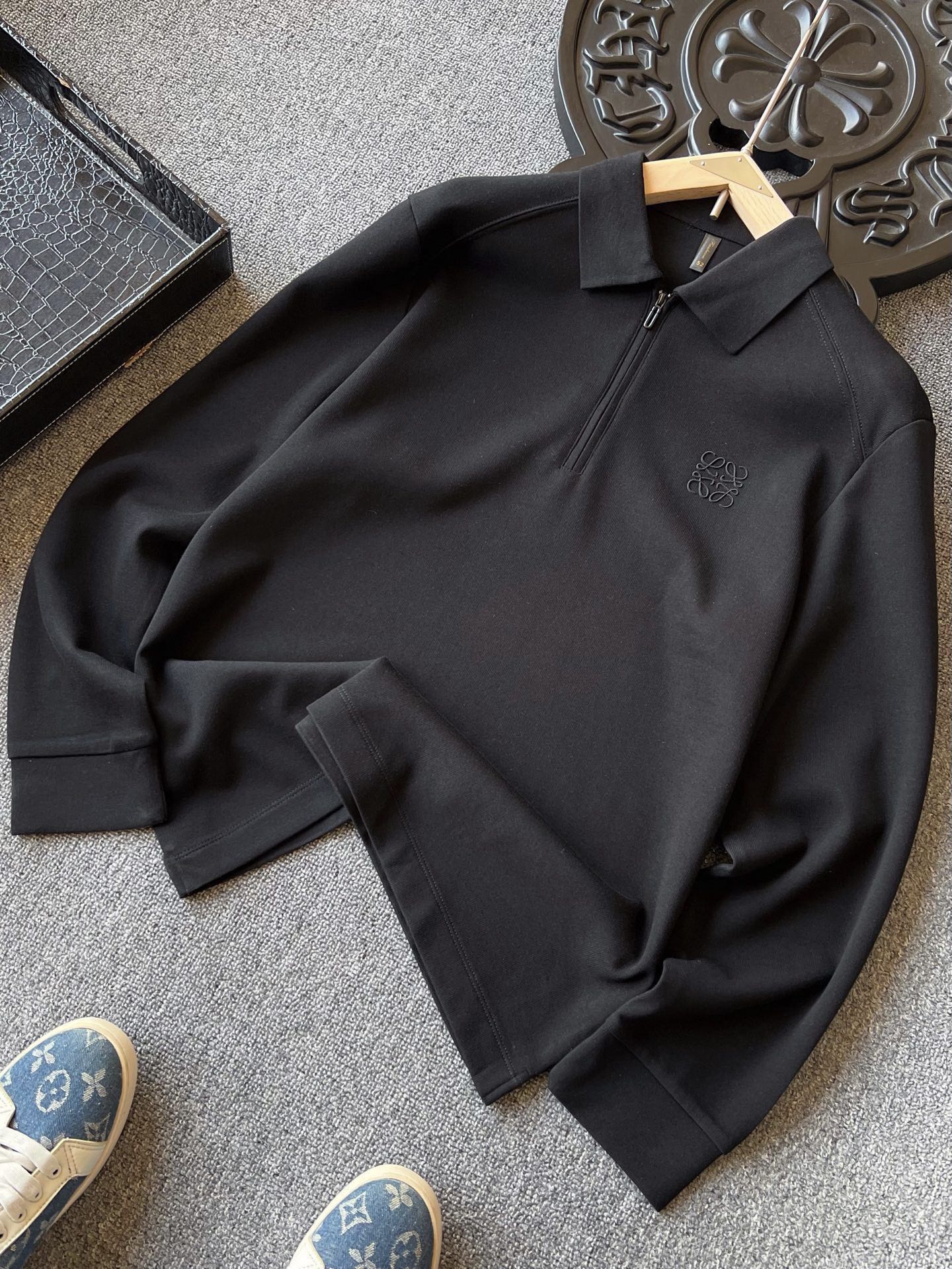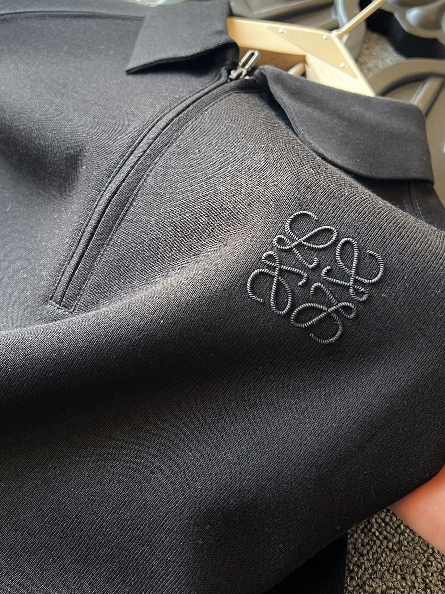 细节细节再细节 Loewe家商场新款卫衣款长袖翻领Polo衫 半拉链设计 非常有味道 YKK代工哑光烤漆金属拉手袢 胸前3D立体浮雕罗意威硅胶小标 表层做了激光浮雕工艺 十分精致 双肩下方做了拼接以及双针压线 高端设计