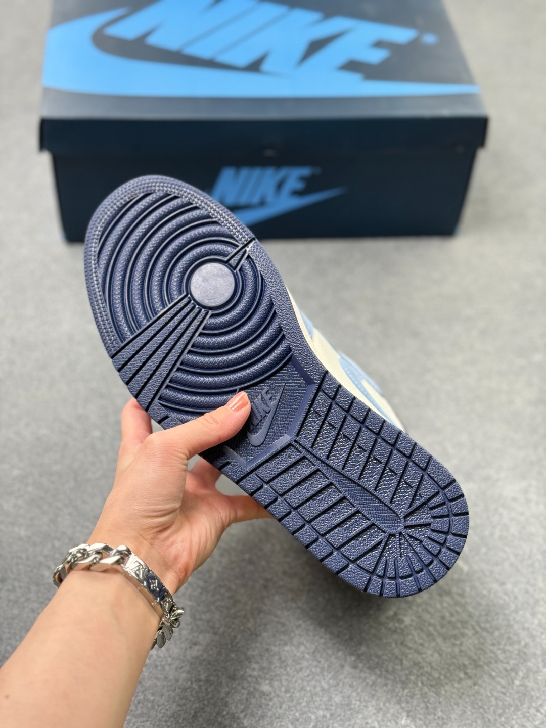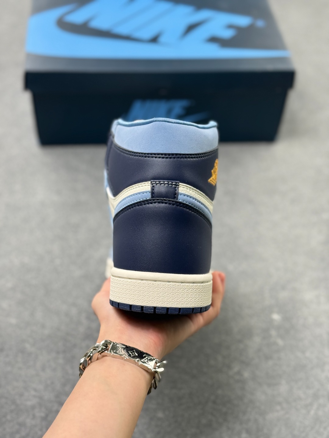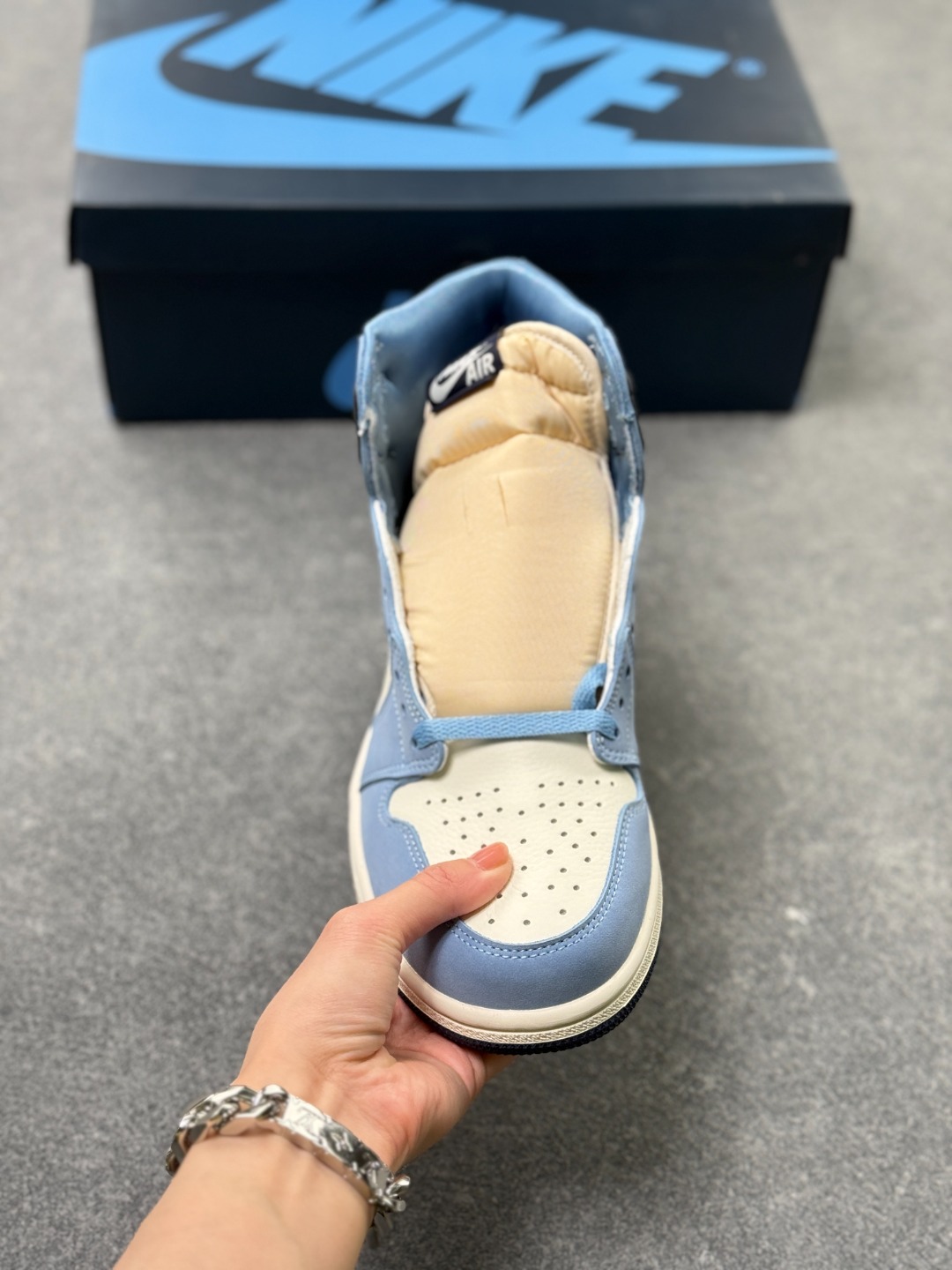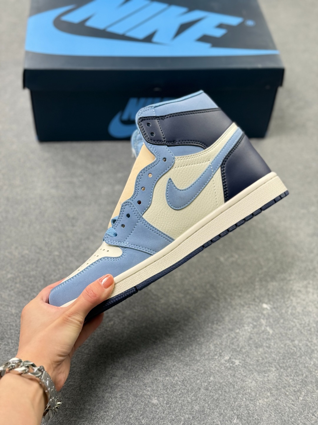 Air Jordan 1 High OG First in Flight 高帮 蓝白 AJ1 乔丹1代 aj1 乔1 高邦 北卡蓝 乔丹篮球鞋系列 构色采用北卡蓝 黑曜石色以及米白色进行搭配 整体看起来比较协调 北卡蓝致敬Jordan的母校 同时鞋款还有另外一个主题 向莱特兄弟1903年的首次飞行致敬 作为北卡罗来纳州的两大传奇 这波致敬的格局算是拉满了 鞋头部分的北卡蓝磨砂皮 配合米白色部分的荔枝纹皮革 质感相当讨喜 鞋舌黑色绣标上Nike Swoosxh Logo白色刺绣呈现 在后跟和鞋帮处加入的黑曜石色 增加视觉层次同时兼顾整体颜值表现 鞋身两侧Swoosh Logo采用蓝色点缀 鞋帮侧面的黄色Wings Logob略显出戏 不过作为细节点缀总体瑕不掩瑜 值得一提的是本次的鞋垫上满印了 AJ 23 字样 菱形是北卡校队球衣的经典图案 呼应鞋款主题