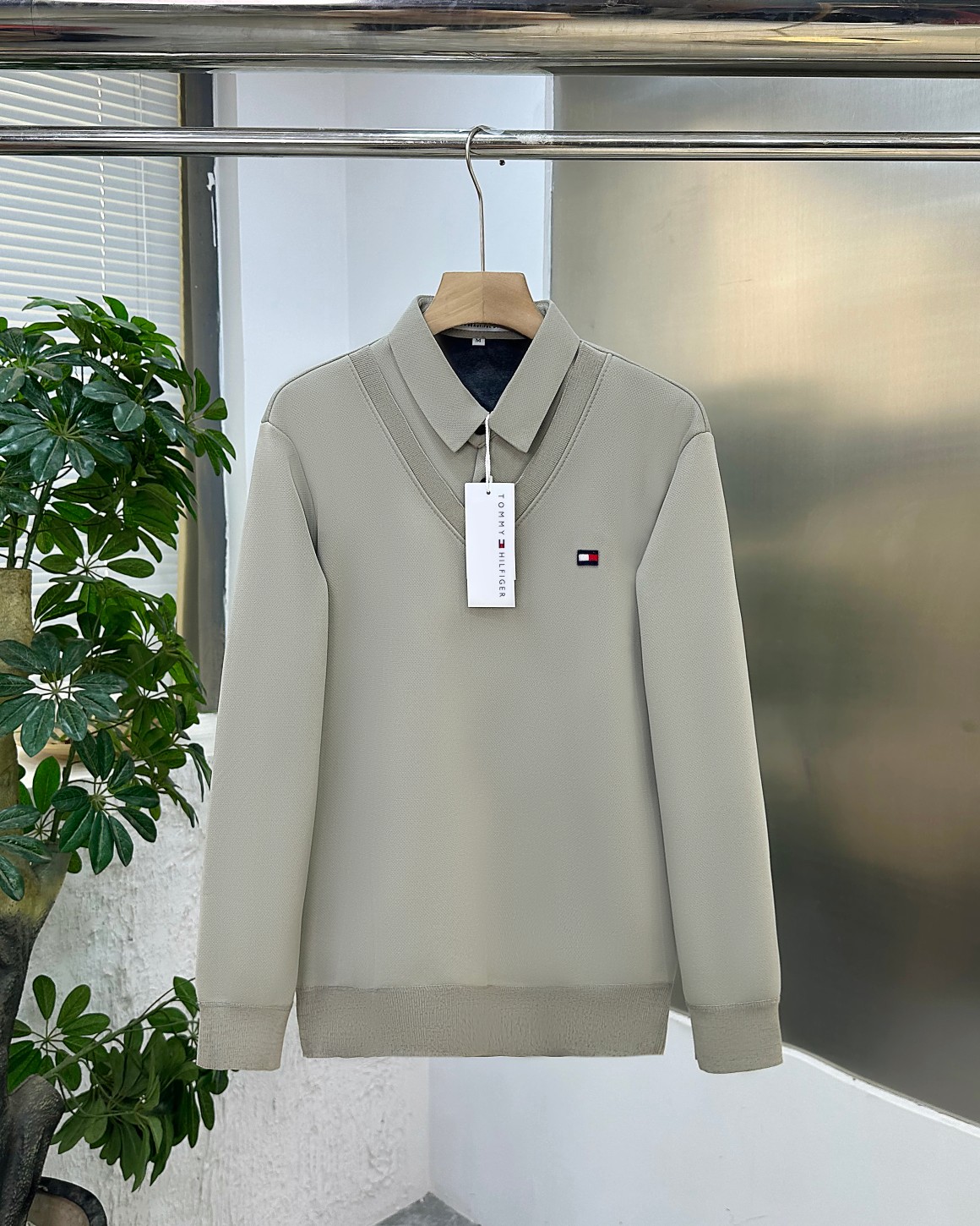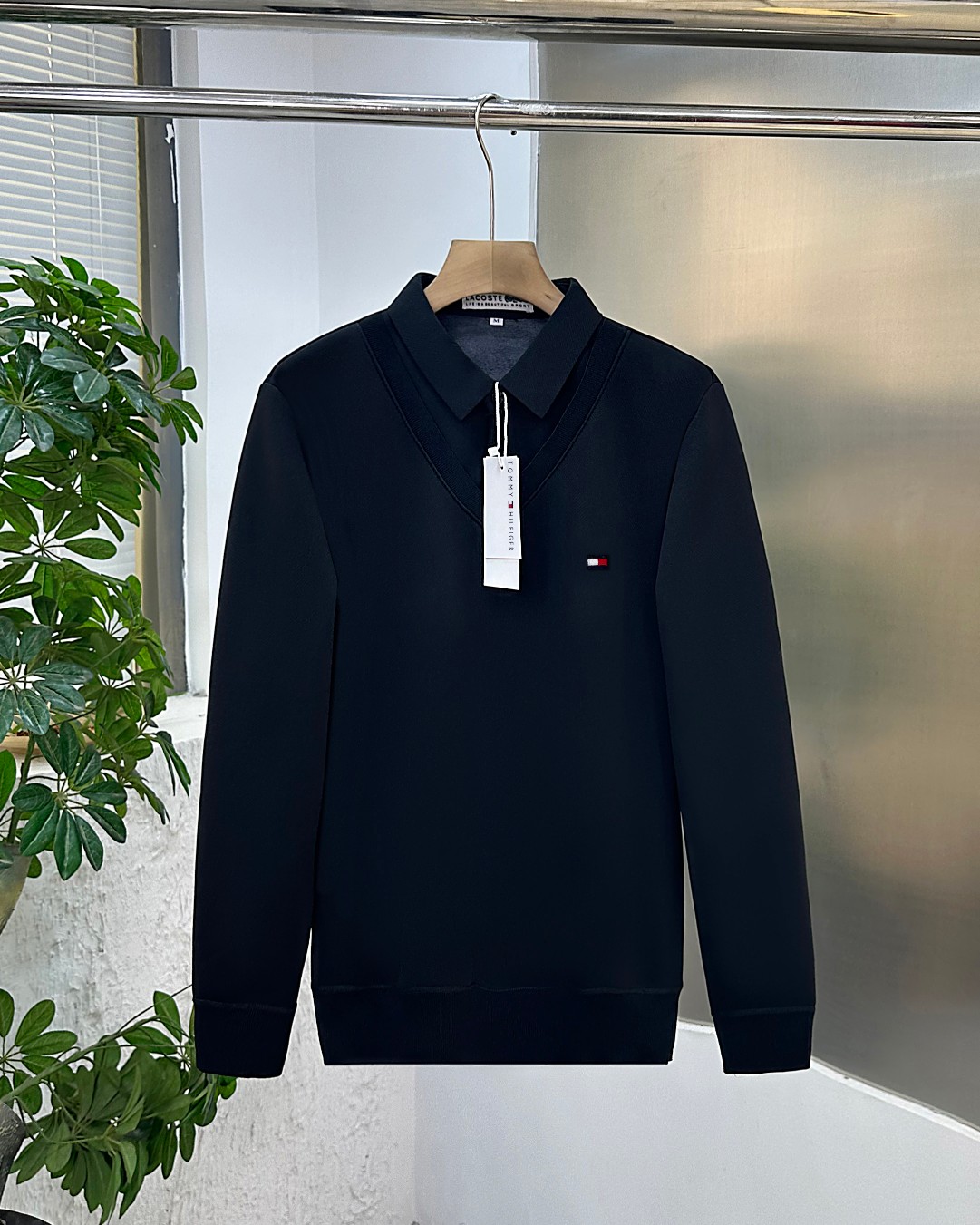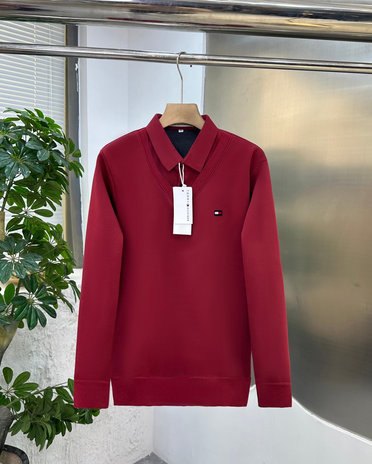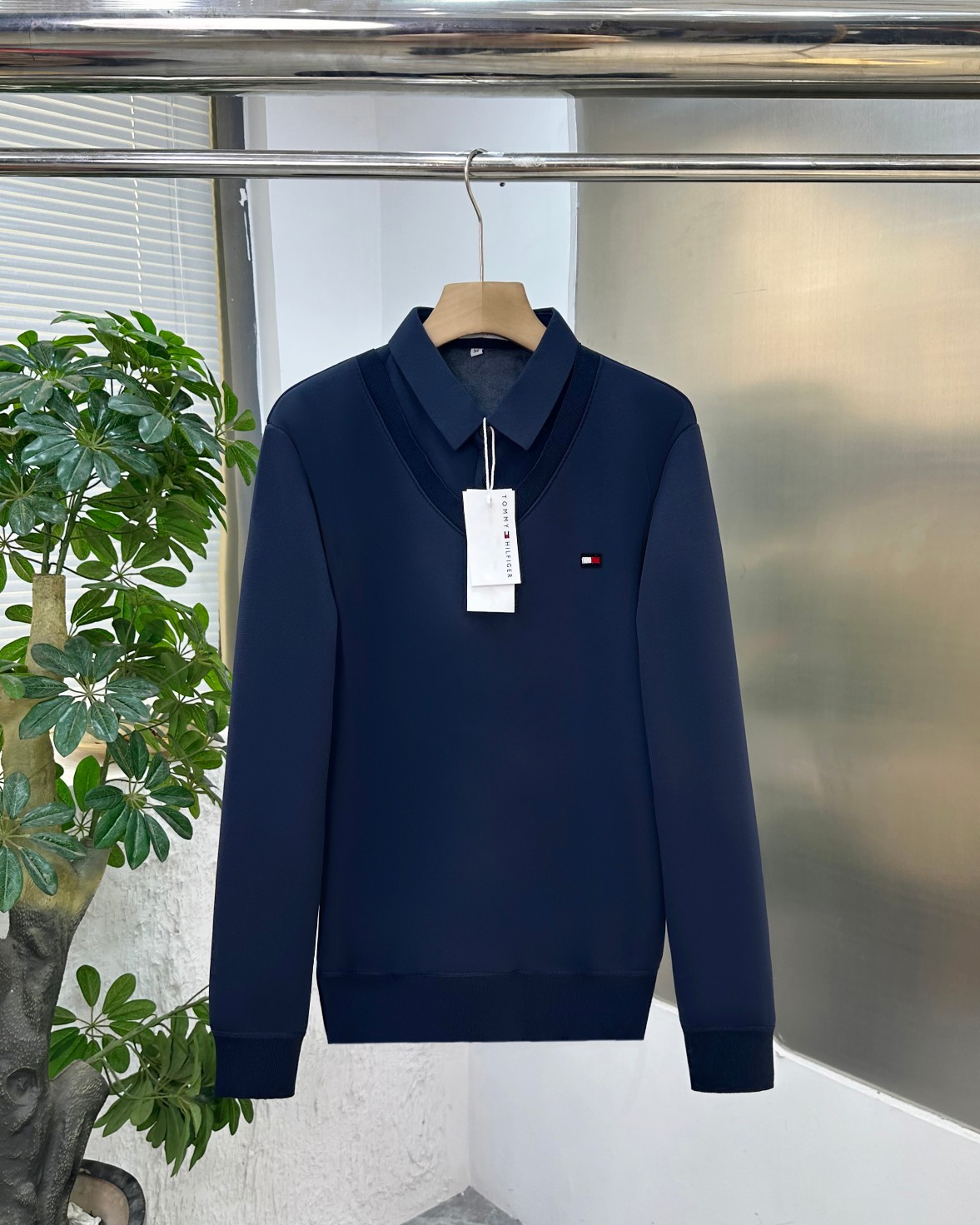 TOMMY HILFGER 汤米男士冬季衬衫领纯色休闲商务水貂绒加厚假两件针织衬衫
