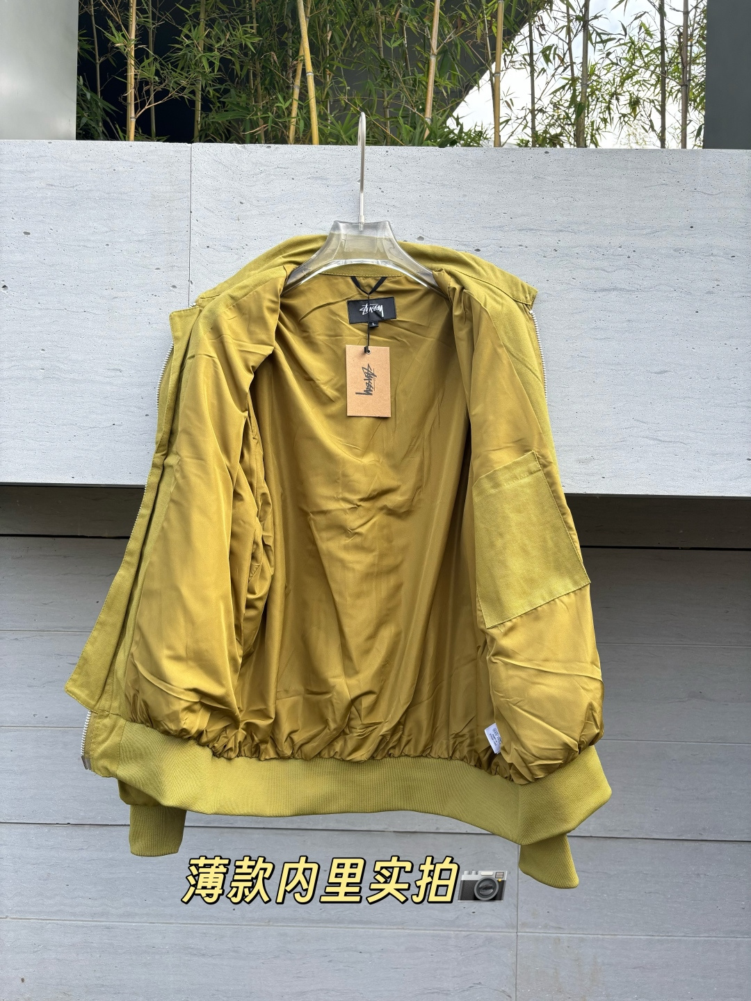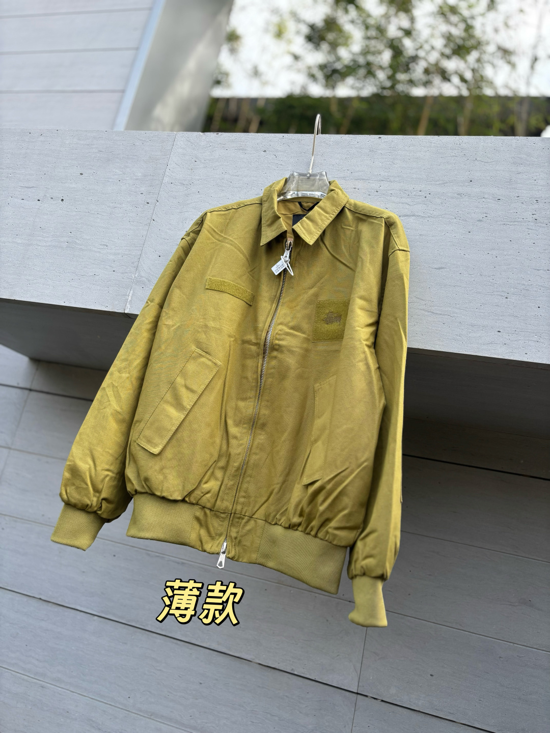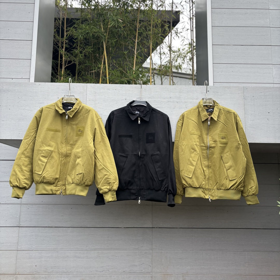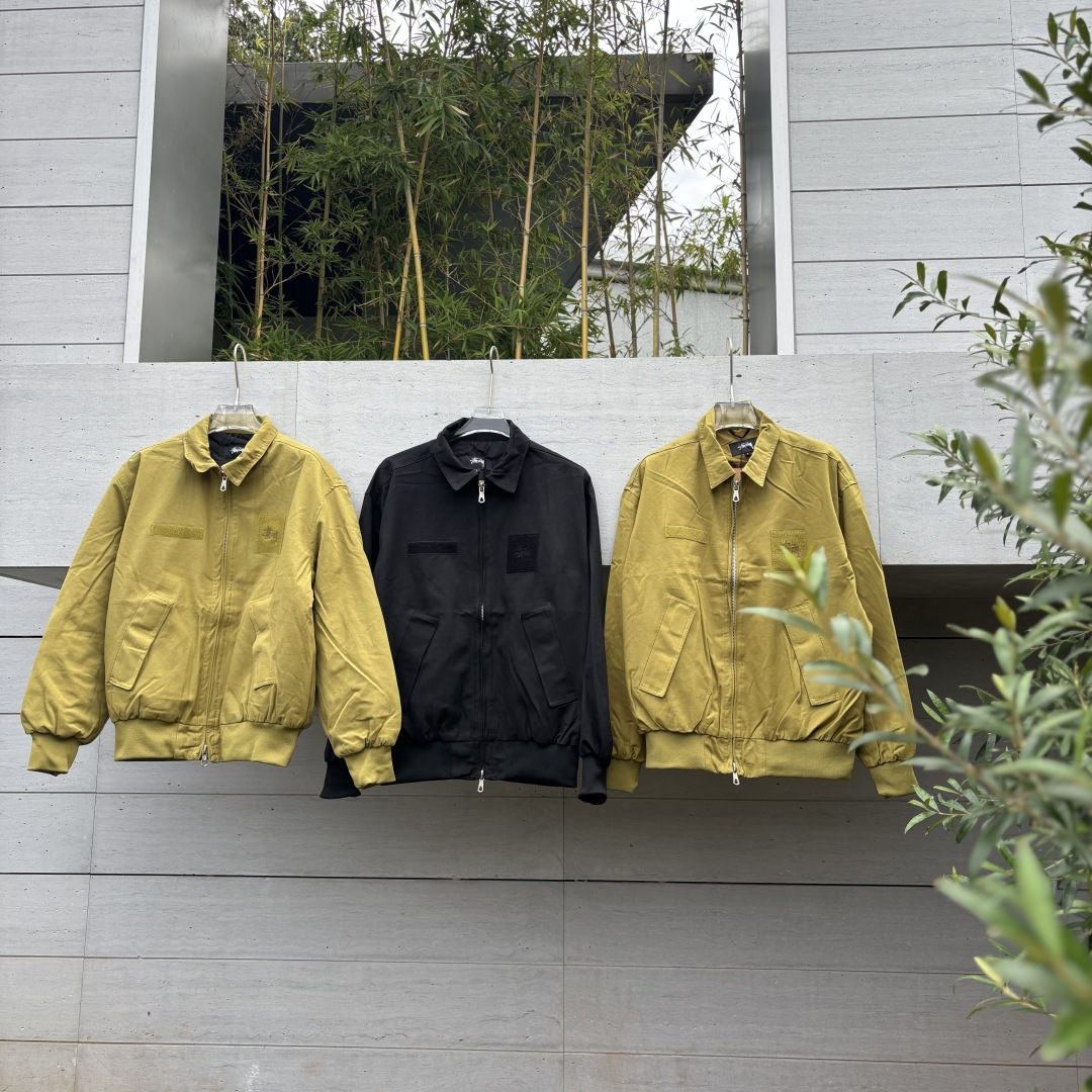 新款 𝗦𝘁𝘂𝘀𝘀𝘆 斯图西 罗纹边拉链翻领徽标宽松美式复古夹克外套 𝗦𝘁𝘂𝘀𝘀𝘆今年终于带来一好看的新款飞行夹克了 上身最好看还得属这个金橄榄配色 实物比图片亮一些 设计上增加了翻领和魔术贴的设计 用料比想象中的薄 内里没有填充物 拉链用了故意做旧氧化的复古效果