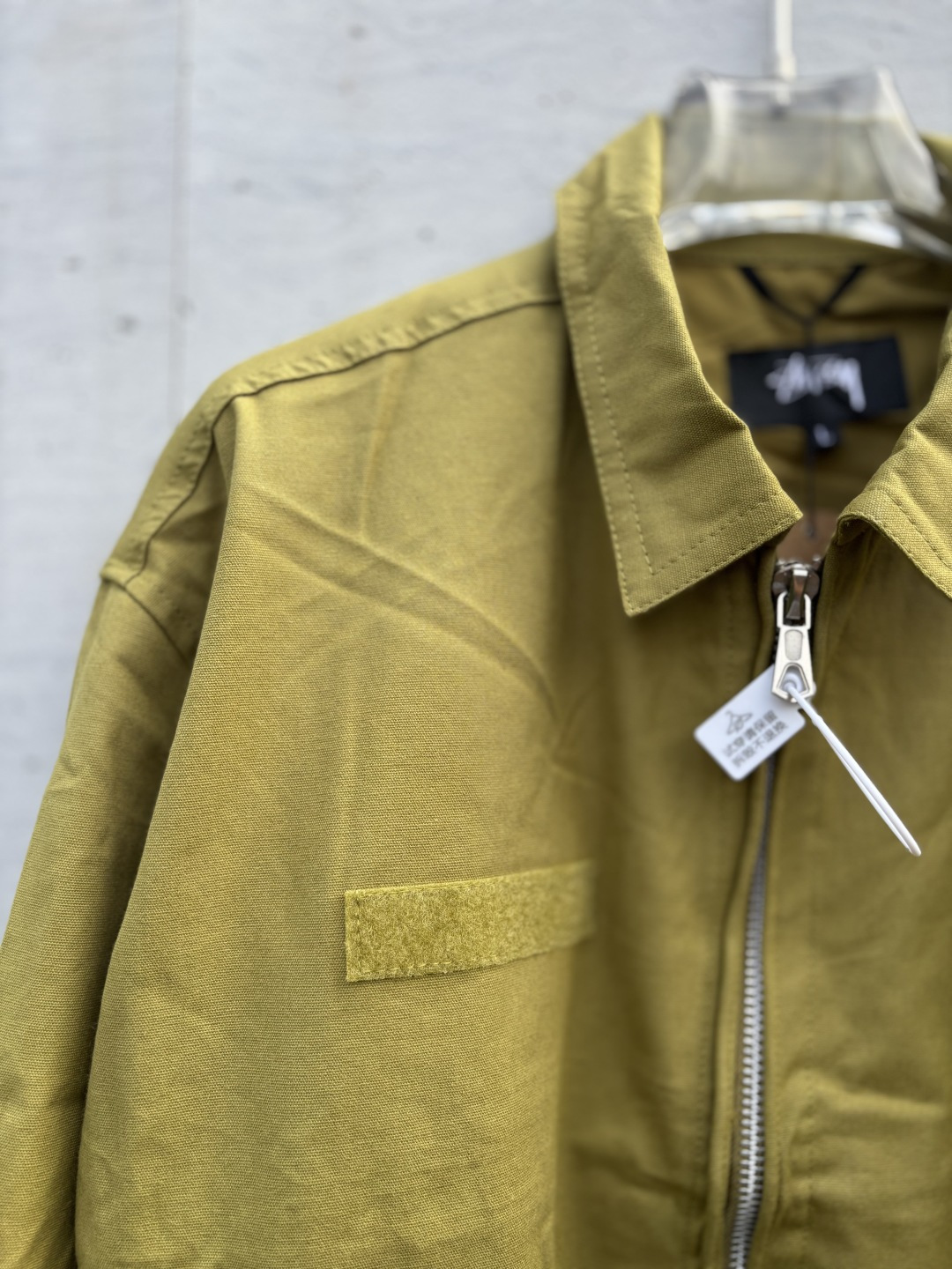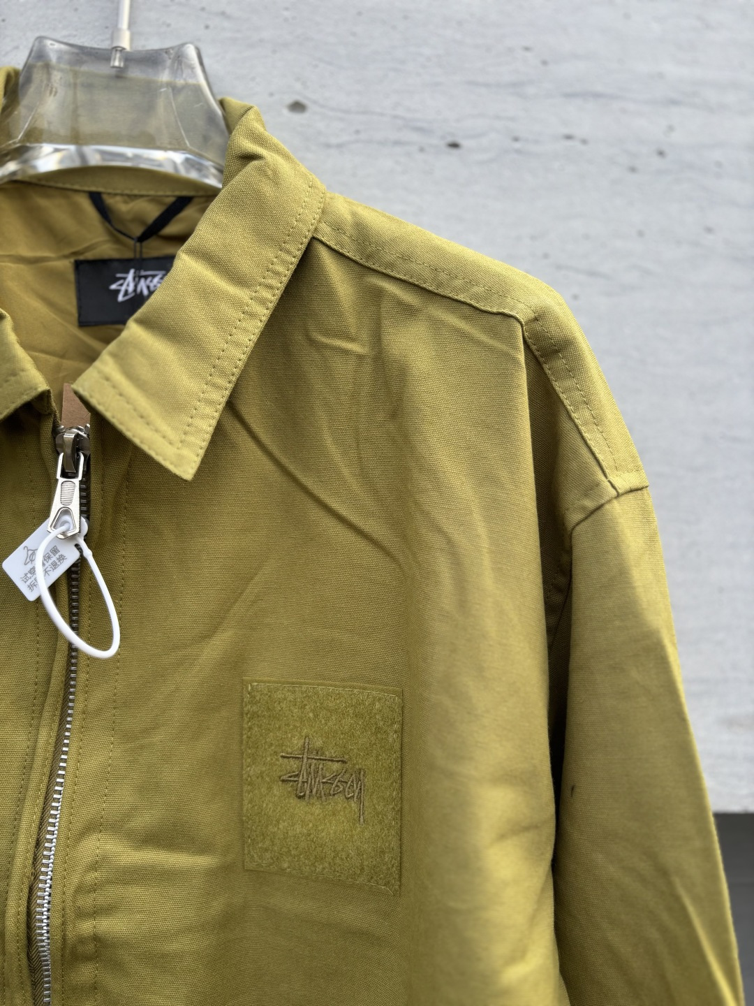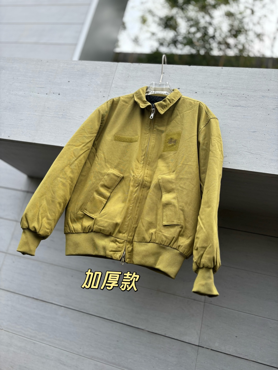新款 𝗦𝘁𝘂𝘀𝘀𝘆 斯图西 罗纹边拉链翻领徽标宽松美式复古夹克外套 𝗦𝘁𝘂𝘀𝘀𝘆今年终于带来一好看的新款飞行夹克了 上身最好看还得属这个金橄榄配色 实物比图片亮一些 设计上增加了翻领和魔术贴的设计 用料比想象中的薄 内里没有填充物 拉链用了故意做旧氧化的复古效果