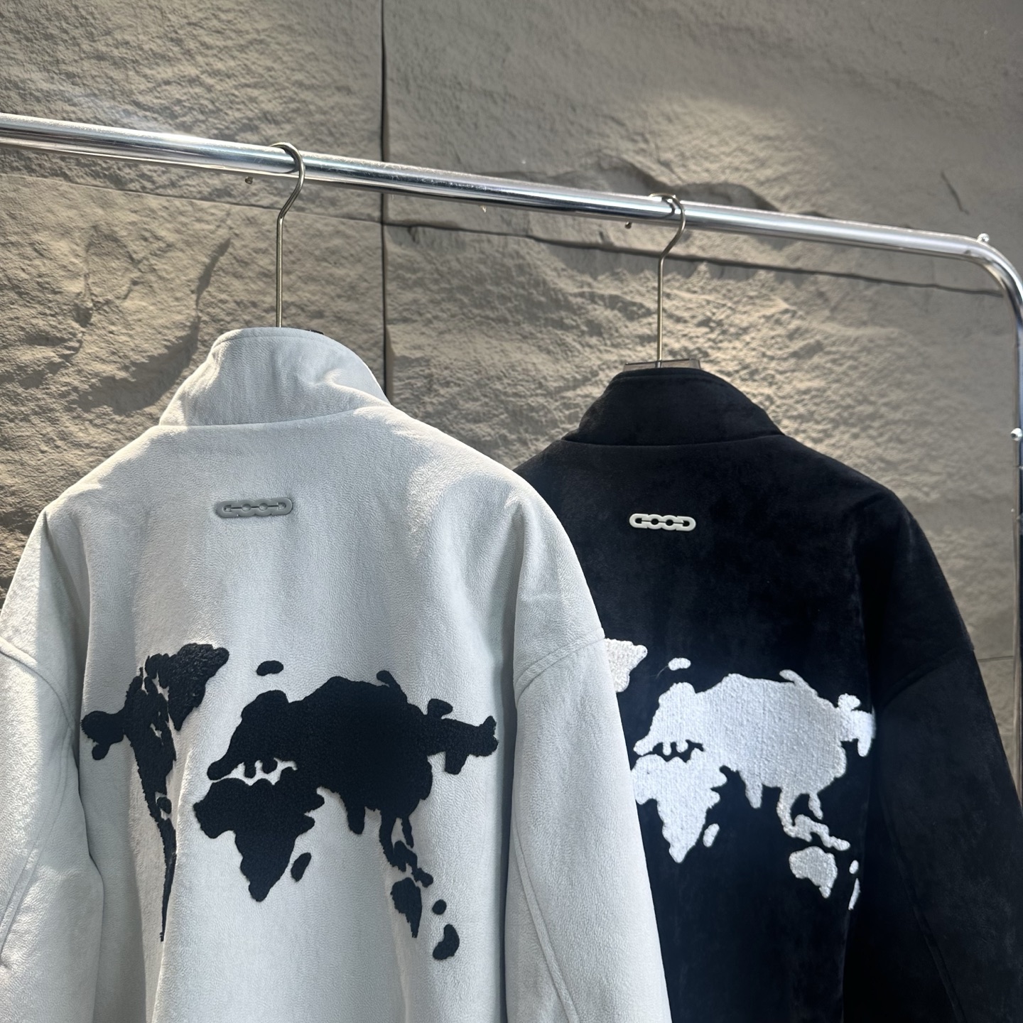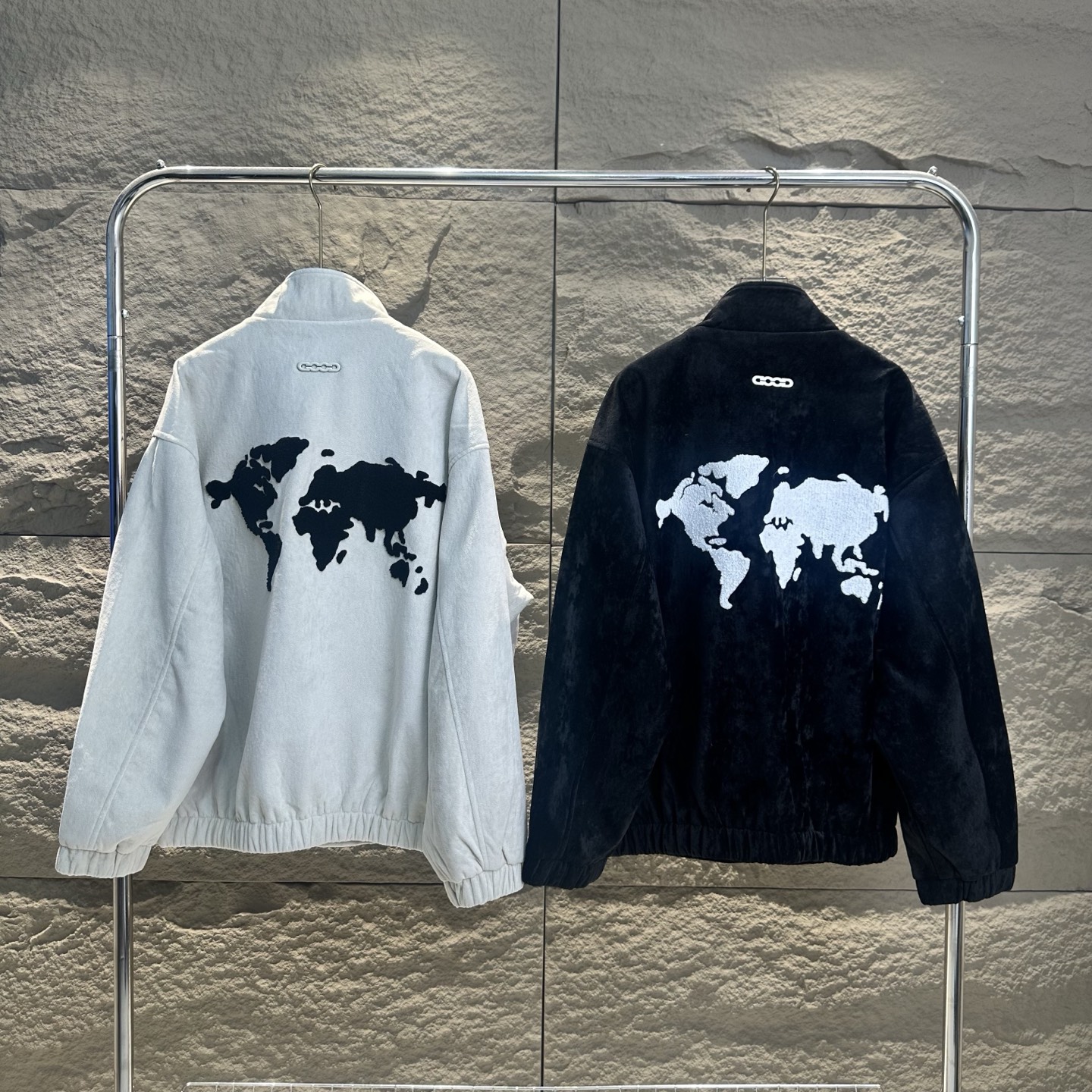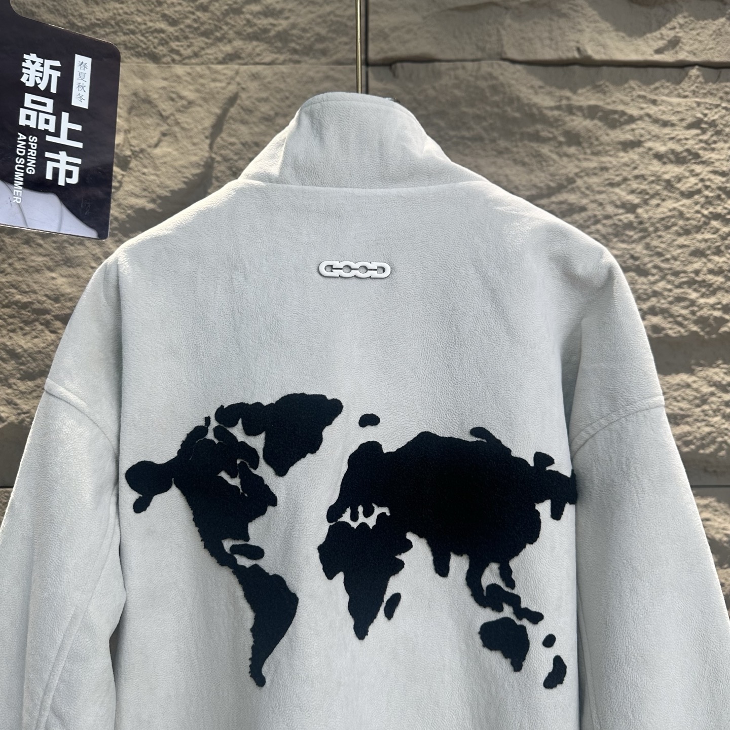 胸前的品牌小标低调有辨识度 后背的世界地图刺绣瞬间拉满视觉张力 米色柔和 黑色酷飒 两种色调精准戳中潮流审美 立领拉链设计利落有型