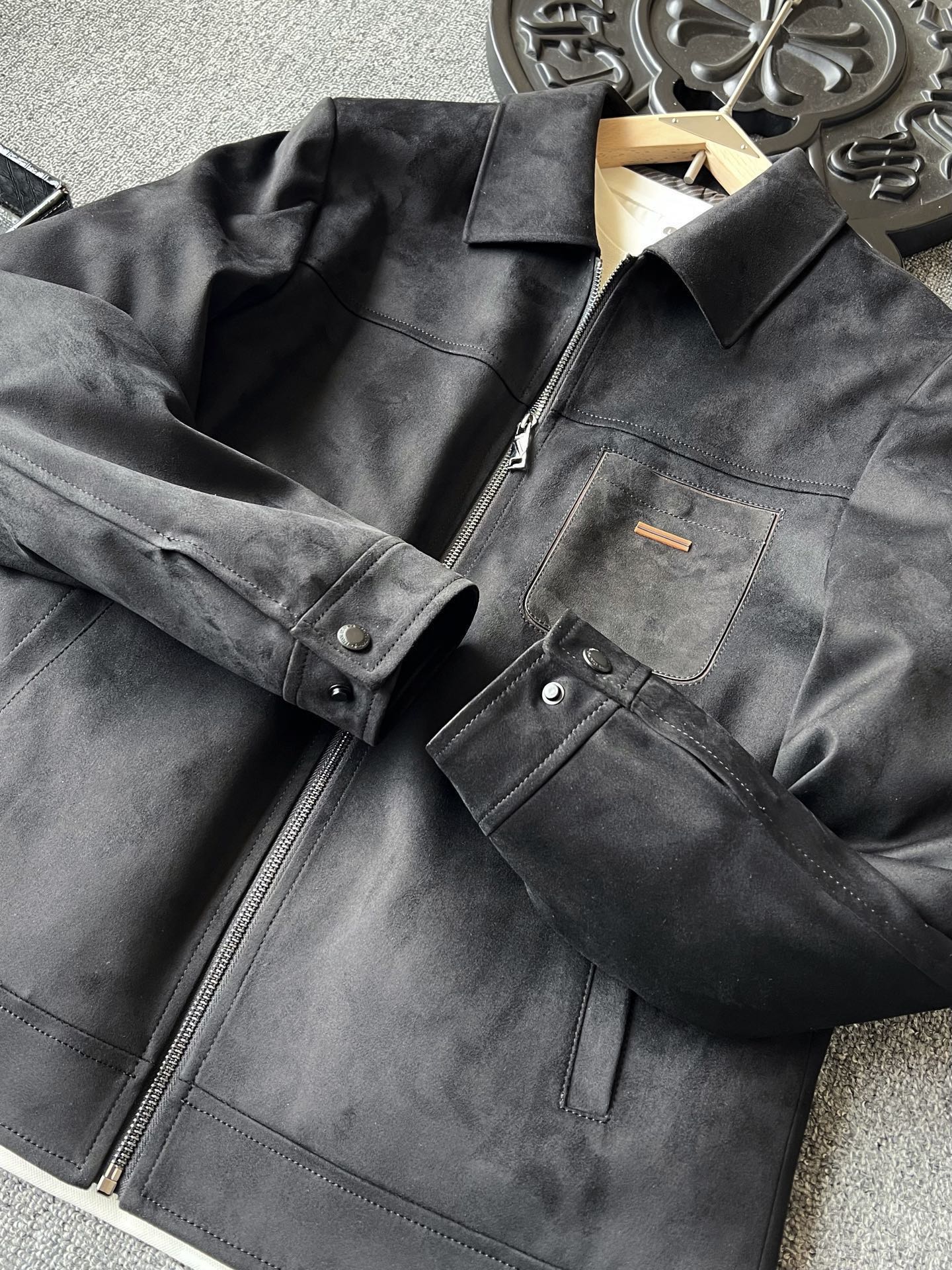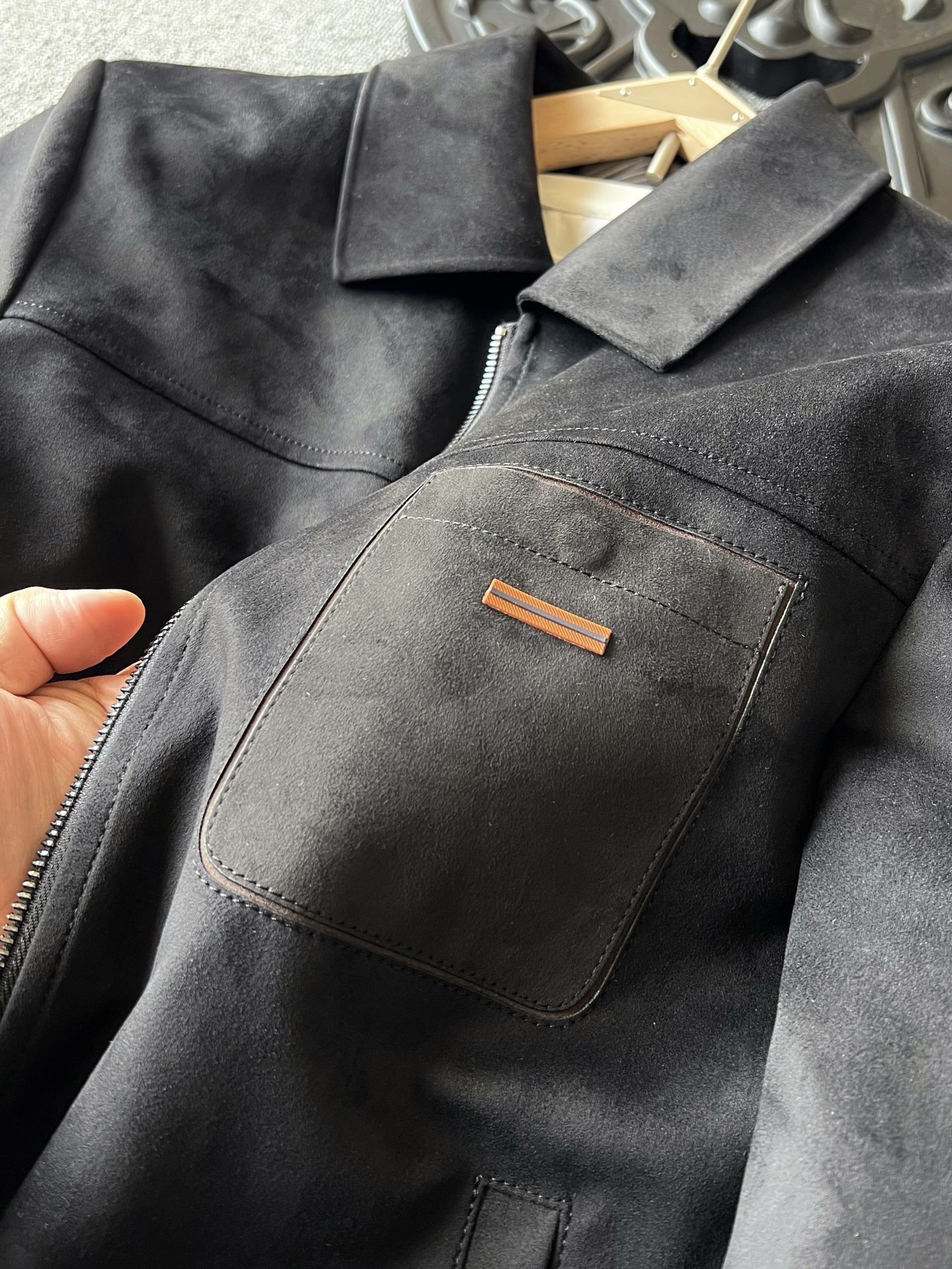 细节细节再细节 Zegna家商场新款麂皮羽绒服 胸前切割二次缝线口袋设计配套磁吸纽扣 口袋上带有标志性杰尼亚棕黑棕组合浮雕立体硅胶线条 摸起来带有层次感 十分精致 多处拼接工艺 上身质感有型