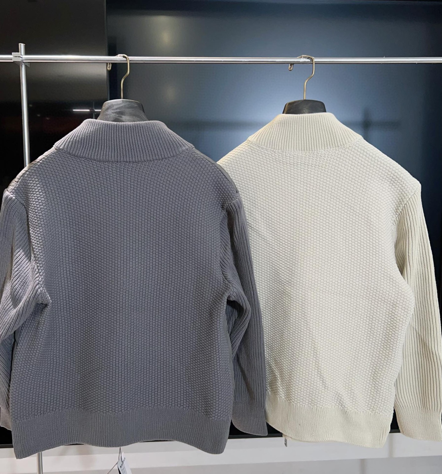 袖管和后背采用高密度针织拼接 袖管是粗针竖条纹 显得手臂修长 后背是菠萝纹状的针织纹路 工艺繁琐 但面料非常柔软 采用86 成分的棉 更加不易起球 保证了舒适度