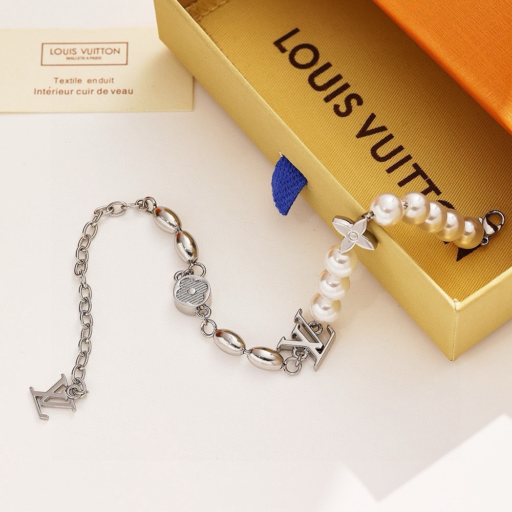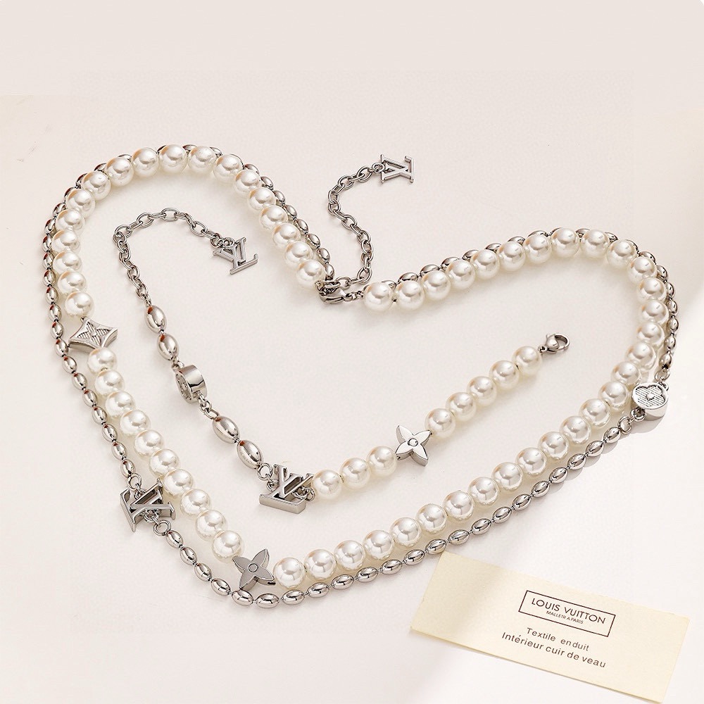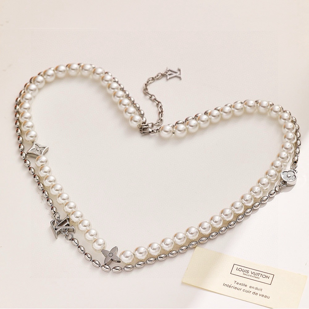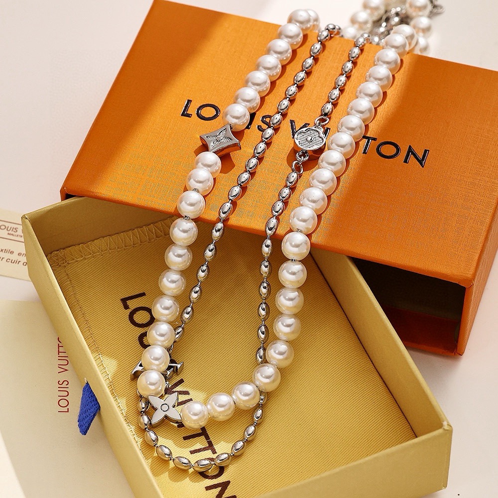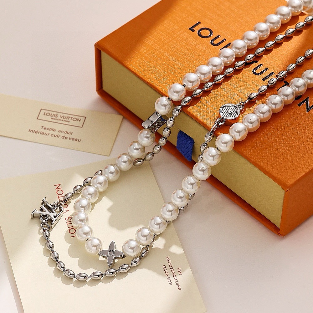 LV路易威登波珍珠项链 配全套包装 Pearls Fusion 项链以玻璃珠饰和金属串珠演绎层叠设计 将 Monogram 花卉铭纹装饰和 LV 元素穿插其间 LV 字母点缀可调节链条 彰显风靡当季的丹迪潮流