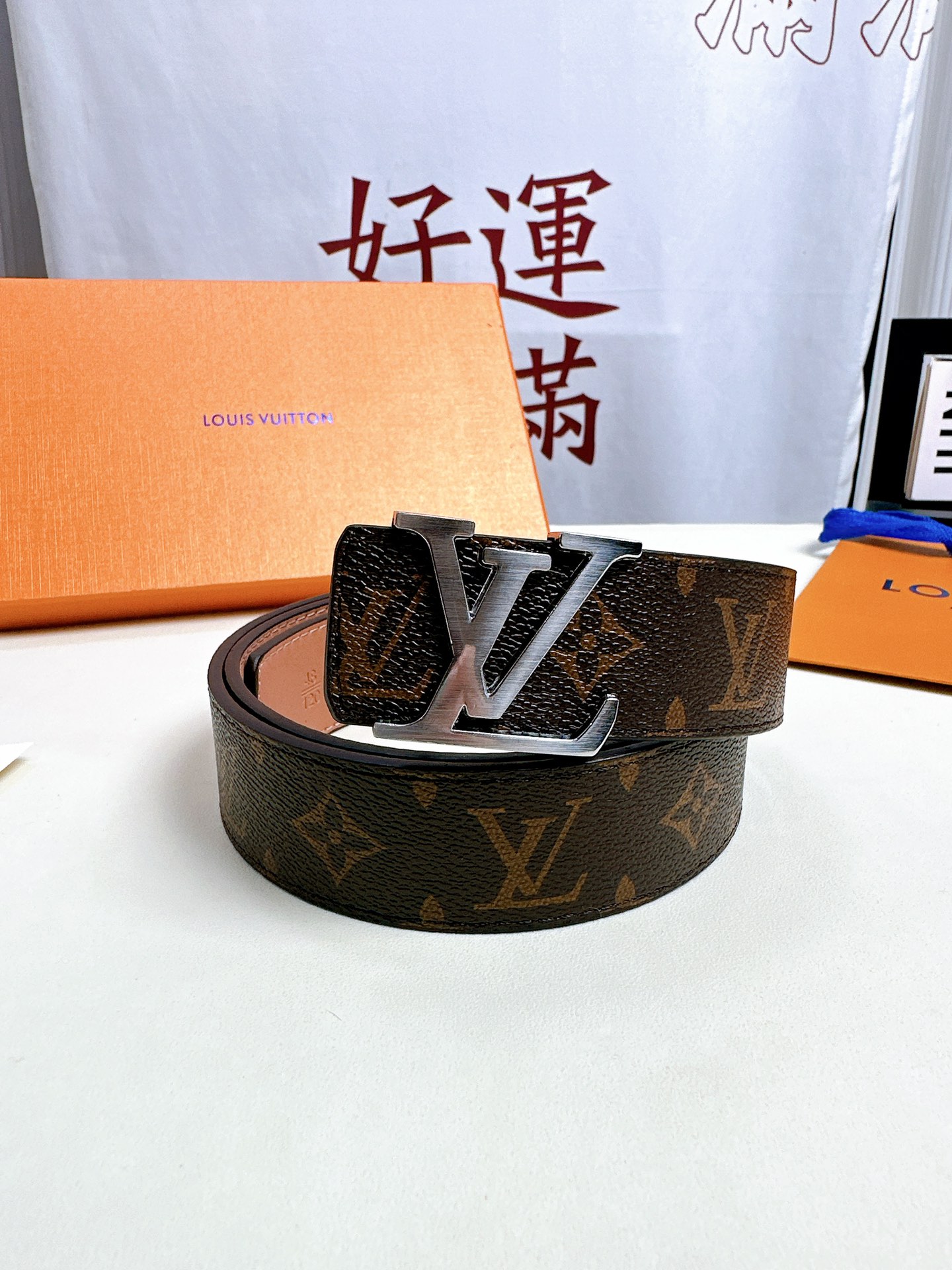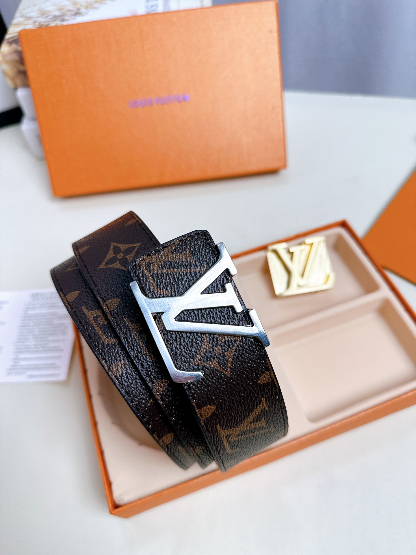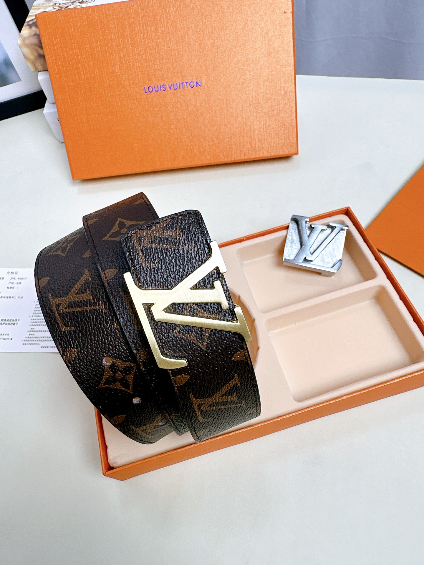 尖叫 上新 高品质 LOUIS VUITTON路易威登 LV 双扣男士皮带腰带礼盒 色号打孔器螺丝刀手提袋发票 二层牛皮真皮带身搭配经典老花图案 一个金扣一个银扣 两个不同风格的铜扣扣头 一个套盒两条皮带 送人自留都OK 尺寸 120cm带身
