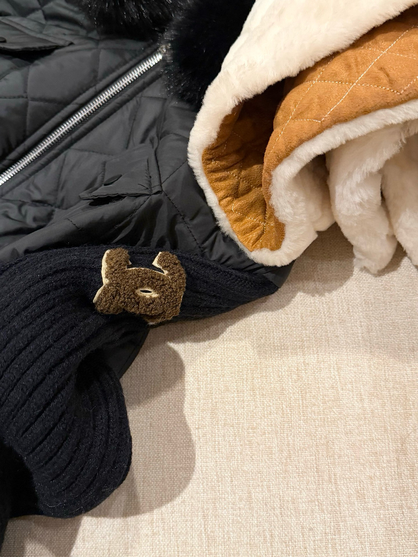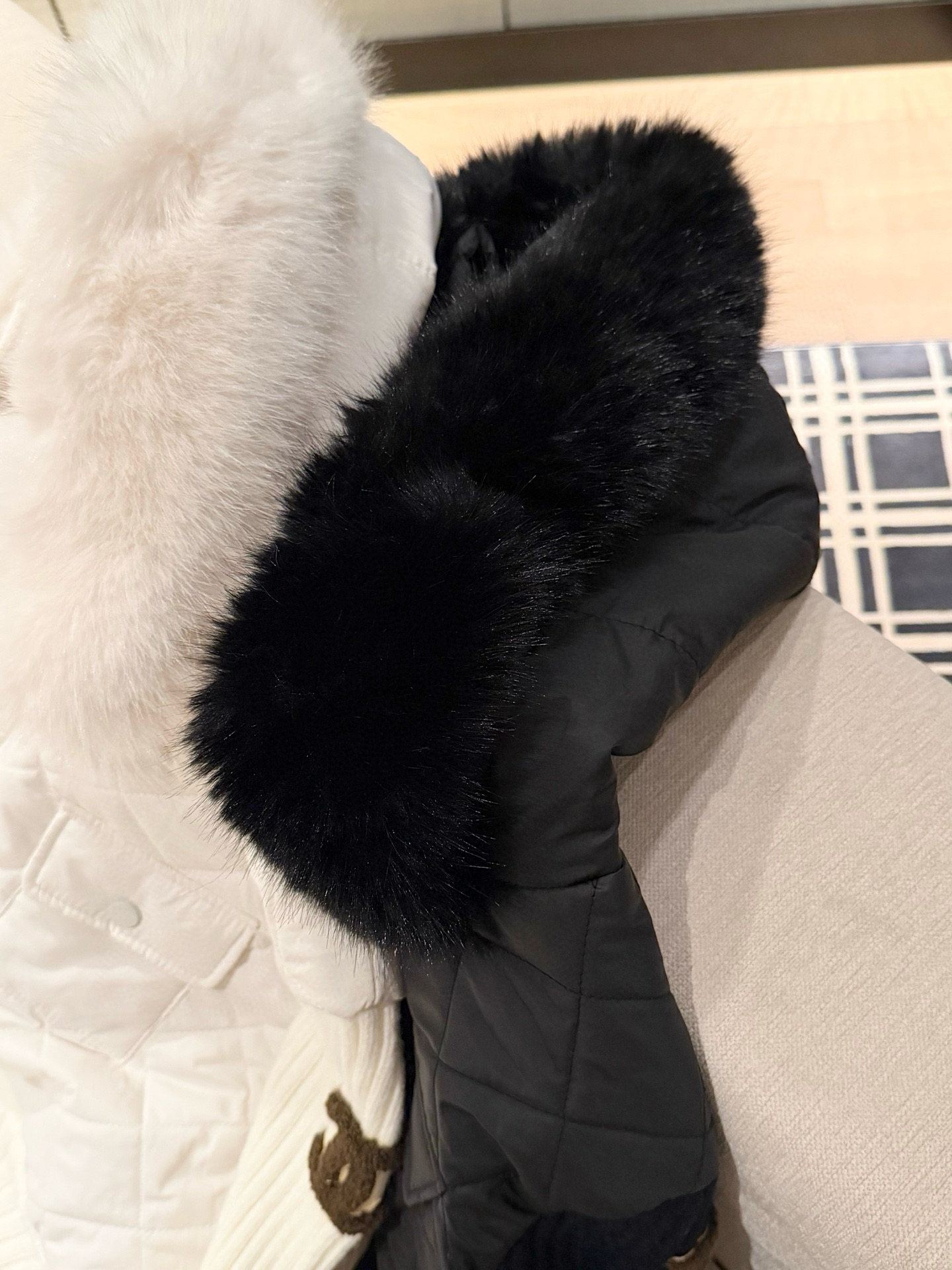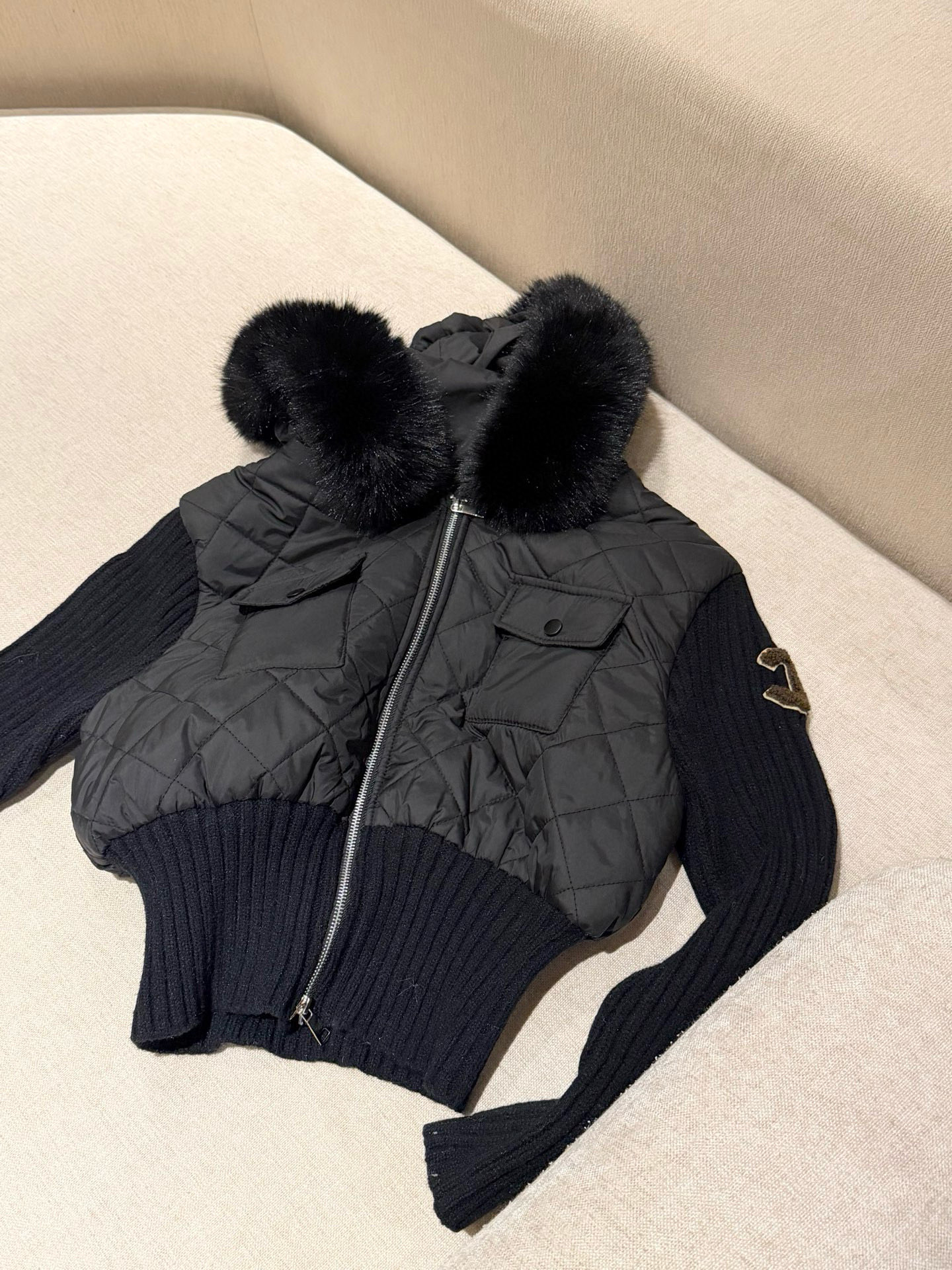 Chanel香奈儿小香双C立体毛巾绣花针织毛衣拼接双头拉链可拆卸毛领连帽菱格夹棉外套