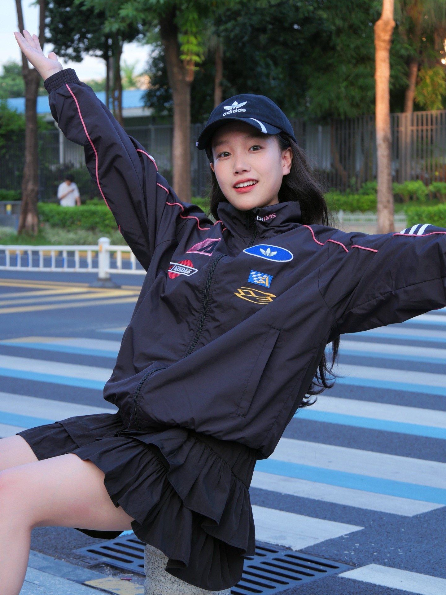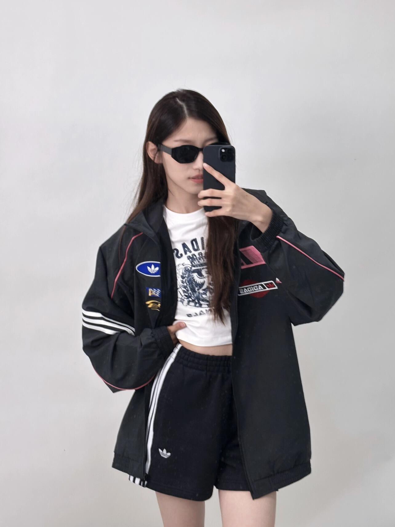 胸前有各种赛车风格的徽章贴片 像赛车队标志 个性十足 背后有 ADIDAS Originals 字样 辨识度高