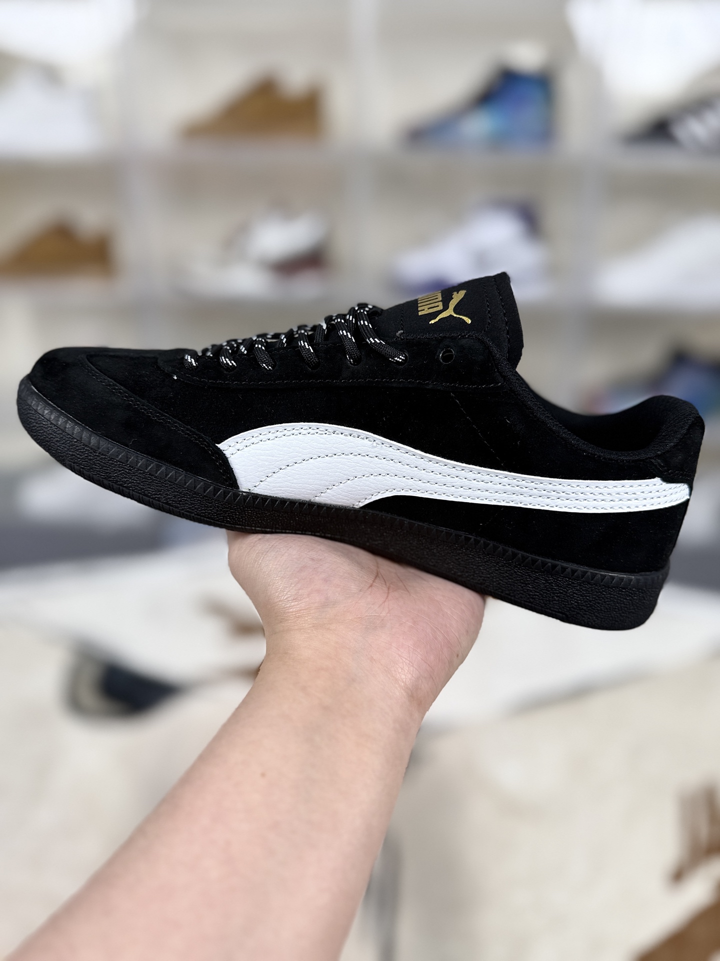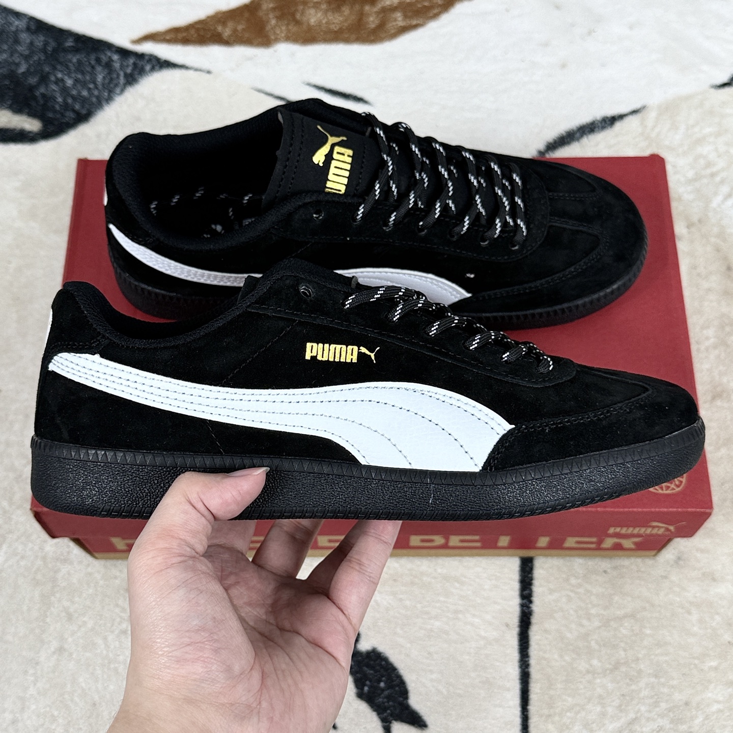 PUMA彪马9 T SUEDE德训鞋是品牌旗下融合复古风格与现代设计的德训鞋款 延续德训鞋经典基因 以上世纪70 80年代西德联邦国防军室内训练鞋为原型 保留修长鞋型 厚实鞋底等标志性元素 同时融入现代时尚感 定位为兼具舒适性与潮流感的日常穿搭鞋款 鞋面采用优质麂皮或翻毛皮材质 触感柔软细腻 兼具质感与耐磨性 鞋底搭载橡胶大底 纹路设计灵感来源于赛车轮胎或传统德训鞋 抓地力强 防滑性能出色 同时提供良好的缓震效果 行走或运动时脚感舒适 鞋垫采用记忆海绵或轻质EVA泡棉材质 具备良好的回弹性和透气性 有效缓冲脚部压力 长时间穿着不易疲劳 适合日常通勤 休闲逛街 轻运动等多种场景 既能搭配牛仔裤 运动裤展现休闲随性 也能与西装裤 半身裙搭配 营造复古时尚氛围 是 一鞋多穿 的实用之选