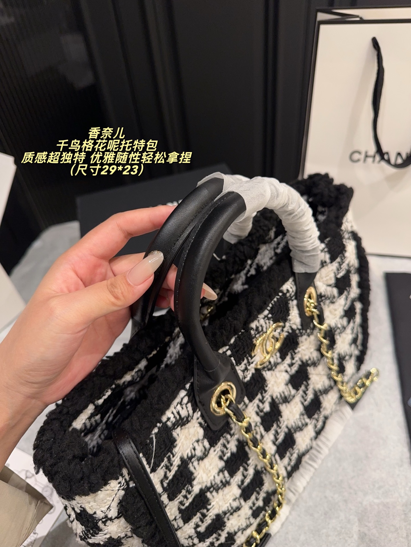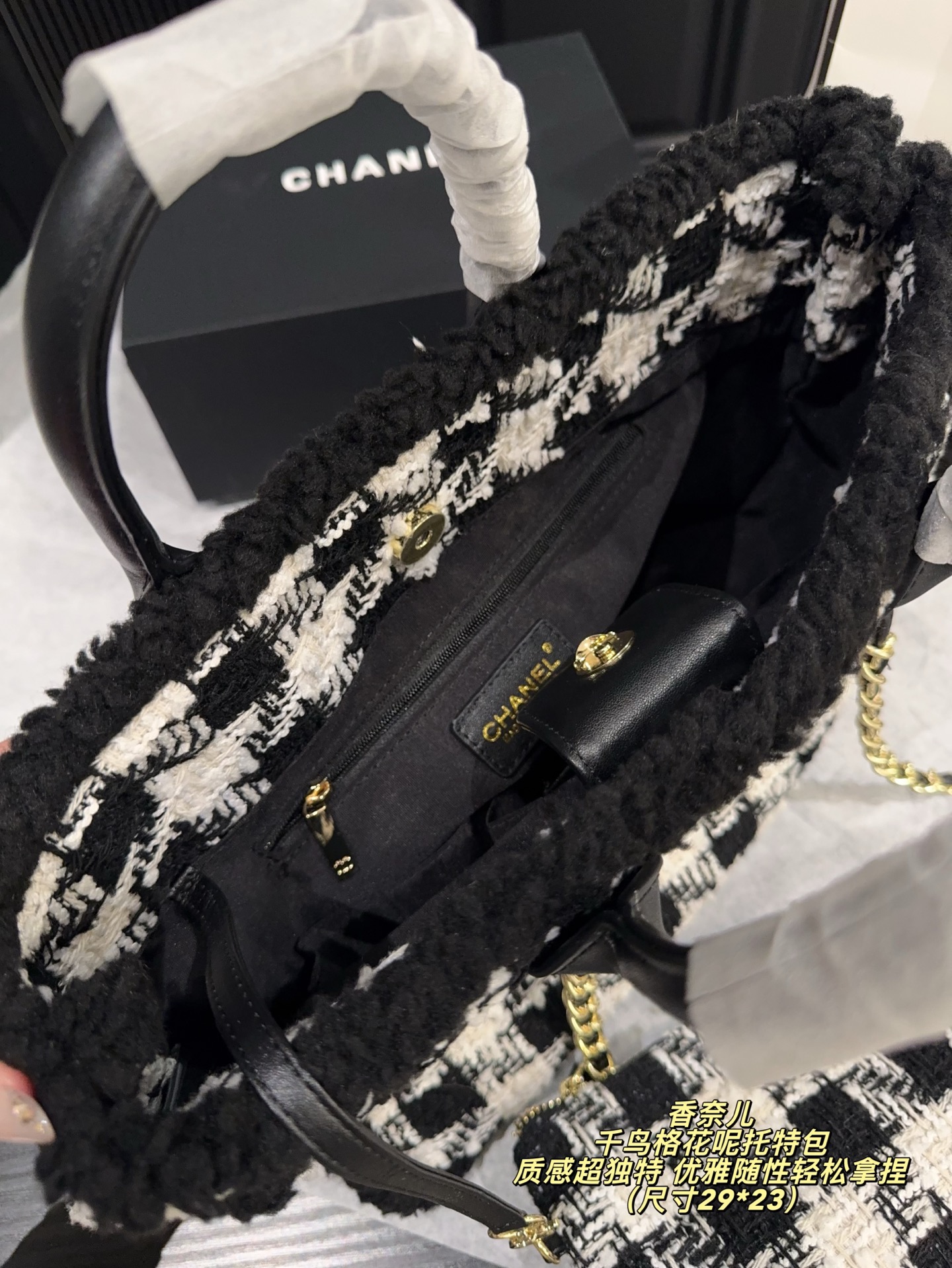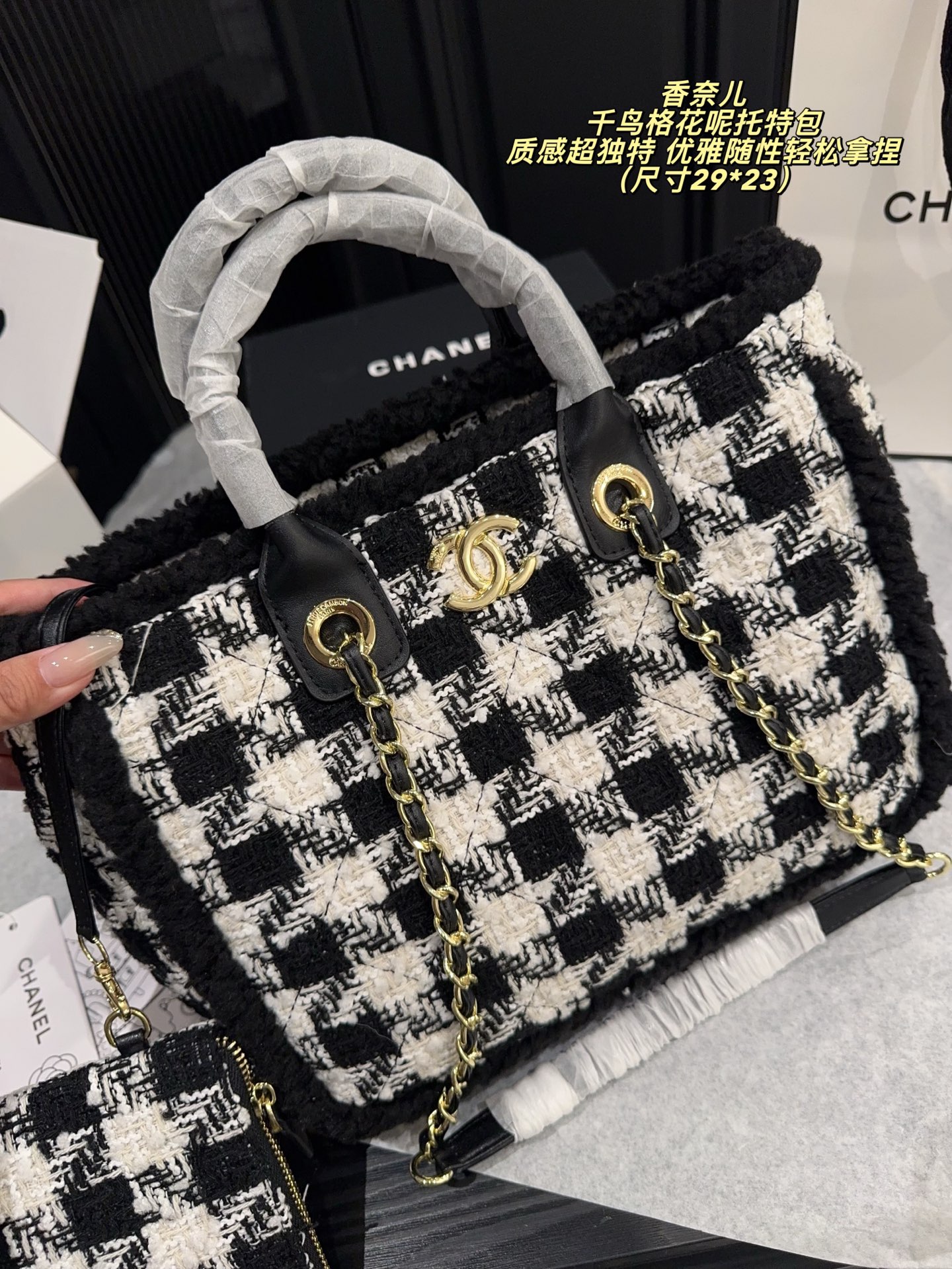 尺寸29 23 香奈儿 Chanel 千鸟格花呢托特包 经典黑白千乌格纹 粗粝猫毛呢 亮片点级 质感超独特 金属链条 皮革手柄 手提斜挎都OK 日常通勤 休闲出街都能轻松驾驭 内部空间超大 实用又时髦 是滑雪系列热门单品 秋冬搭配厚外套或毛衣 优雅随性轻松拿捏