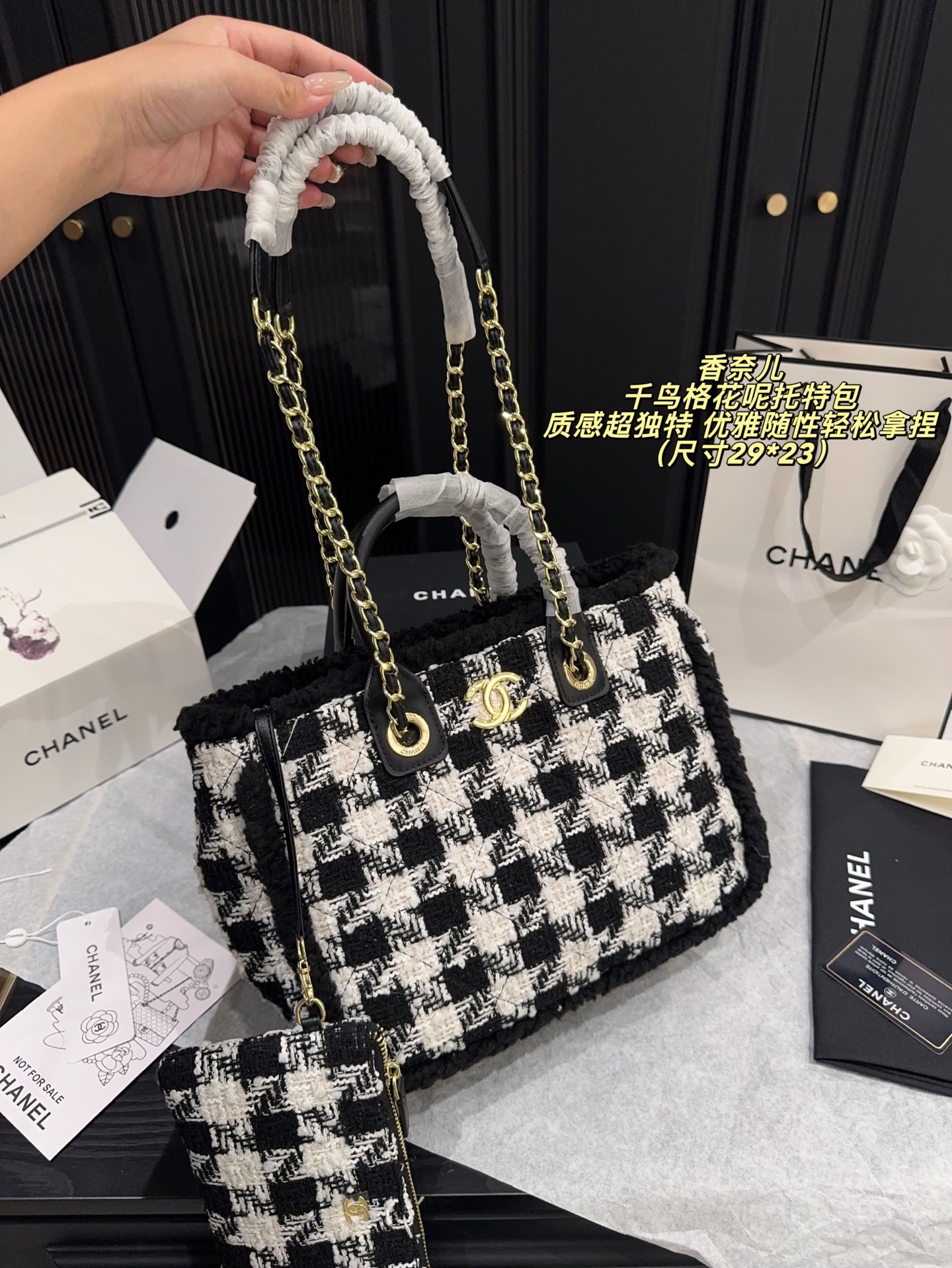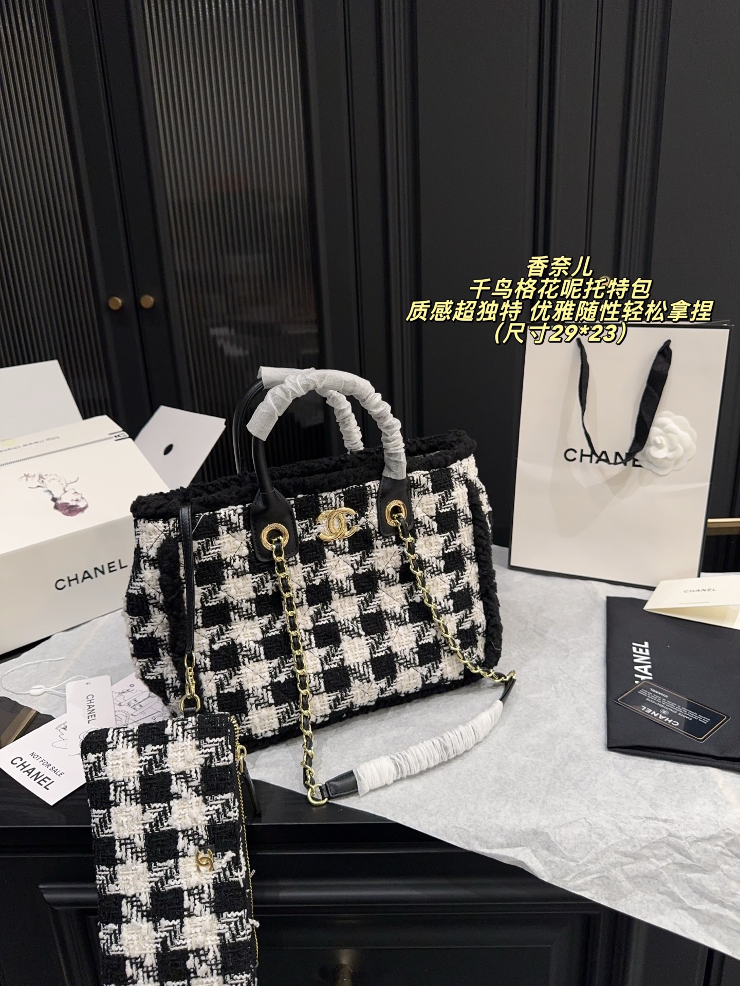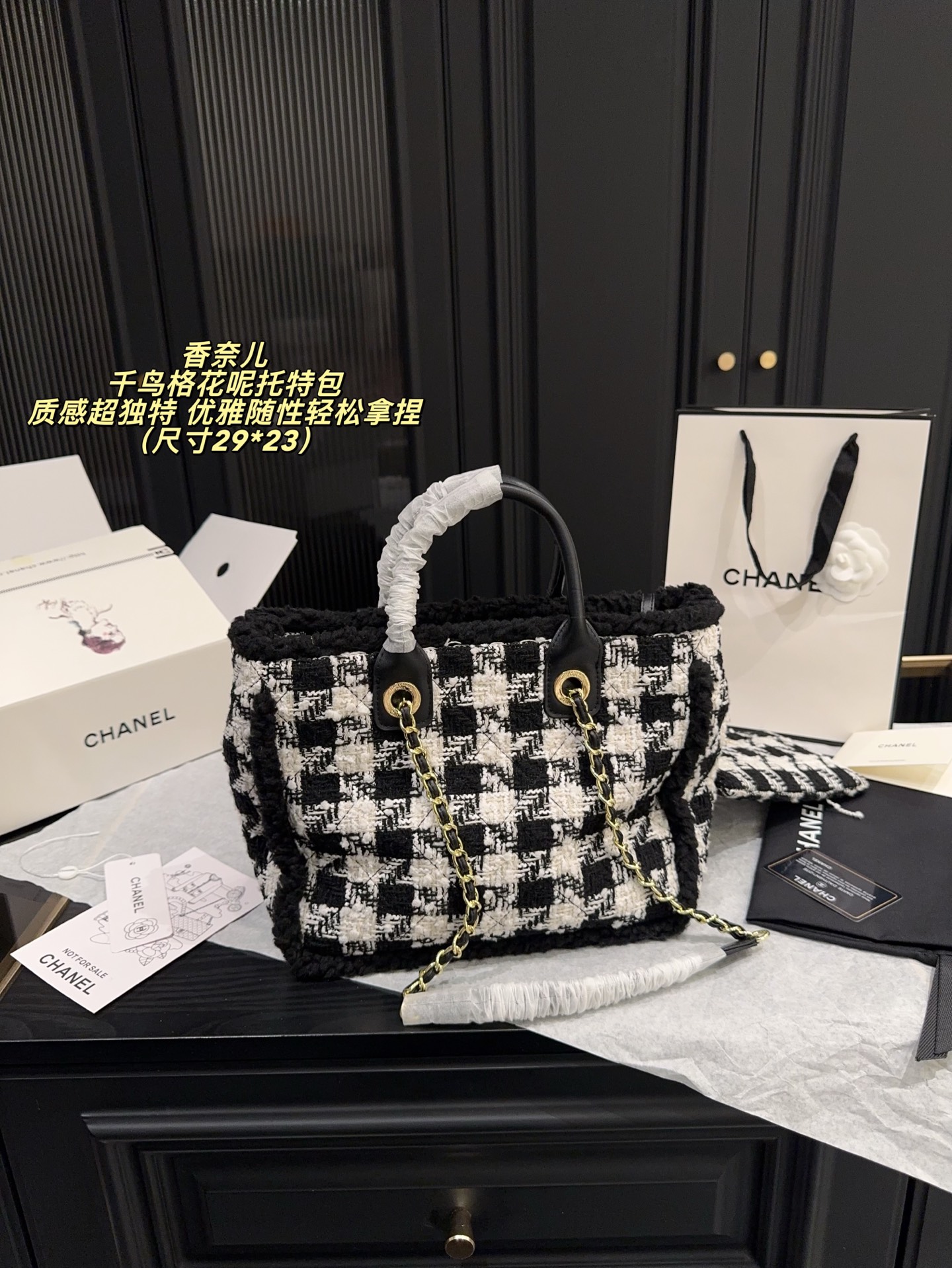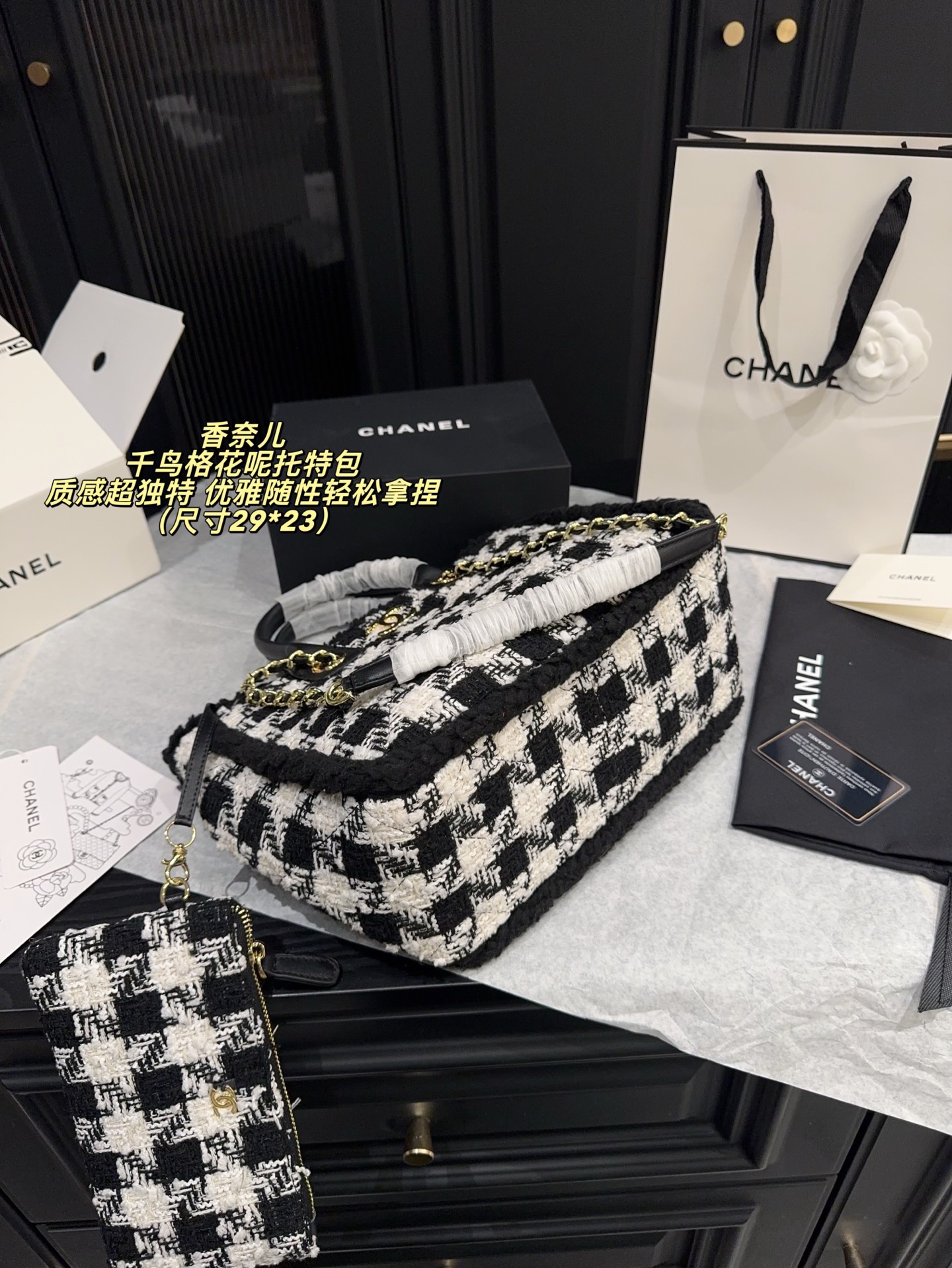 尺寸29 23 香奈儿 Chanel 千鸟格花呢托特包 经典黑白千乌格纹 粗粝猫毛呢 亮片点级 质感超独特 金属链条 皮革手柄 手提斜挎都OK 日常通勤 休闲出街都能轻松驾驭 内部空间超大 实用又时髦 是滑雪系列热门单品 秋冬搭配厚外套或毛衣 优雅随性轻松拿捏