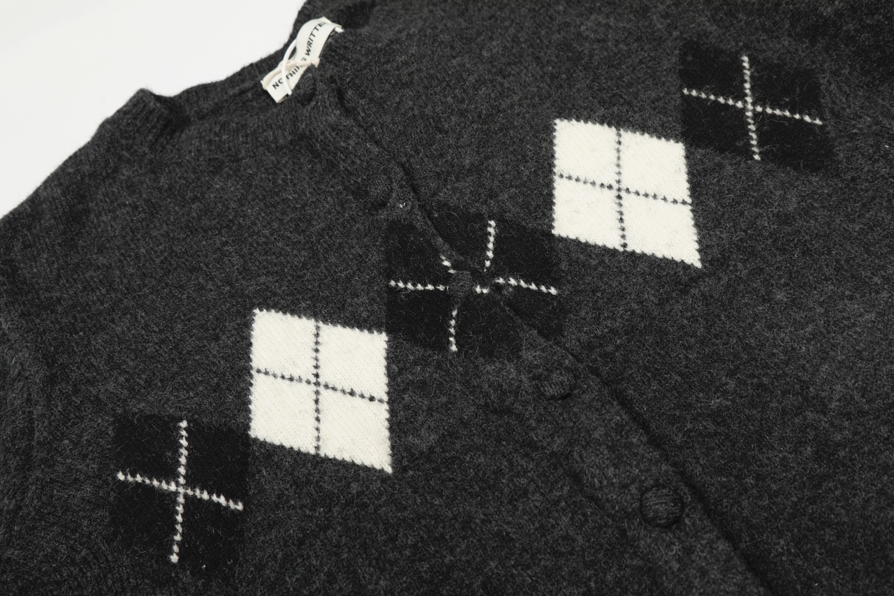 韩国Nothing written新款复古撞色菱形格纹针织圆领针织衫毛衣开衫