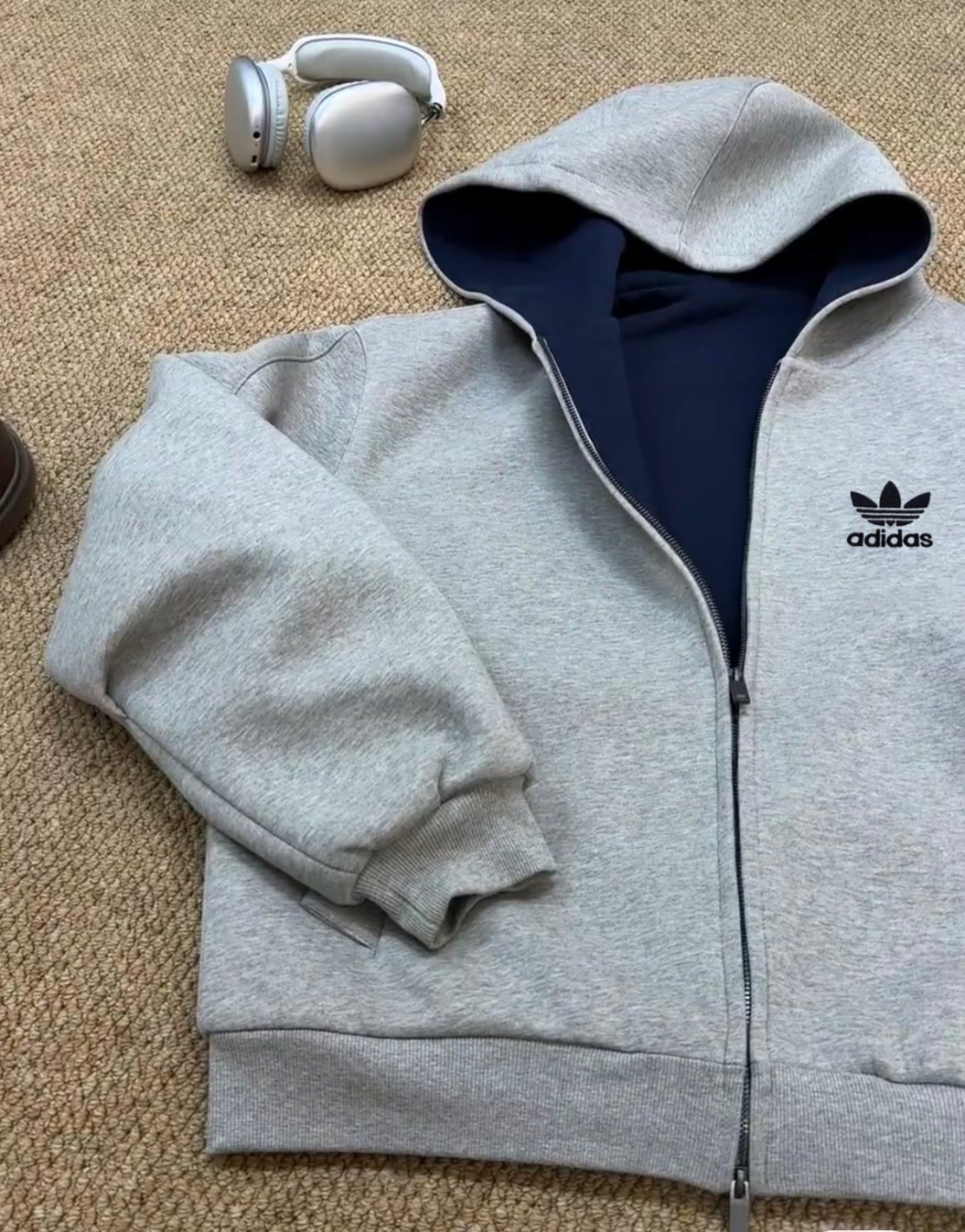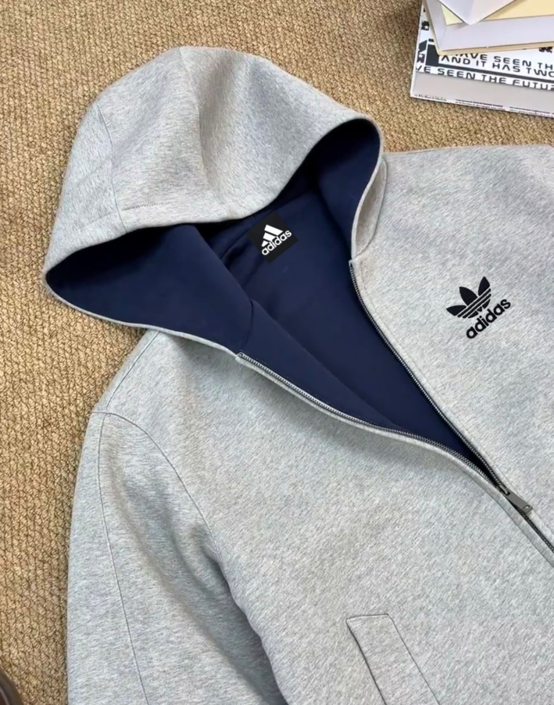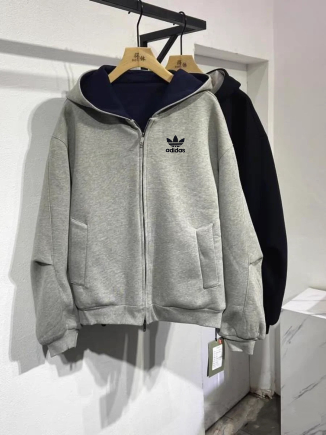 阿迪达斯Adidas重磅灰色内青外灰拼色帽子美式落肩拼接卫衣男女同款连帽高街休闲连帽廓形落肩袖重磅设计感外套