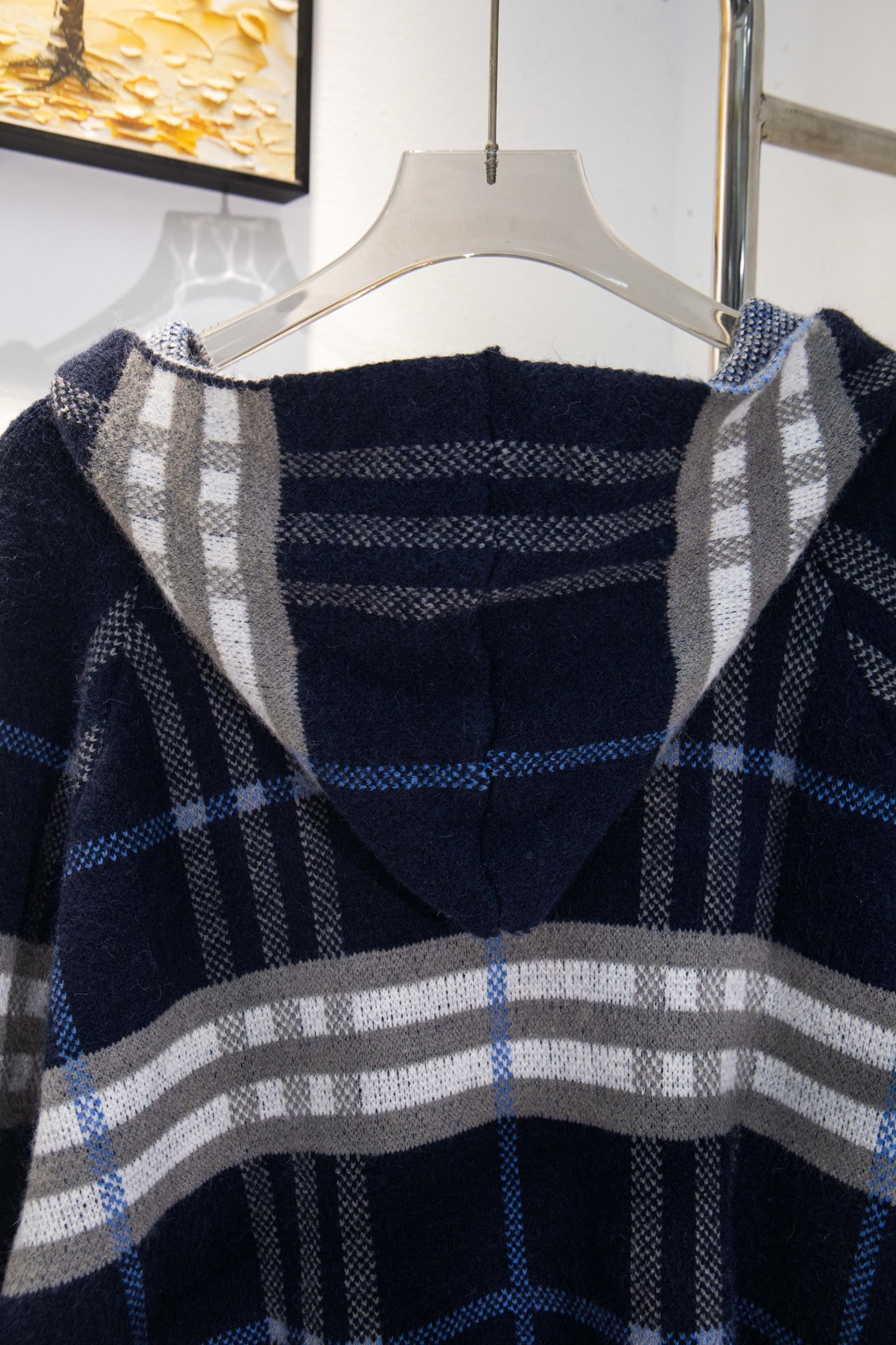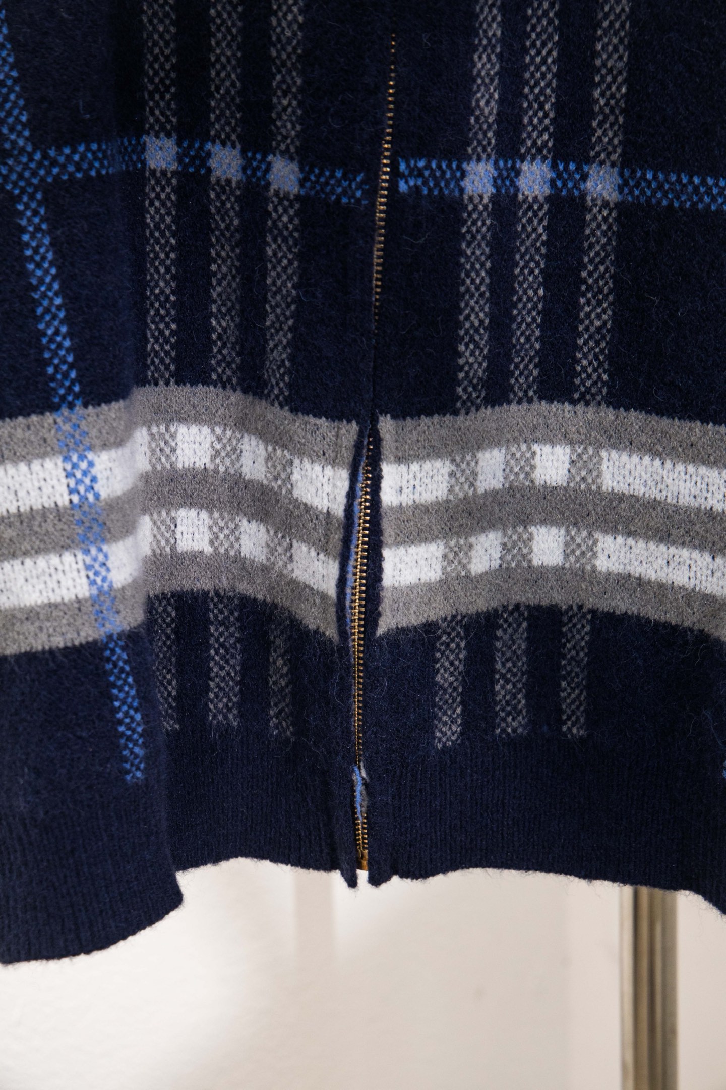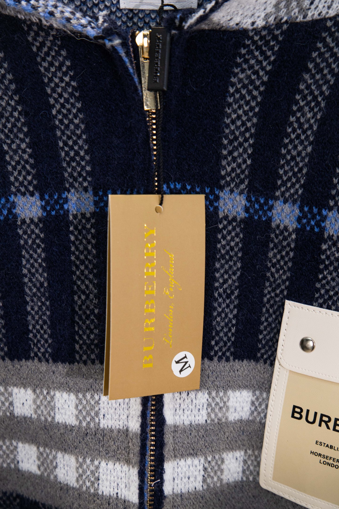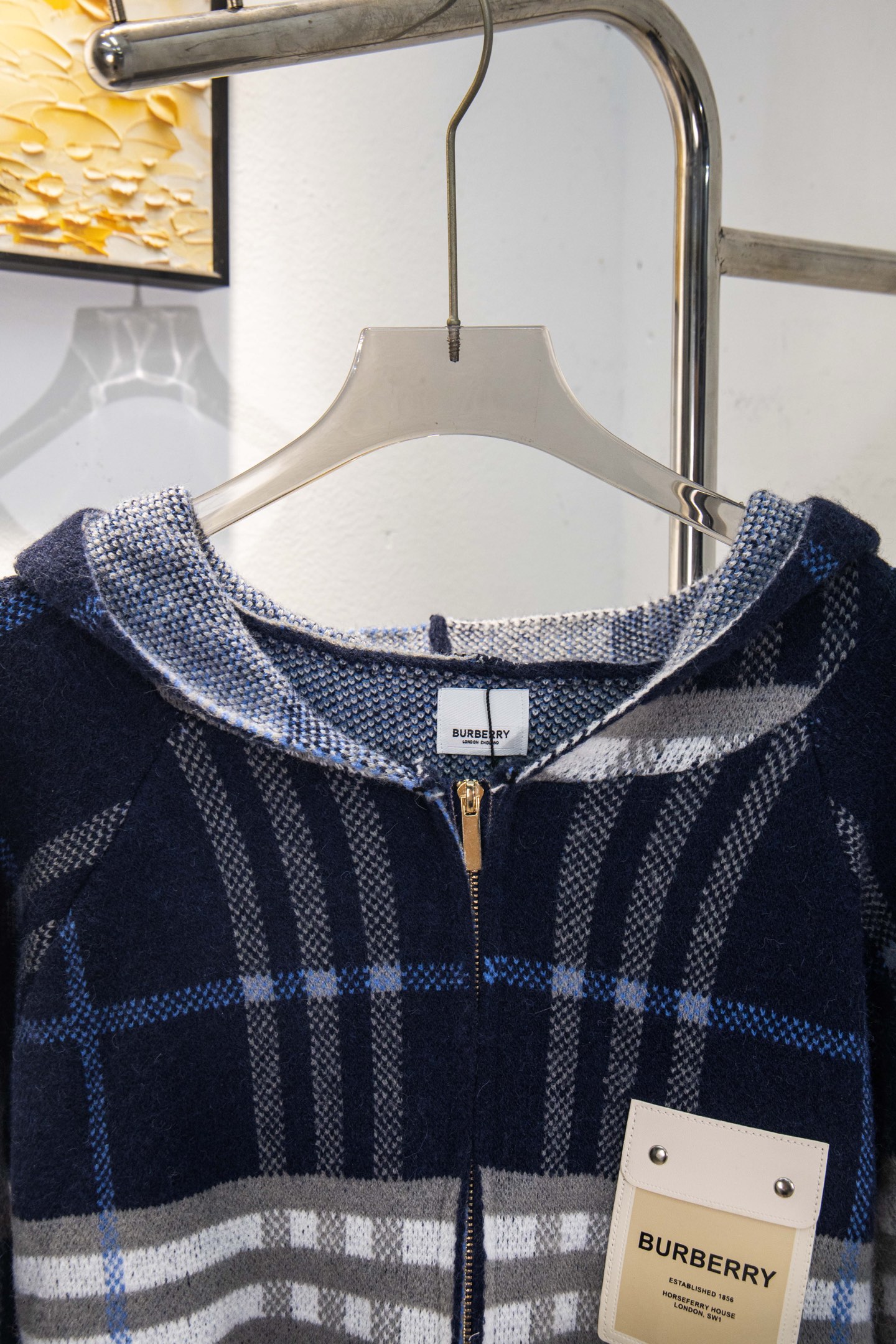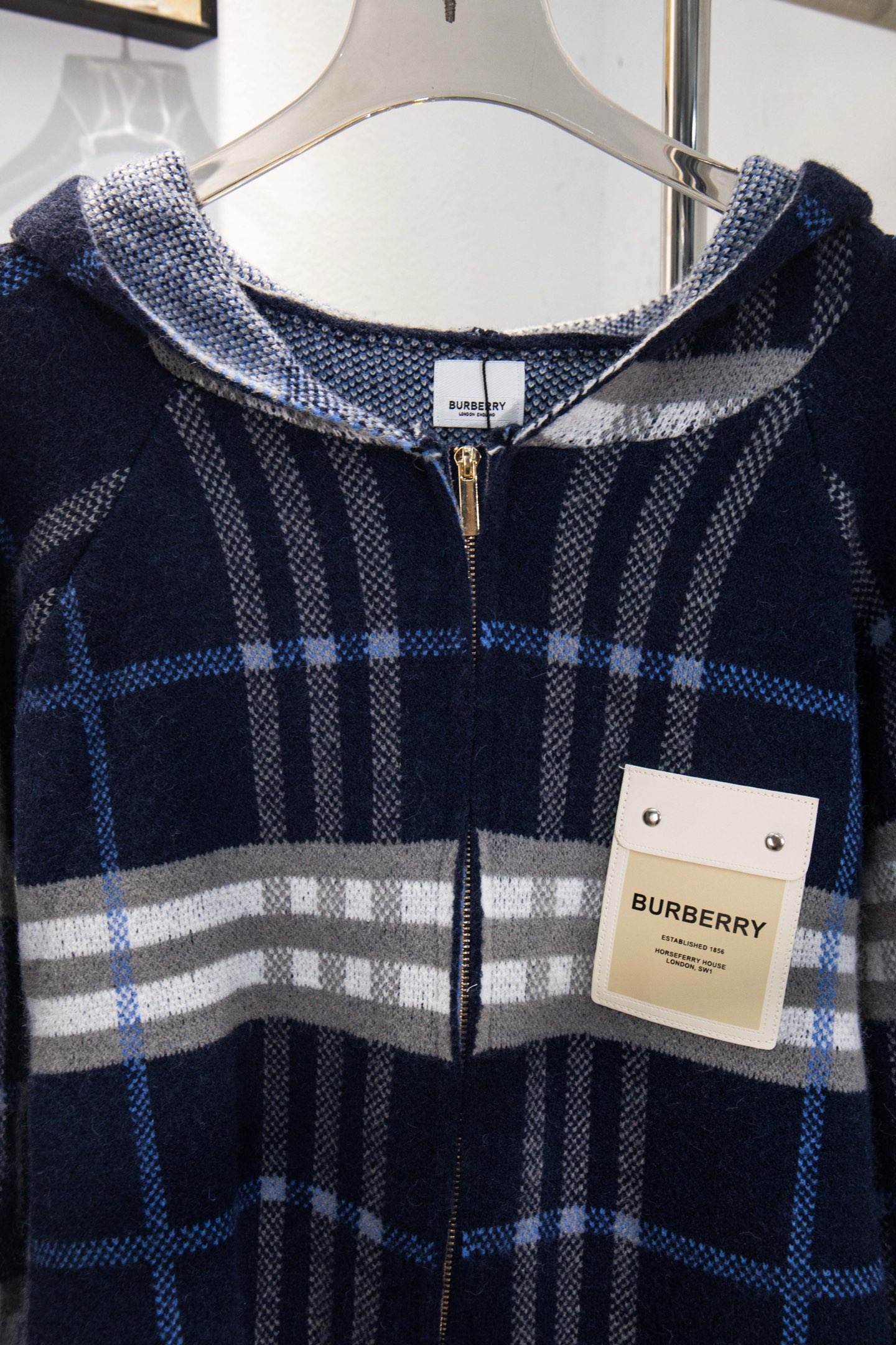 巴宝莉BURBERRY经典皮标拉链连帽蓝格子羊毛针织夹克外套 男女款