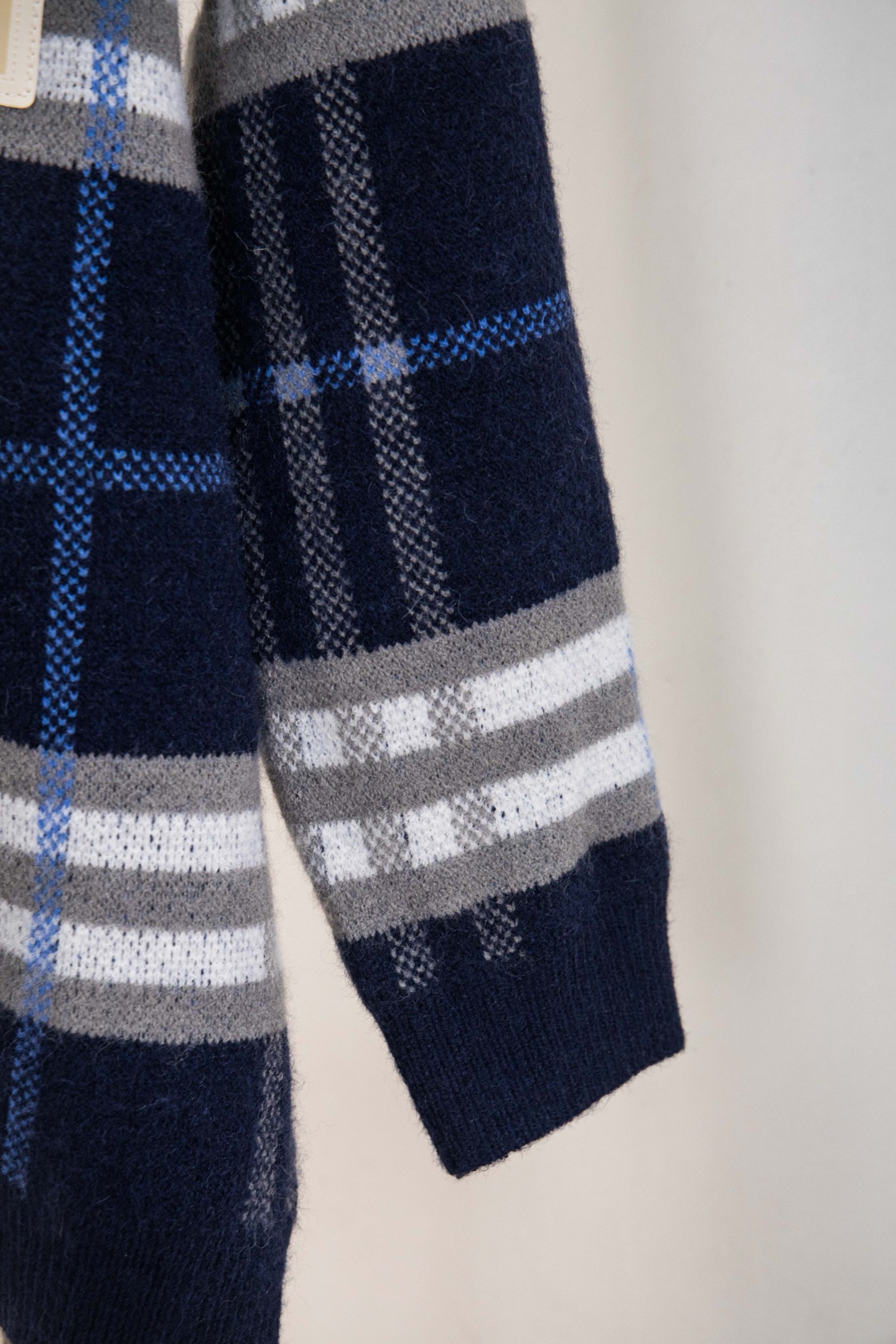 面料 25ss经典款巴宝莉羊毛针织外套 采用羊毛与马海毛的混纺面料 结合了羊毛的保暖性和透气性 以及马海毛的柔软光泽和弹性 使得夹克既舒适又时尚 胸前经典皮标装饰彰显了品牌的独特风格和历史传承