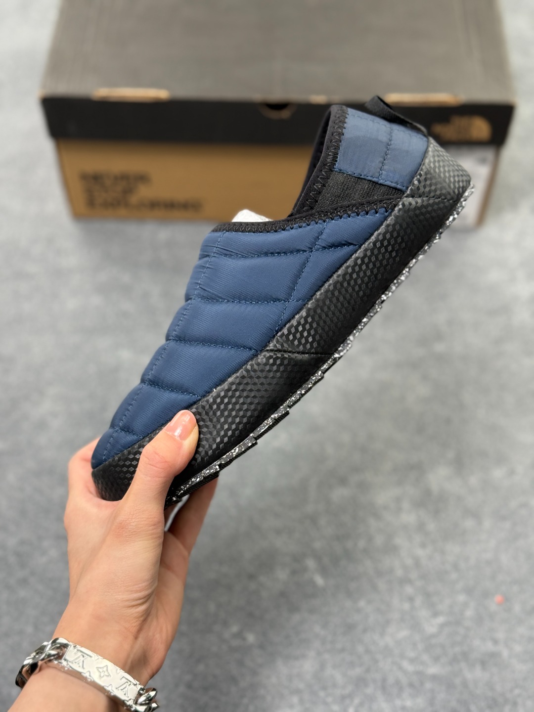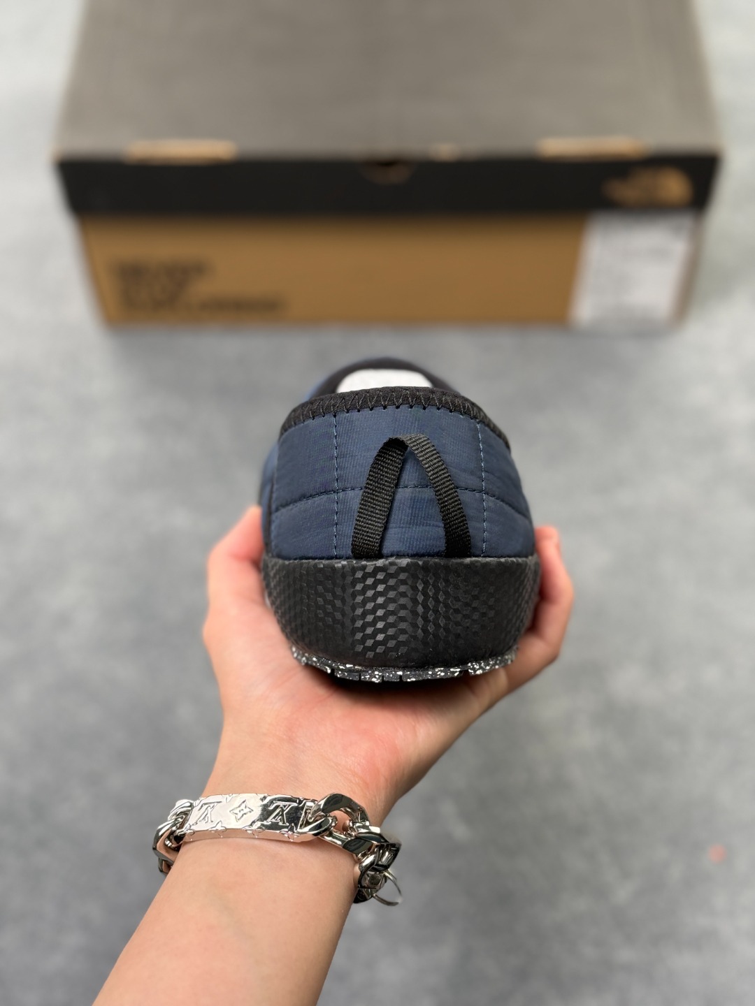 一脚蹬鞋口带滚边收口和弹力接片设计