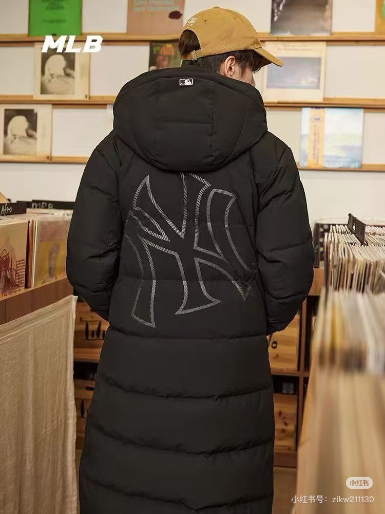 MLB NY专柜同步情侣长款连帽后背NY大标羽绒服 25冬季新品NY洋基队 后背大标镂空 长款连帽羽绒服