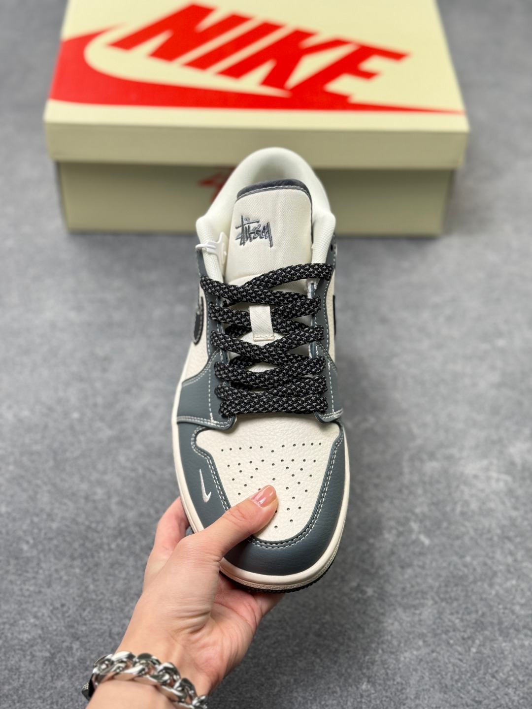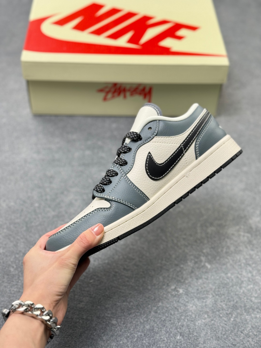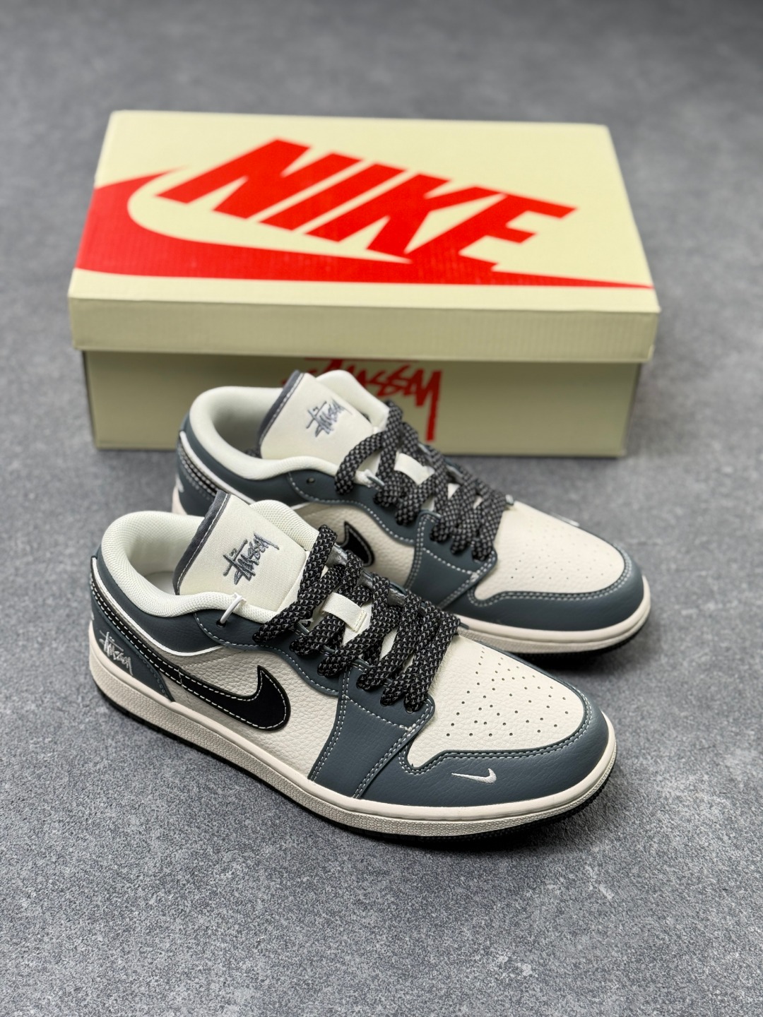 Nike Jordan Air Jordan 1 斯图西联名 蓝灰色 高端定制 低帮 复古 减震 防滑 耐磨 篮球鞋 定制鞋盒 大厂纯原品质出货 超高清洁度 皮料切割干净无任何毛边 细节完美