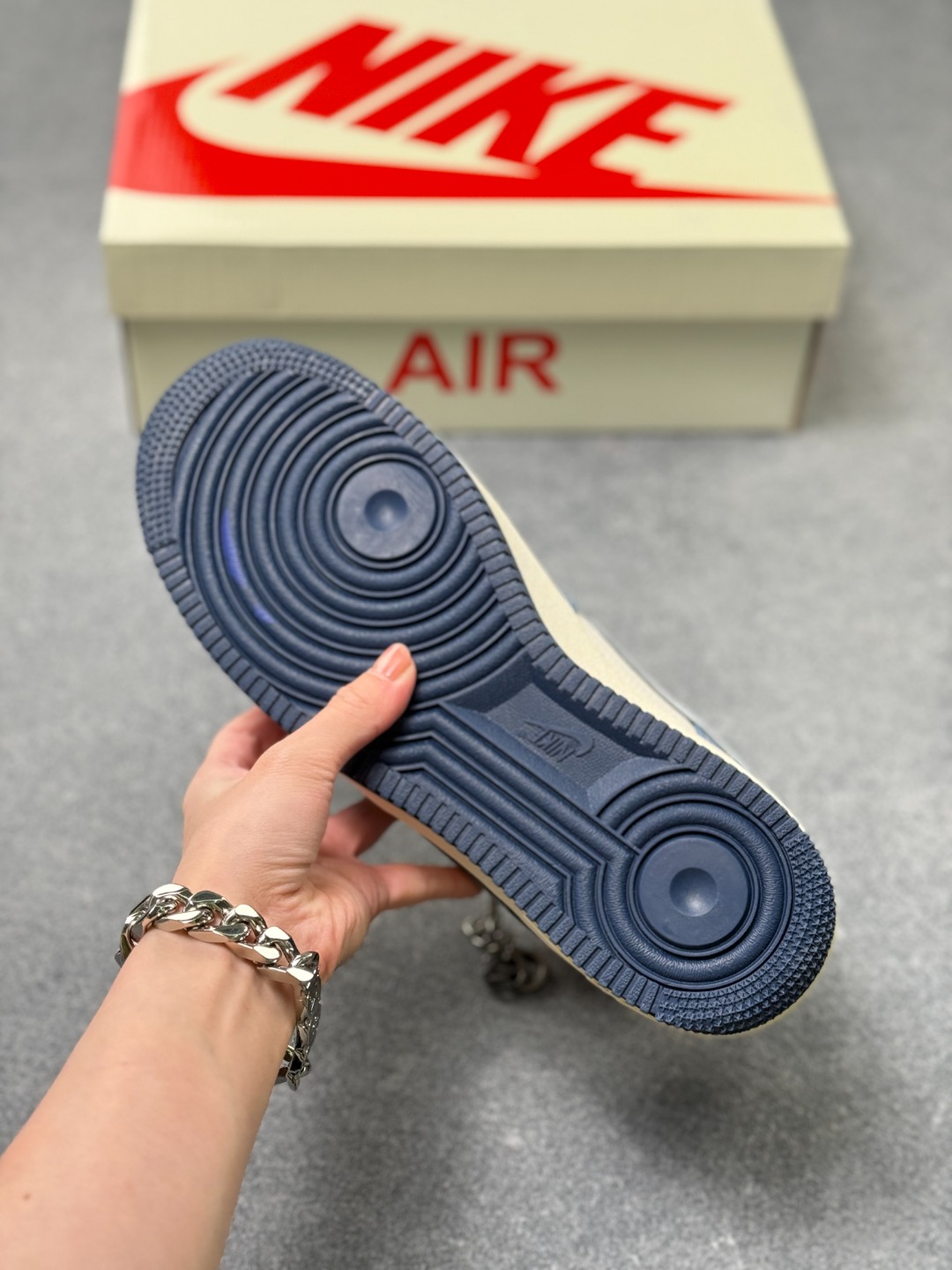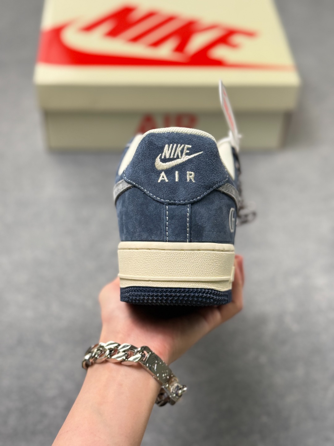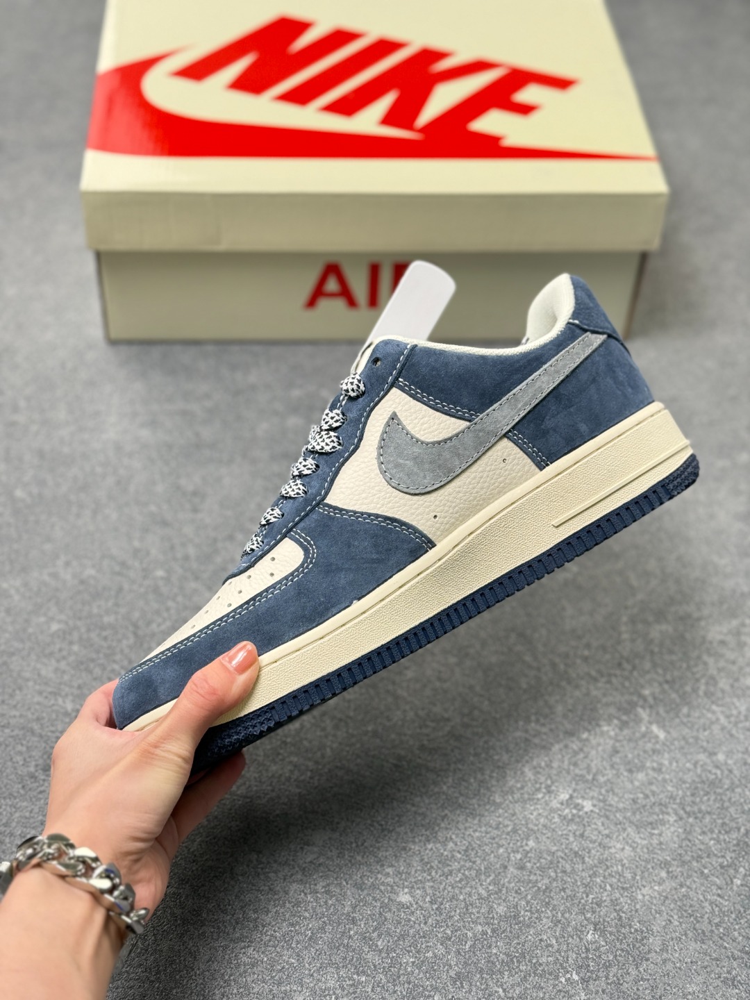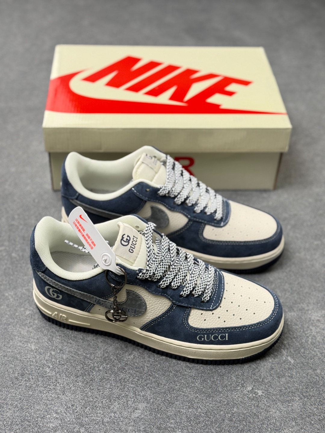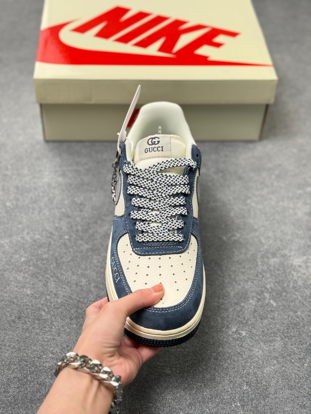 蓝调奢潮 AF1与Gucci的风格共鸣 藏青与米白的撞色拼接 让Nike Air Force 1 Low的街头经典 邂逅Gucci的意式奢雅 翻毛皮革的细腻质感包裹鞋身 灰色Swoosh上的GUCCI字母与双G标识 将联名的精致巧思悄然融入 鞋侧的双G浮雕 鞋头的GUCCI烫印 每一处细节都在打破街头与高奢的边界 作为经典款的焕新之作 XL1979 139既保留了Air Force 1标志性的气垫中底与利落鞋型 又以Gucci的奢牌基因赋予其全新格调 无论是搭配工装裤打造街头潮范 还是配休闲西装演绎雅痞风格 这双鞋都能成为造型的点睛之笔 既是鞋柜里的收藏级尖货 也是出街吸睛的实力单品